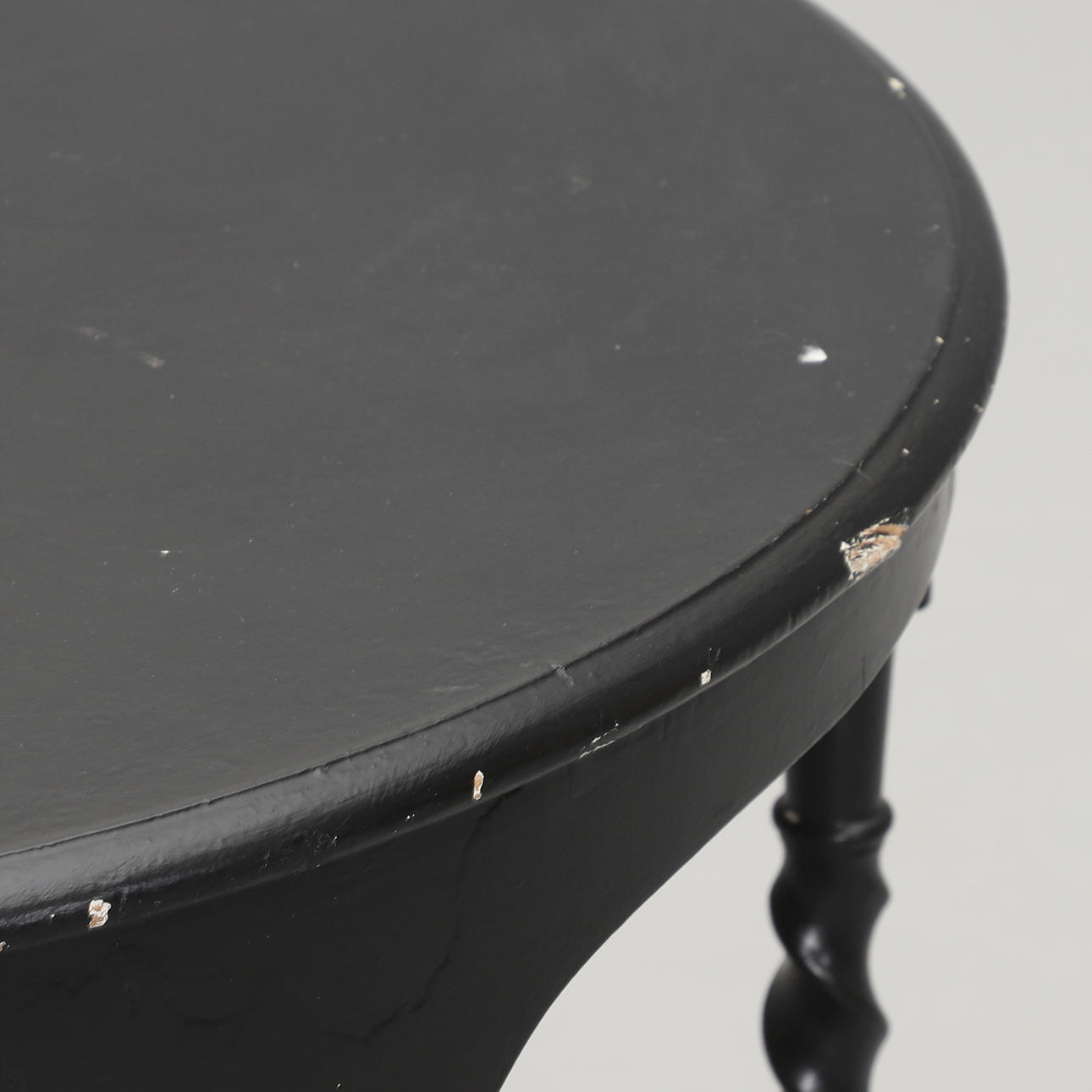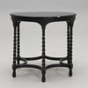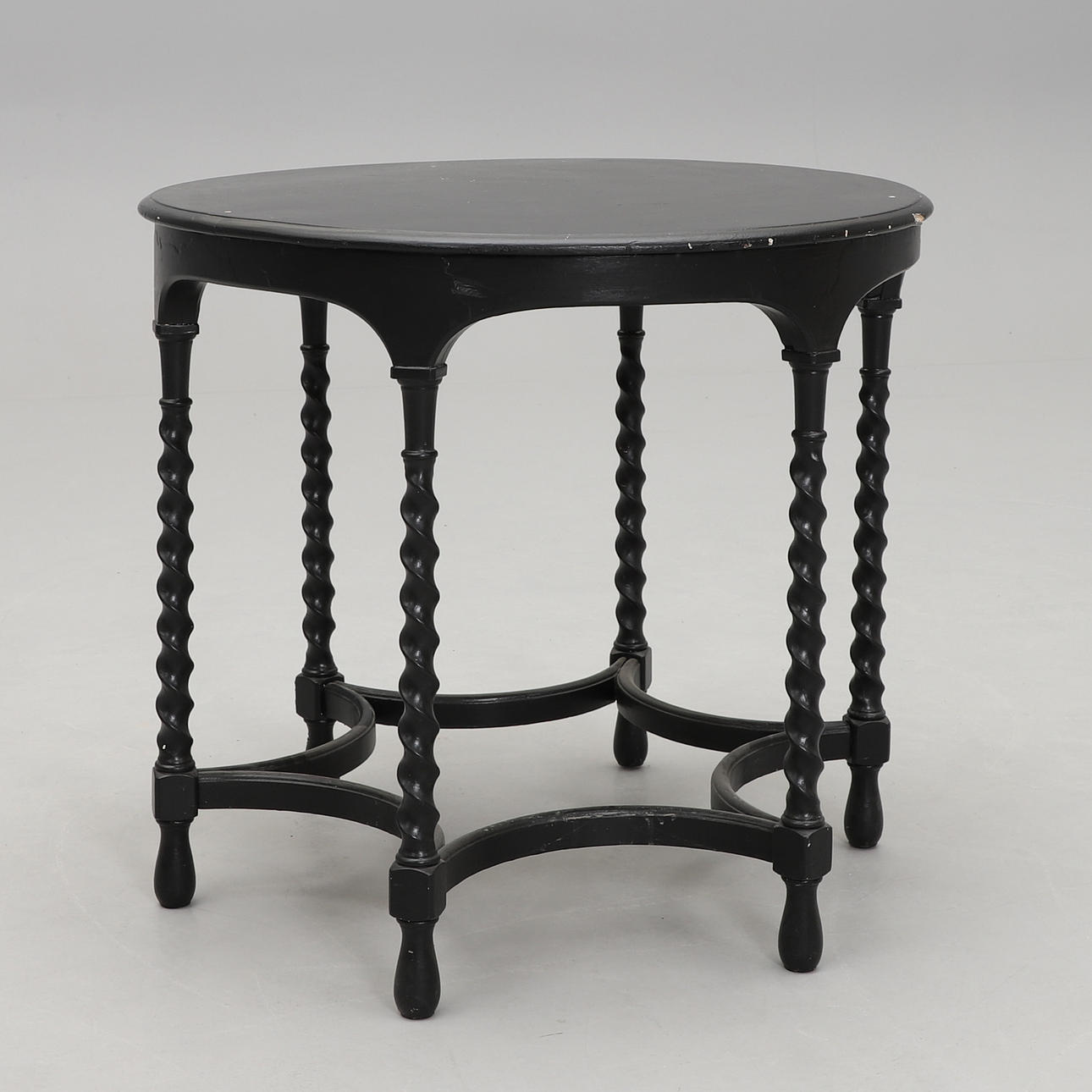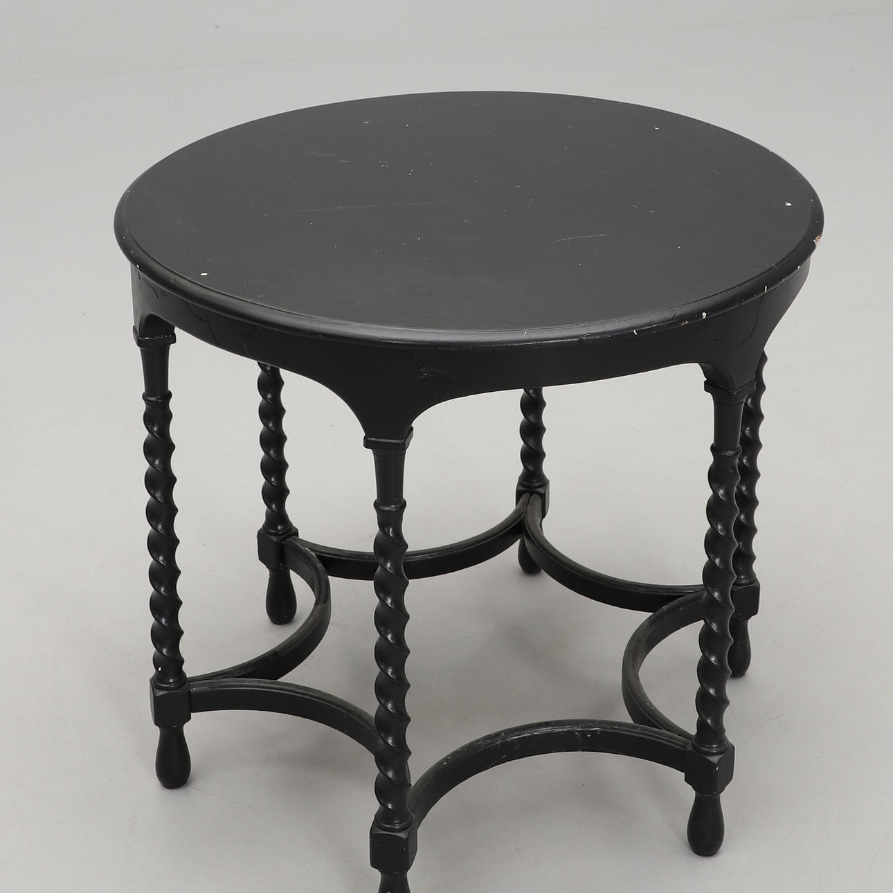 Svartmålat träbord med sex svarvade och kopplade ben. Mått: diameter 75, höjd 68 cm.