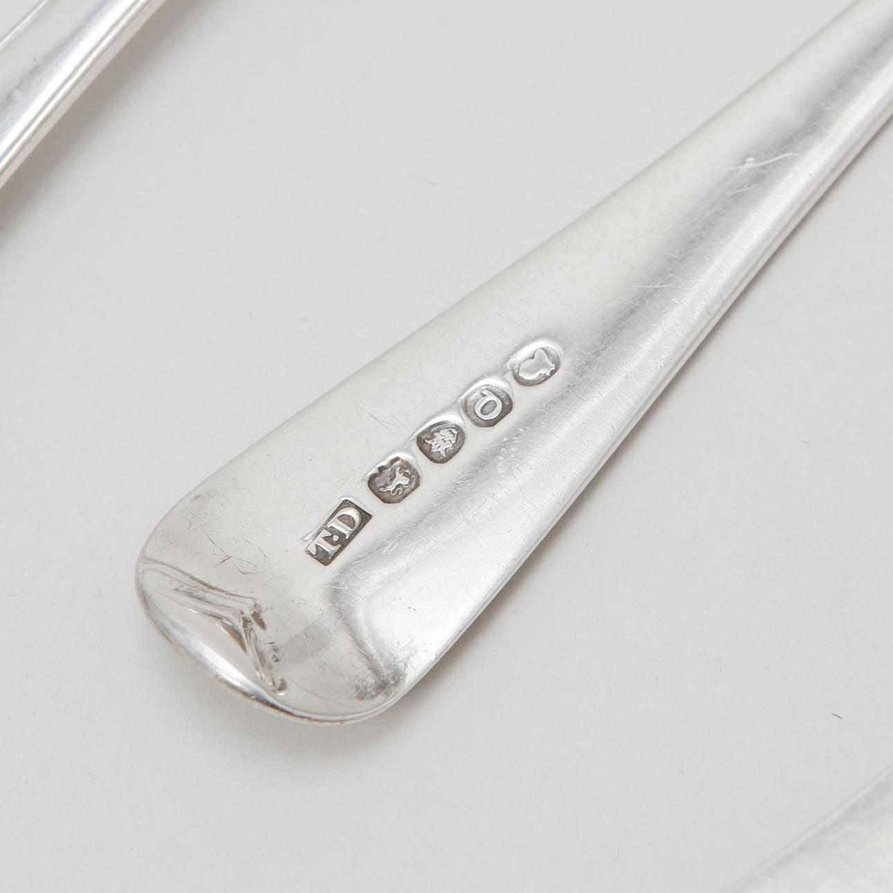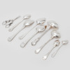 6 skedar. Blandade modeller och storlekar, bla 1800-tal. Längd 13 - 22 cm fruktsax, längd 13 cm 2 soppslevar, längd 18 - 20 cm.