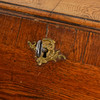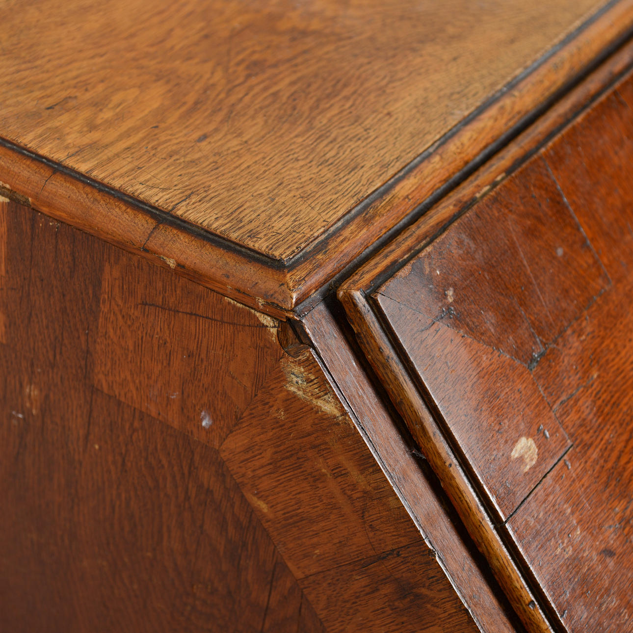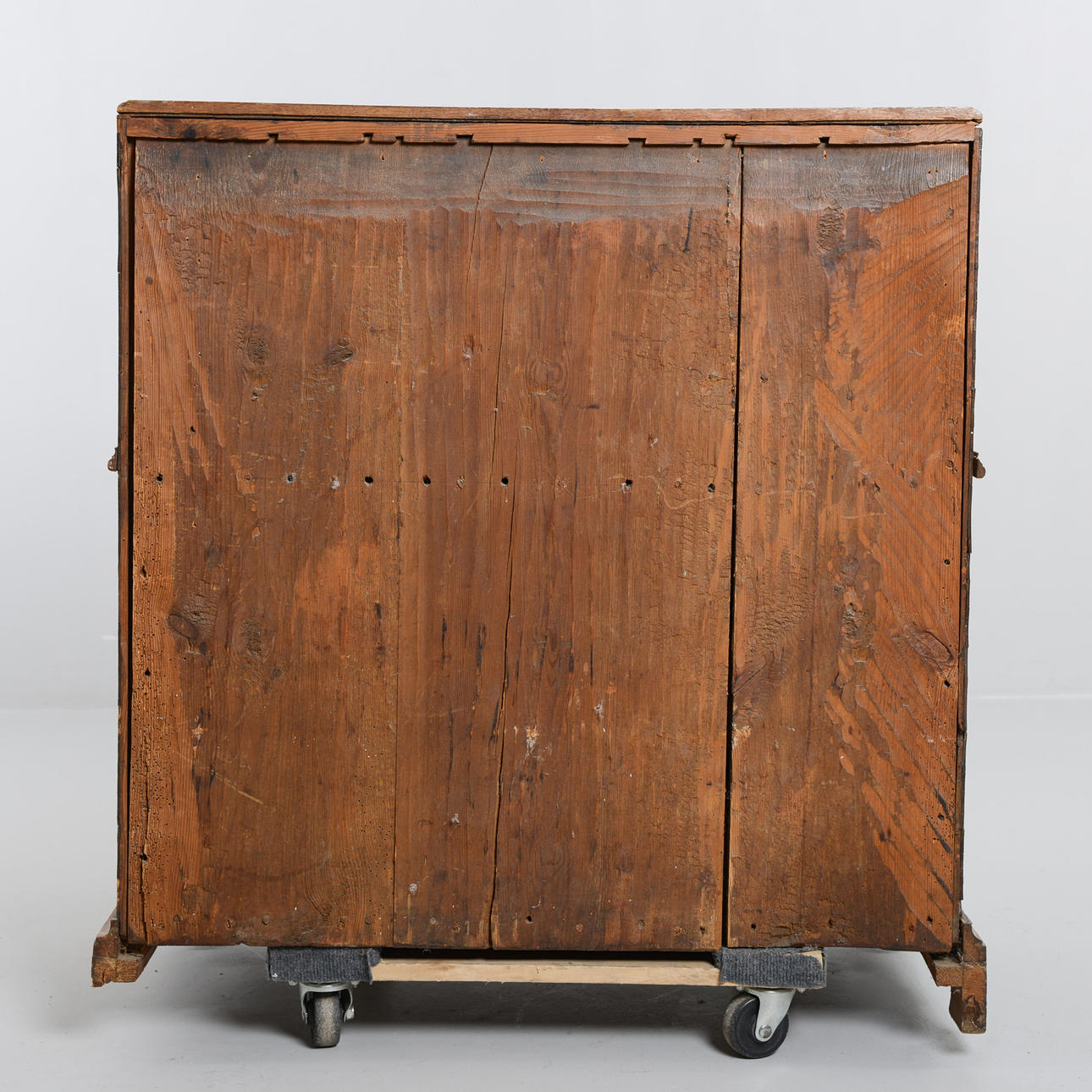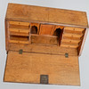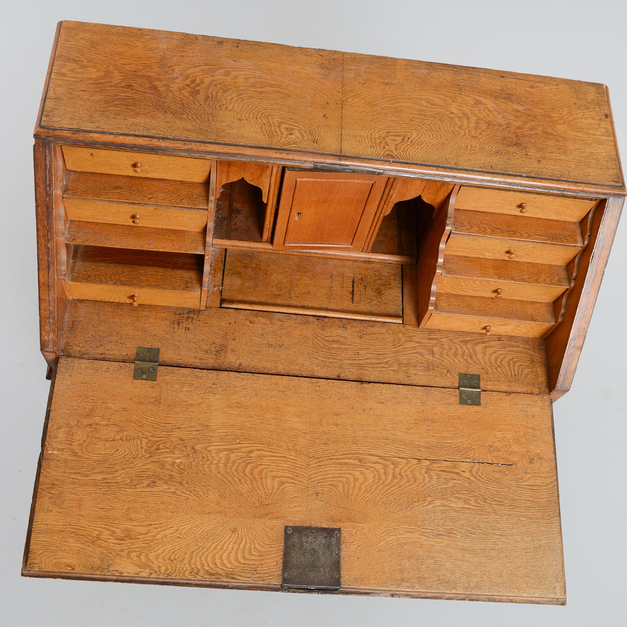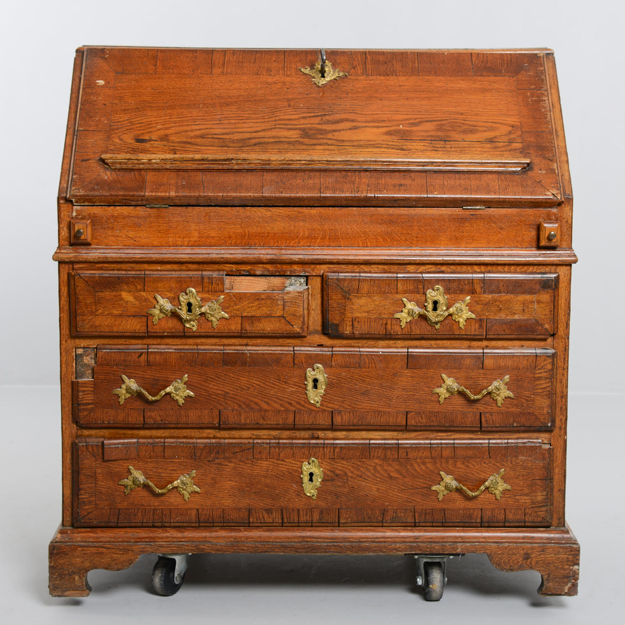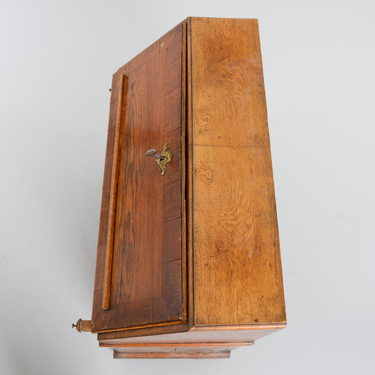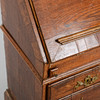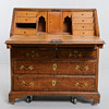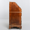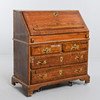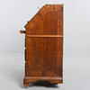 Underdel med tre utdragbara lådor. Överdel med skrivklaff med utdragbara lådor. Höjd 150 cm. Bredd 105 cm. Djup 50 cm. Nycklar finns.