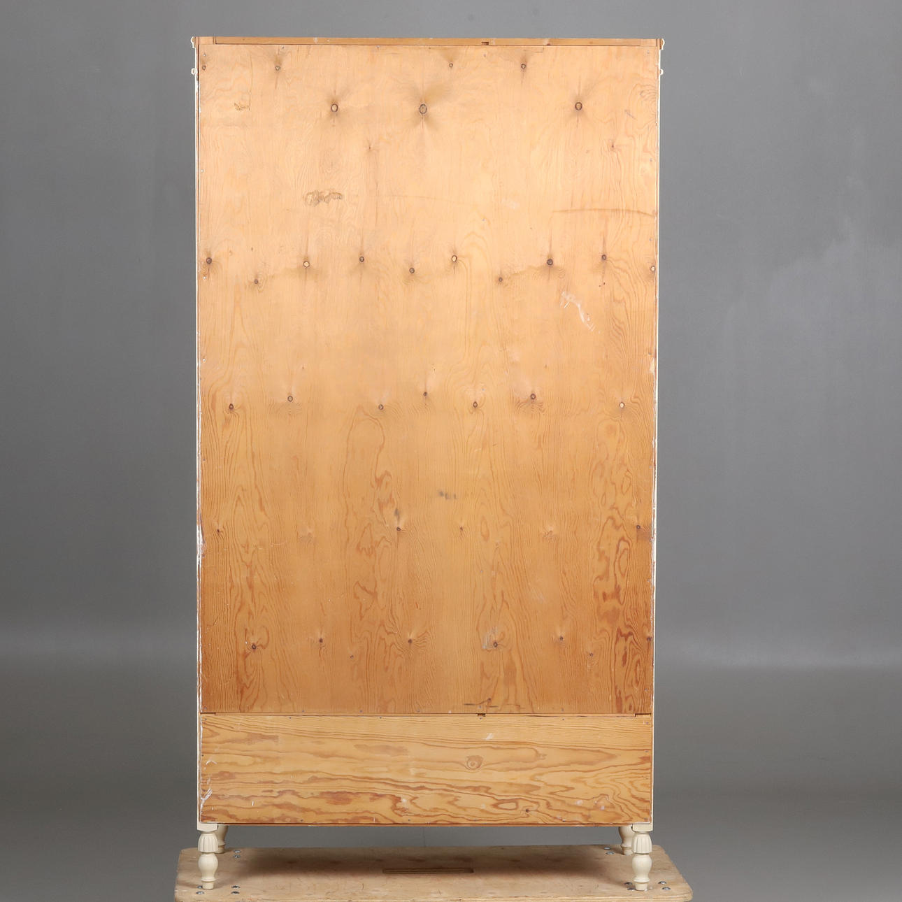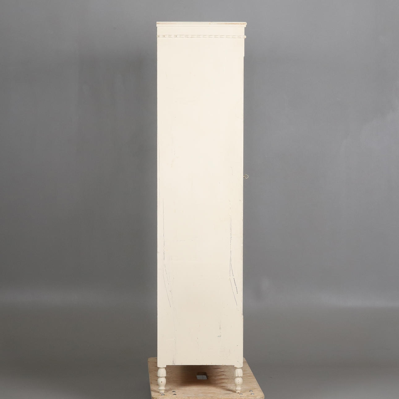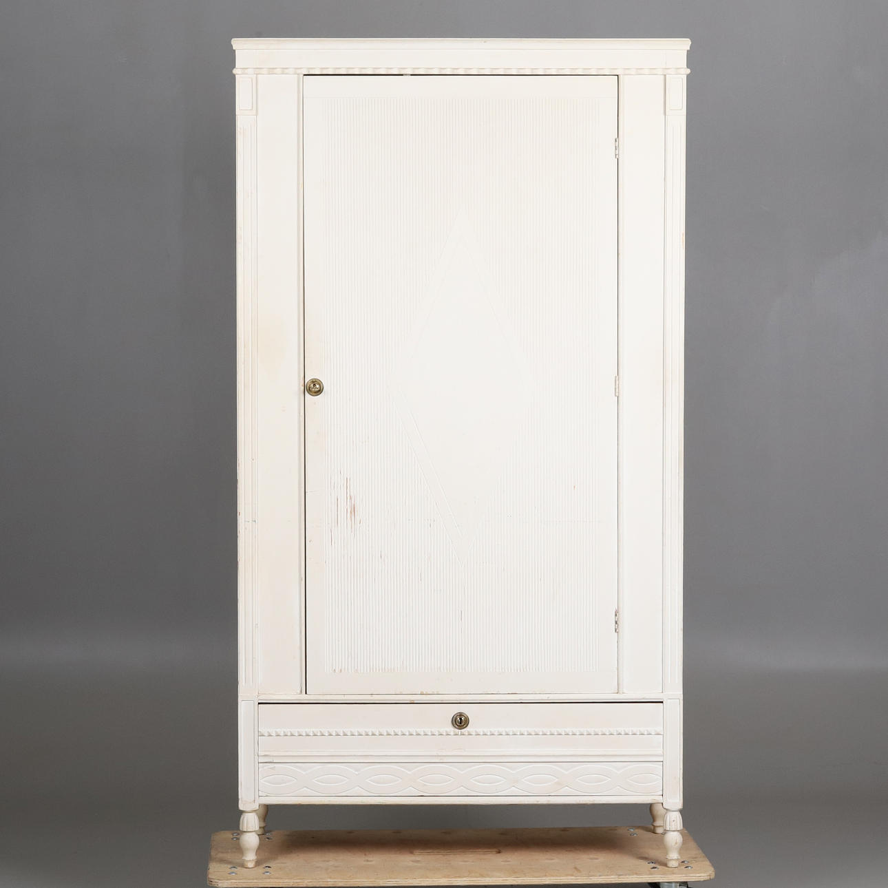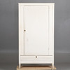 Klädskåp med bakomliggande hyllor och underlåda. Dörr med spegel på insida.