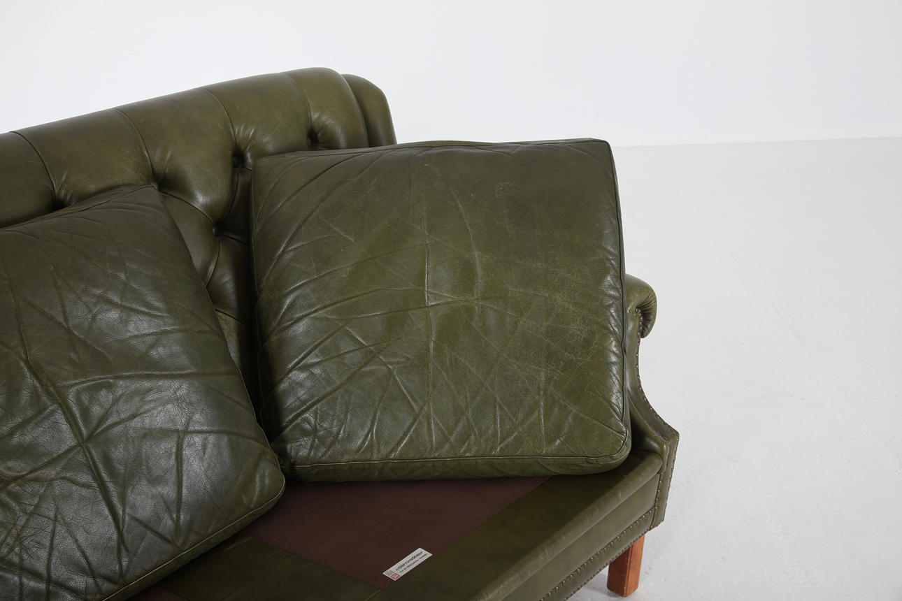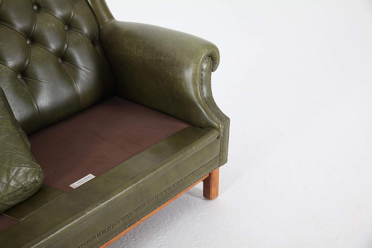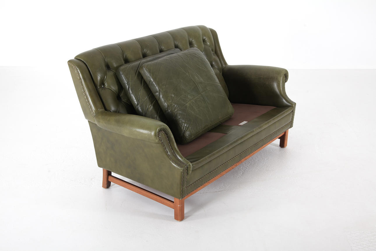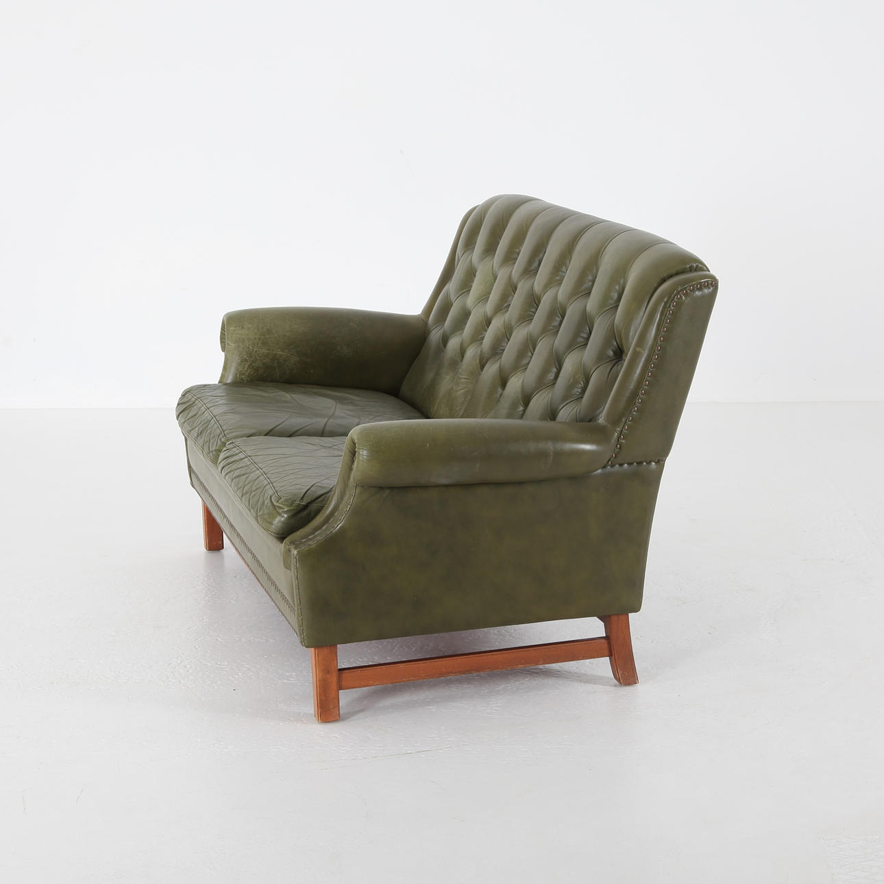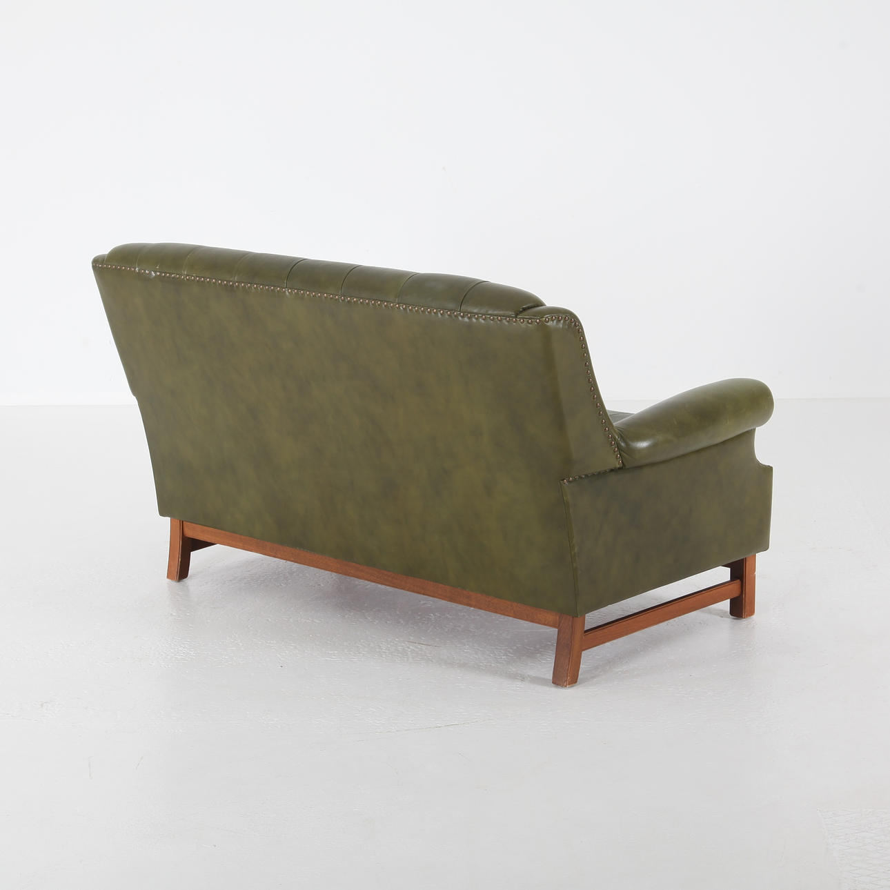 Skinnsoffa, helklädd, lösa dynor med dragkedja. Benställning i bonat lövträ. Omkring 1960.