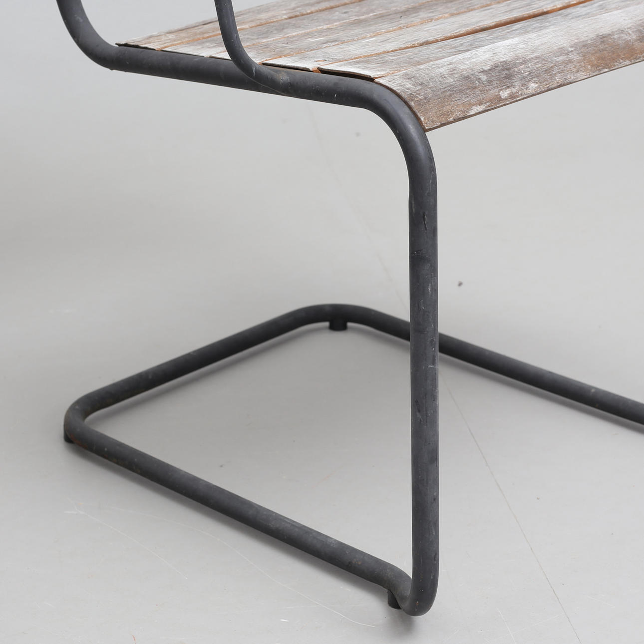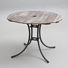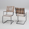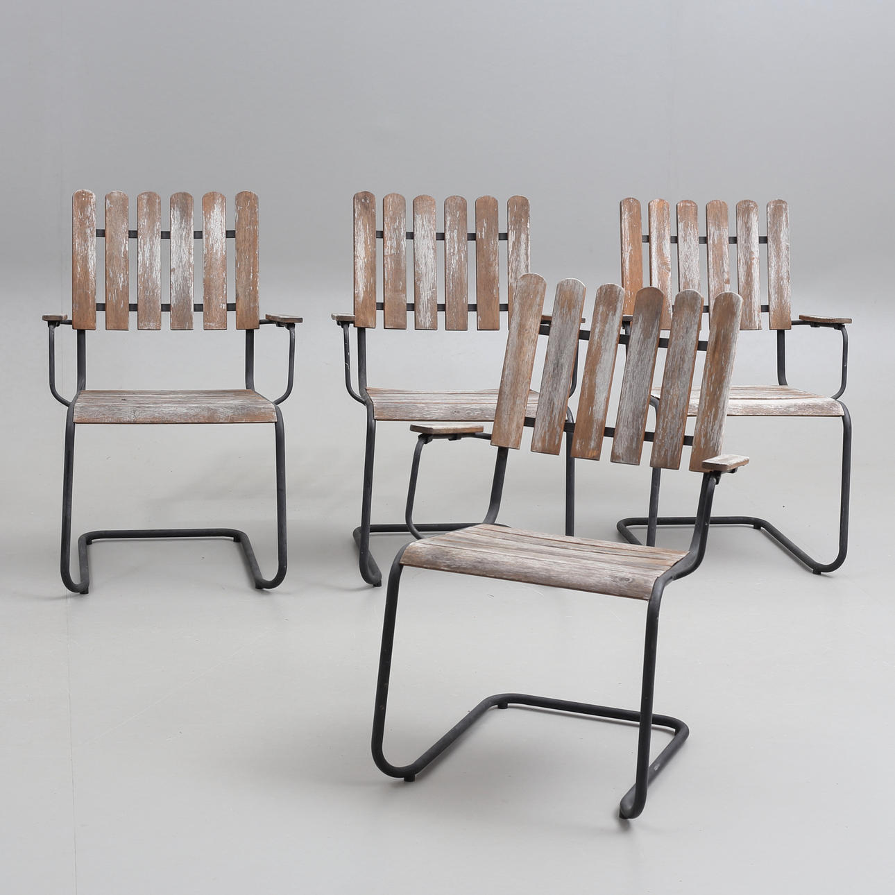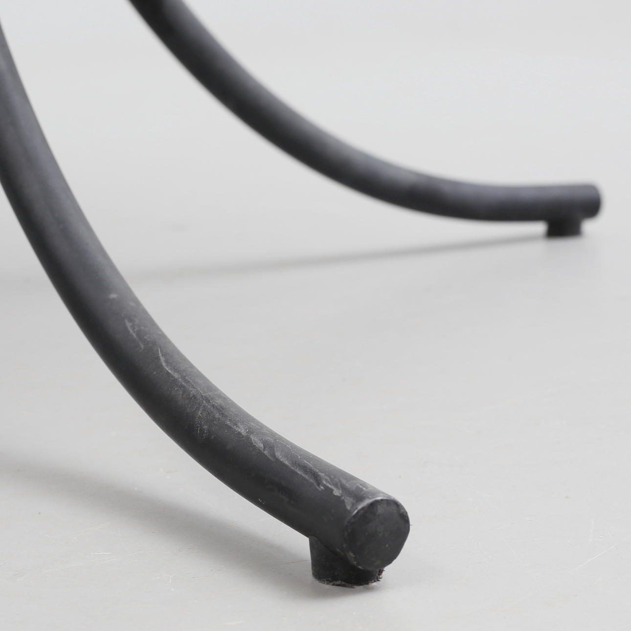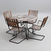 4 stolar med gungfunktion, rygghöjd ca 91 cm, sitthöjd ca 43 cm, bredd ca 63 cm, Bord, höjd ca 75 cm, diameter ca 103.