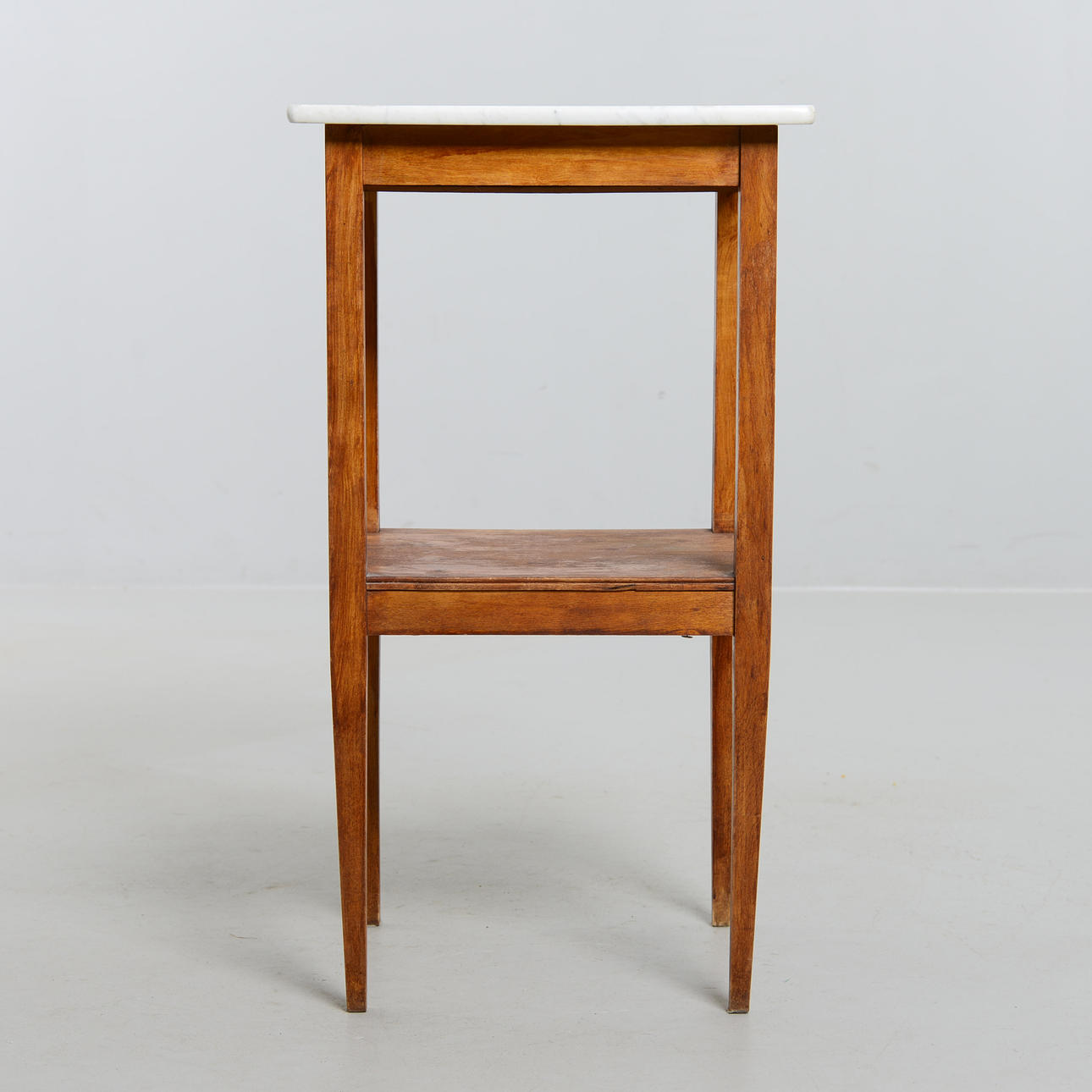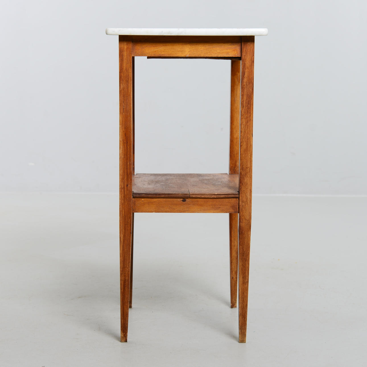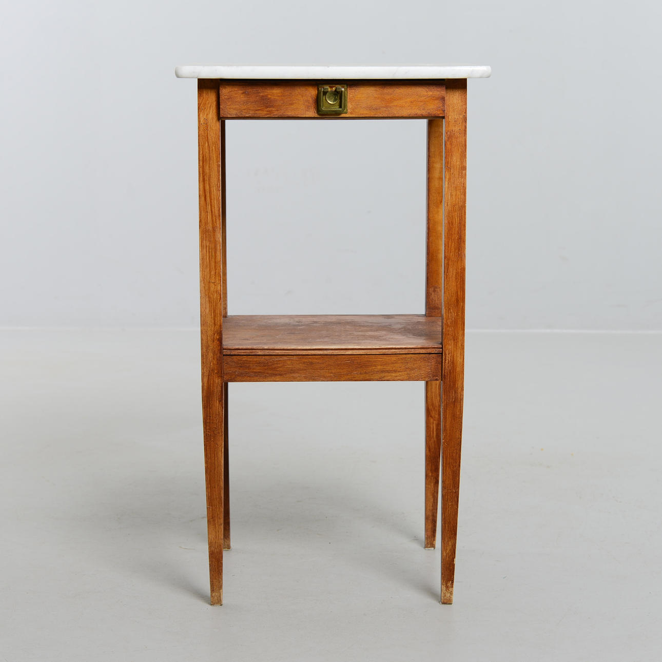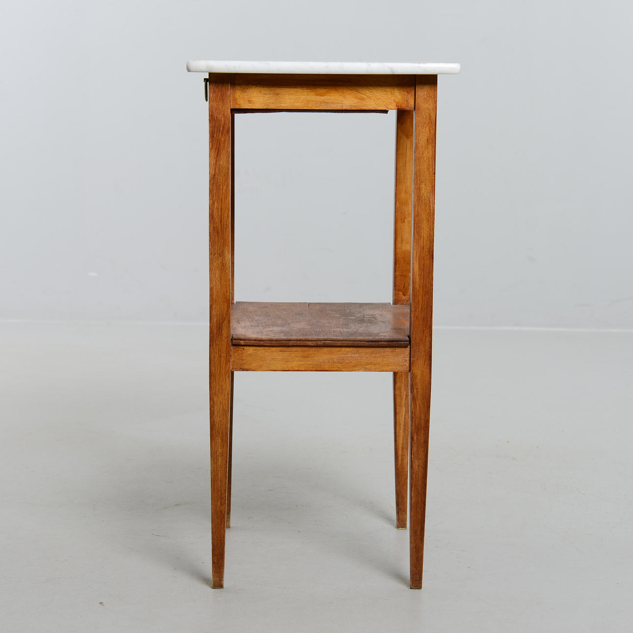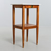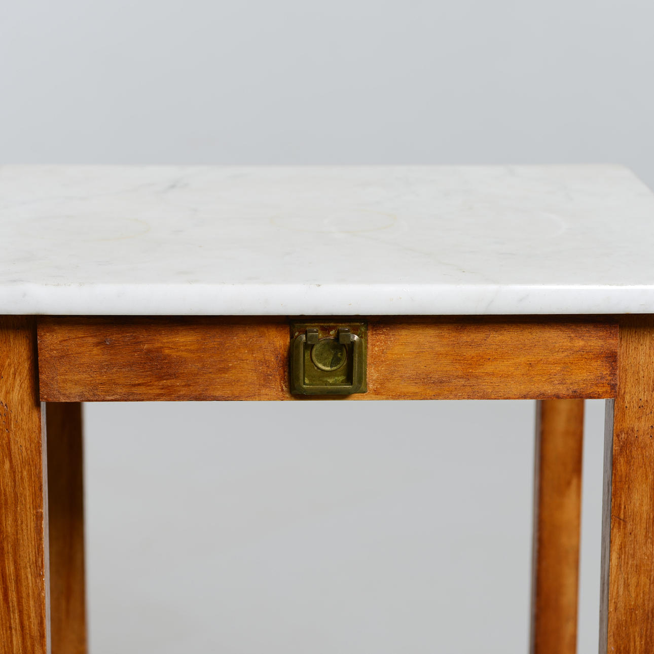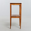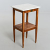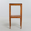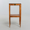 Björk och marmorskiva. Med utdragbar låda. Höjd 76 cm. Toppskivans mått 43 x 38 cm.