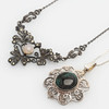 2 broscher med markasiter. 1 hänge/brosch med filigran. 1 collier med markasiter. 1 hänge med kedja, filigran. Vikt 44 gram.
