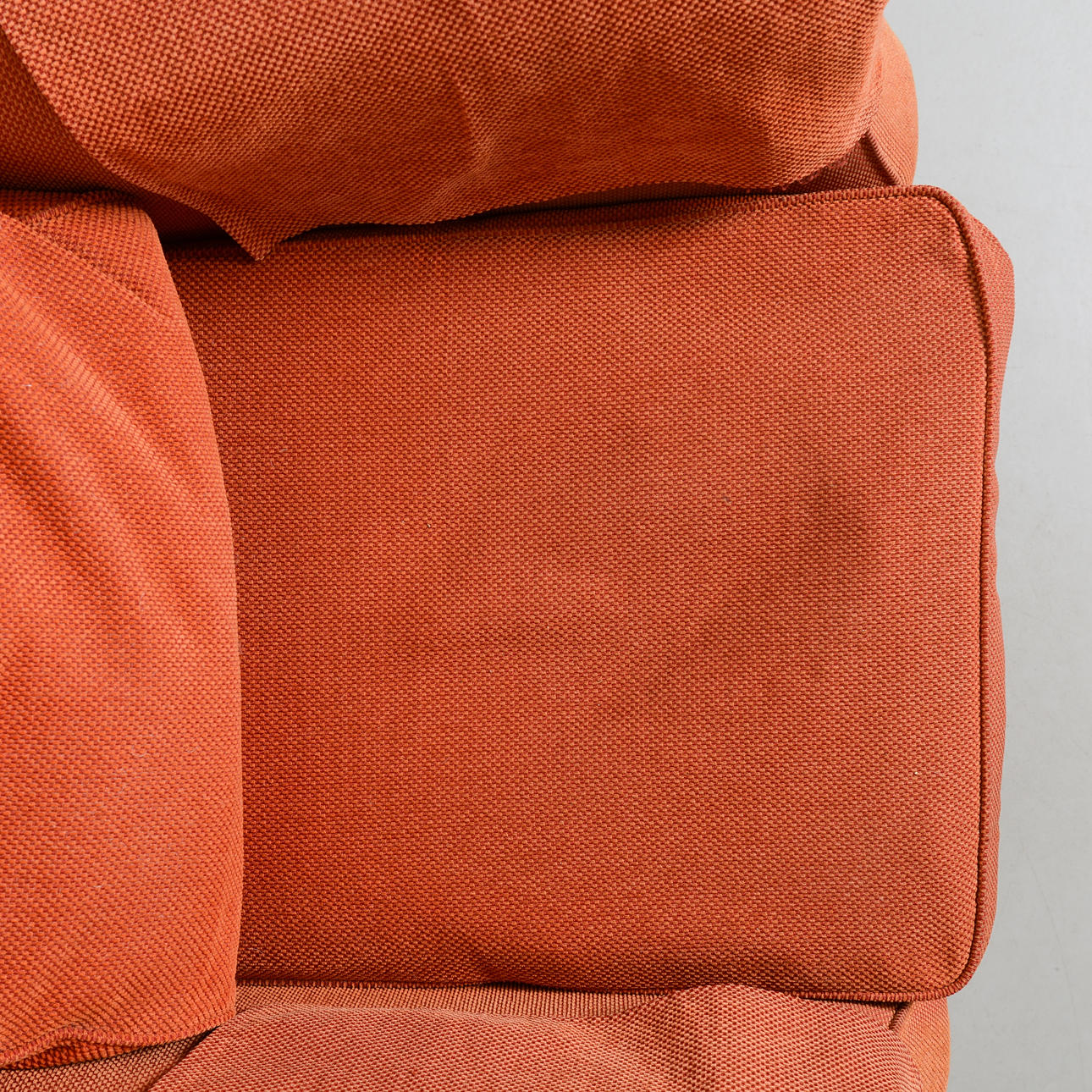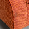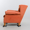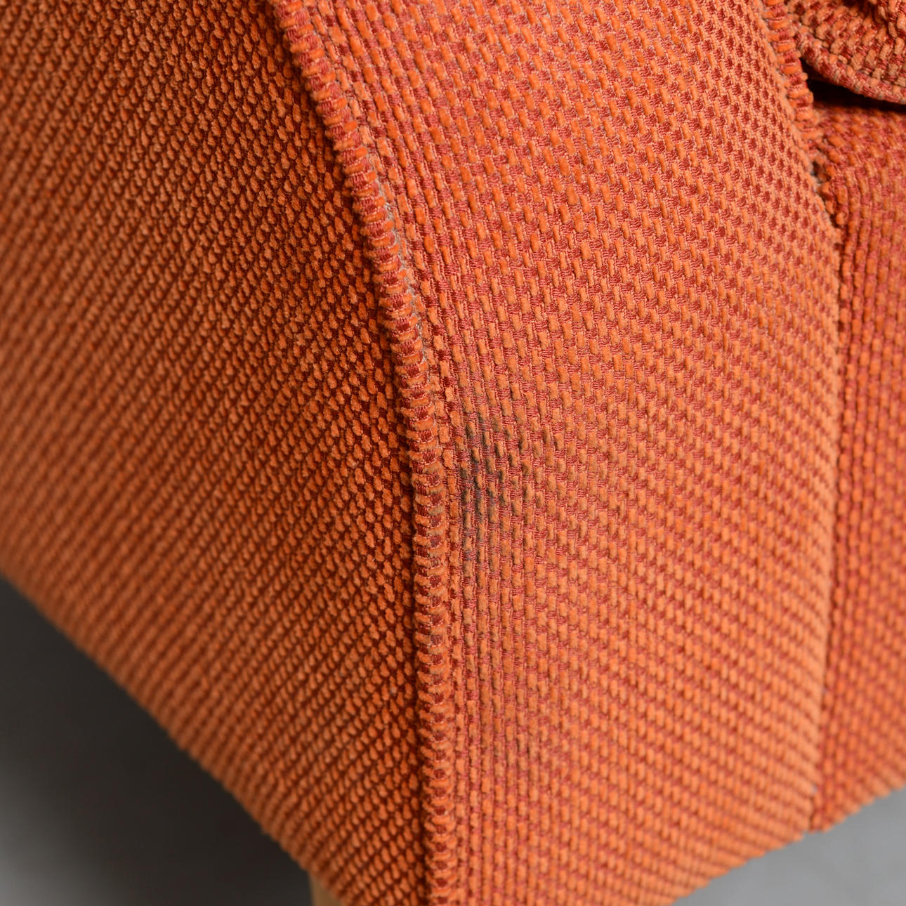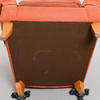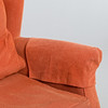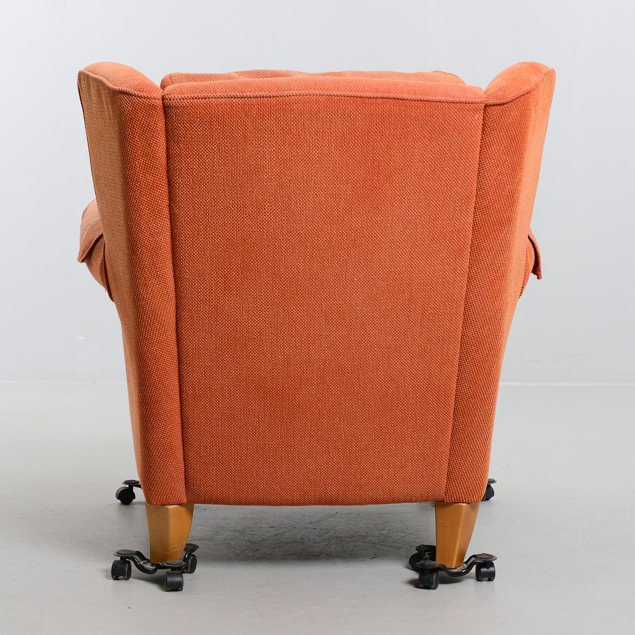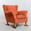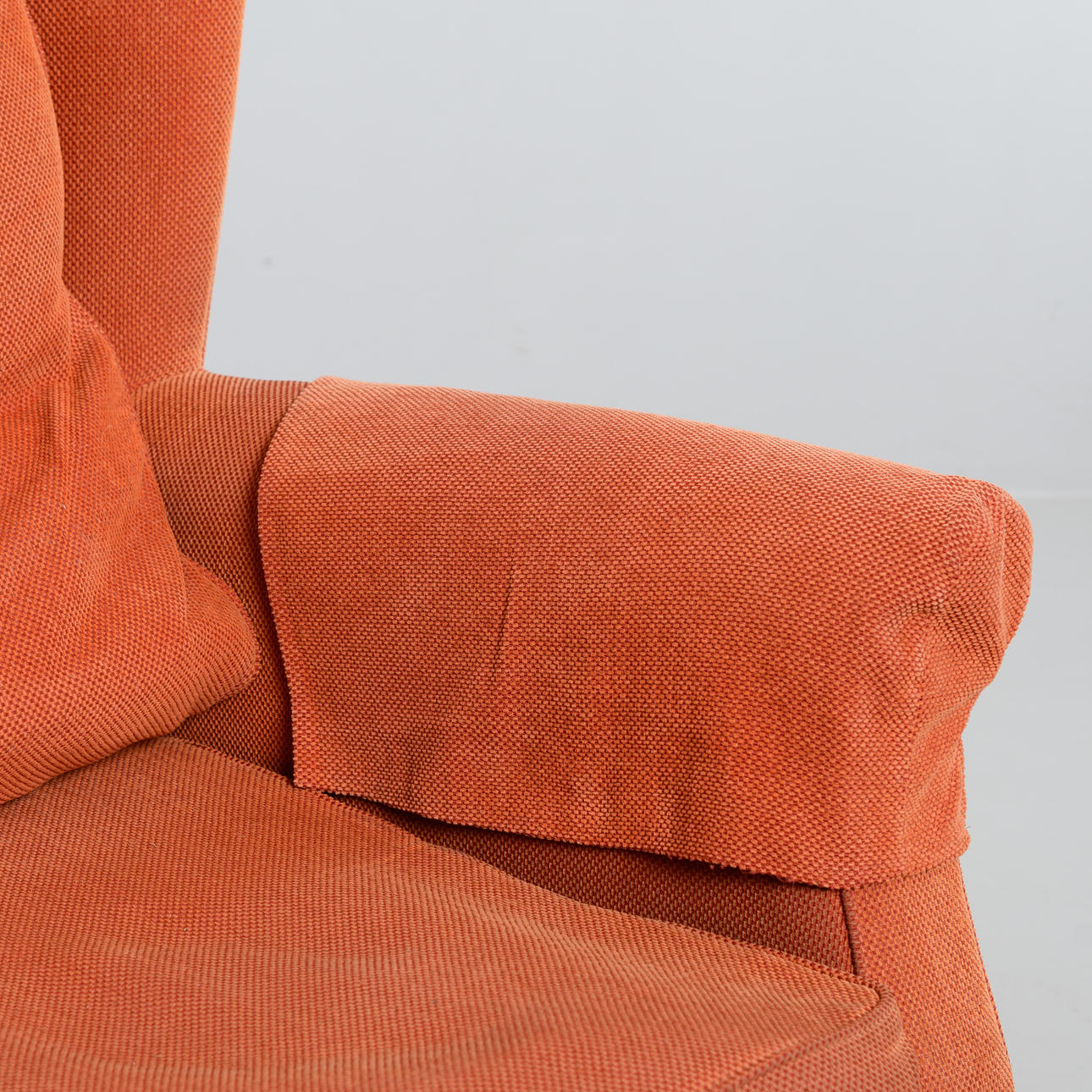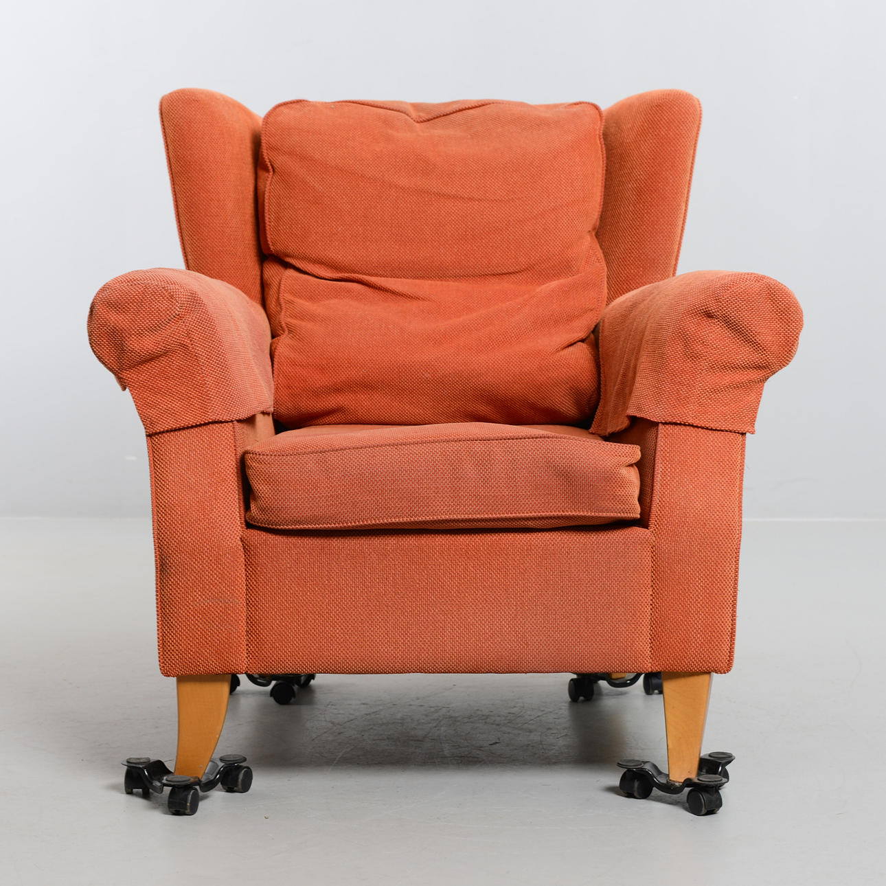 Etikettmärkta undertill. Med lösa textildynor och löstagbara armstödsskydd. Fåtöljens mått: Sitthöjd 45 cm. Rygghöjd 84 cm. Bredd 88 cm.