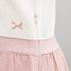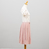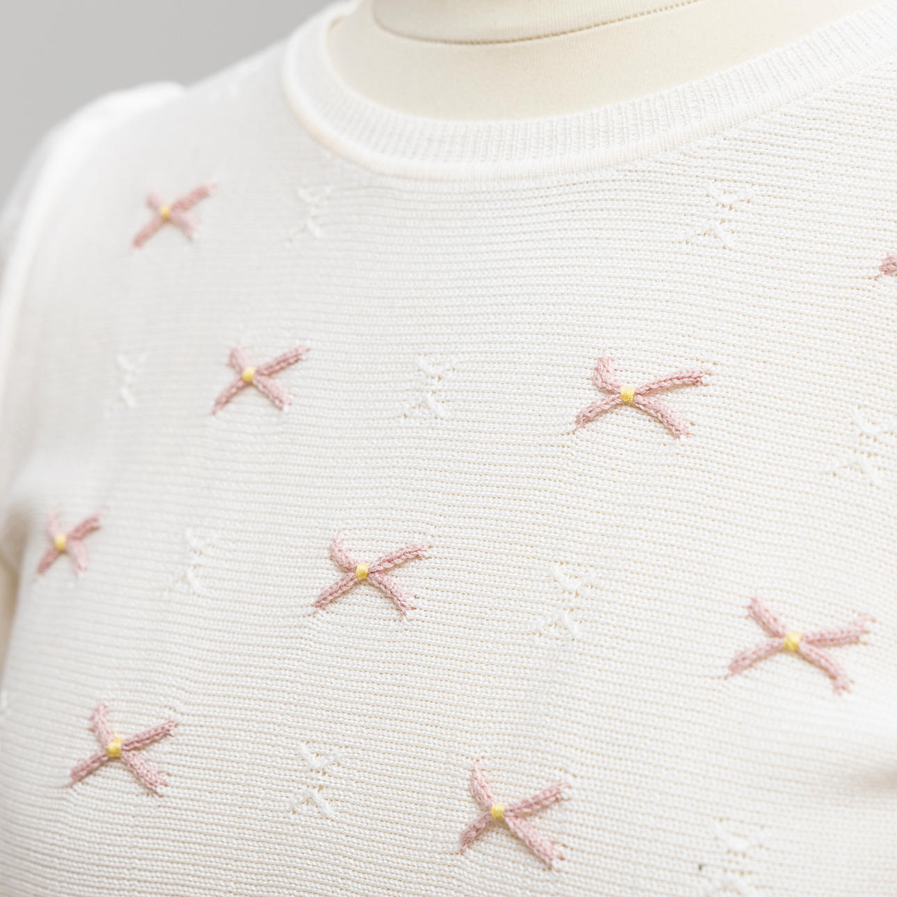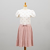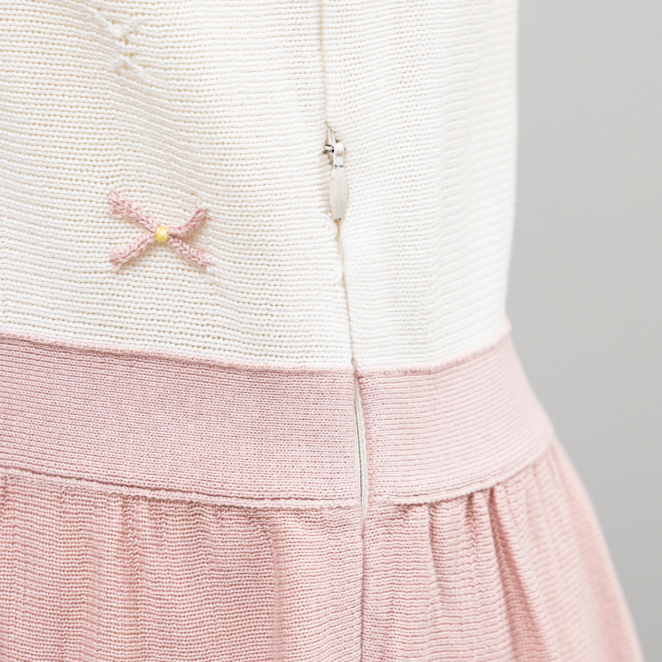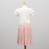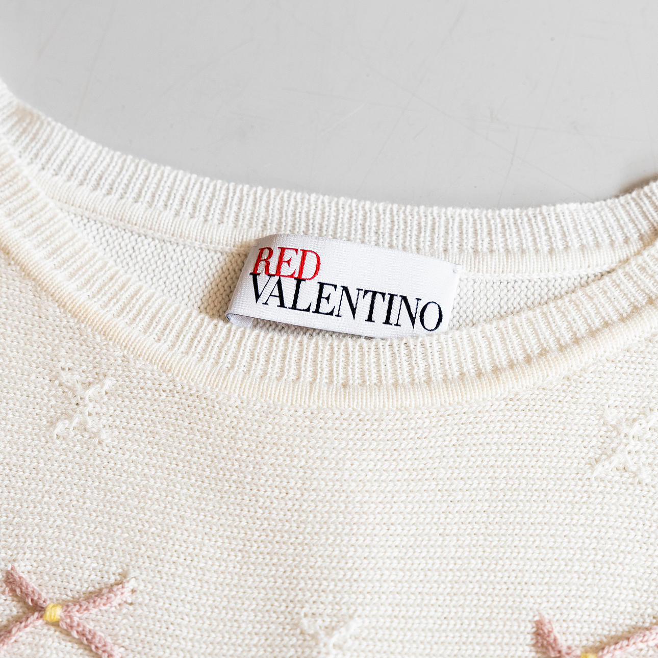 Vit kortärmad överdel med rosettliknande rosa dekor, matchande lätt klockad ljusrosa kjoldel. Etikettmärkt "RED VALENTINO".