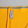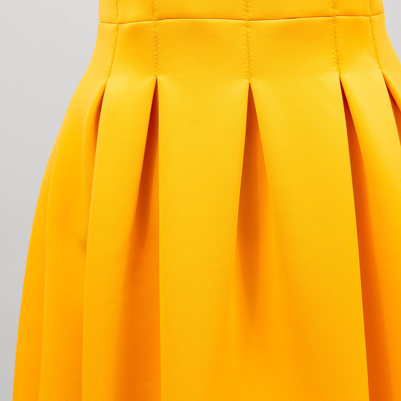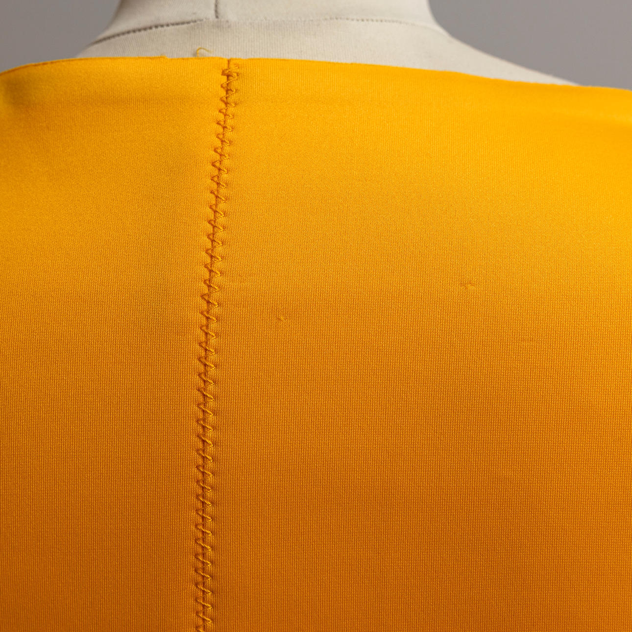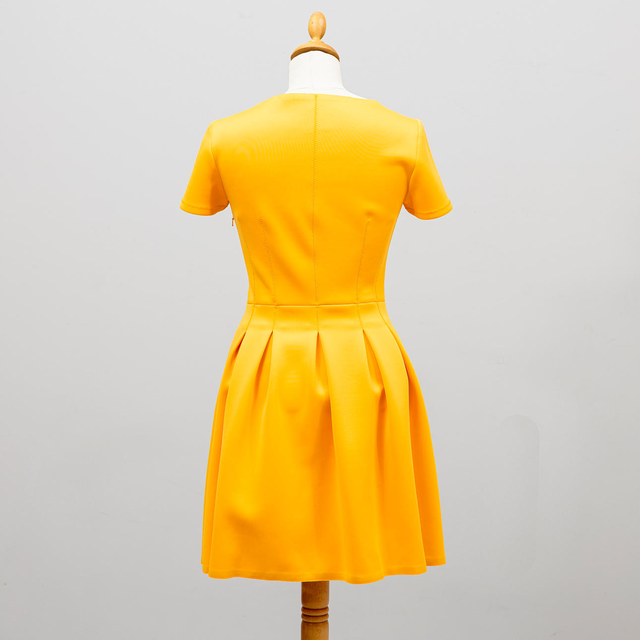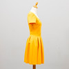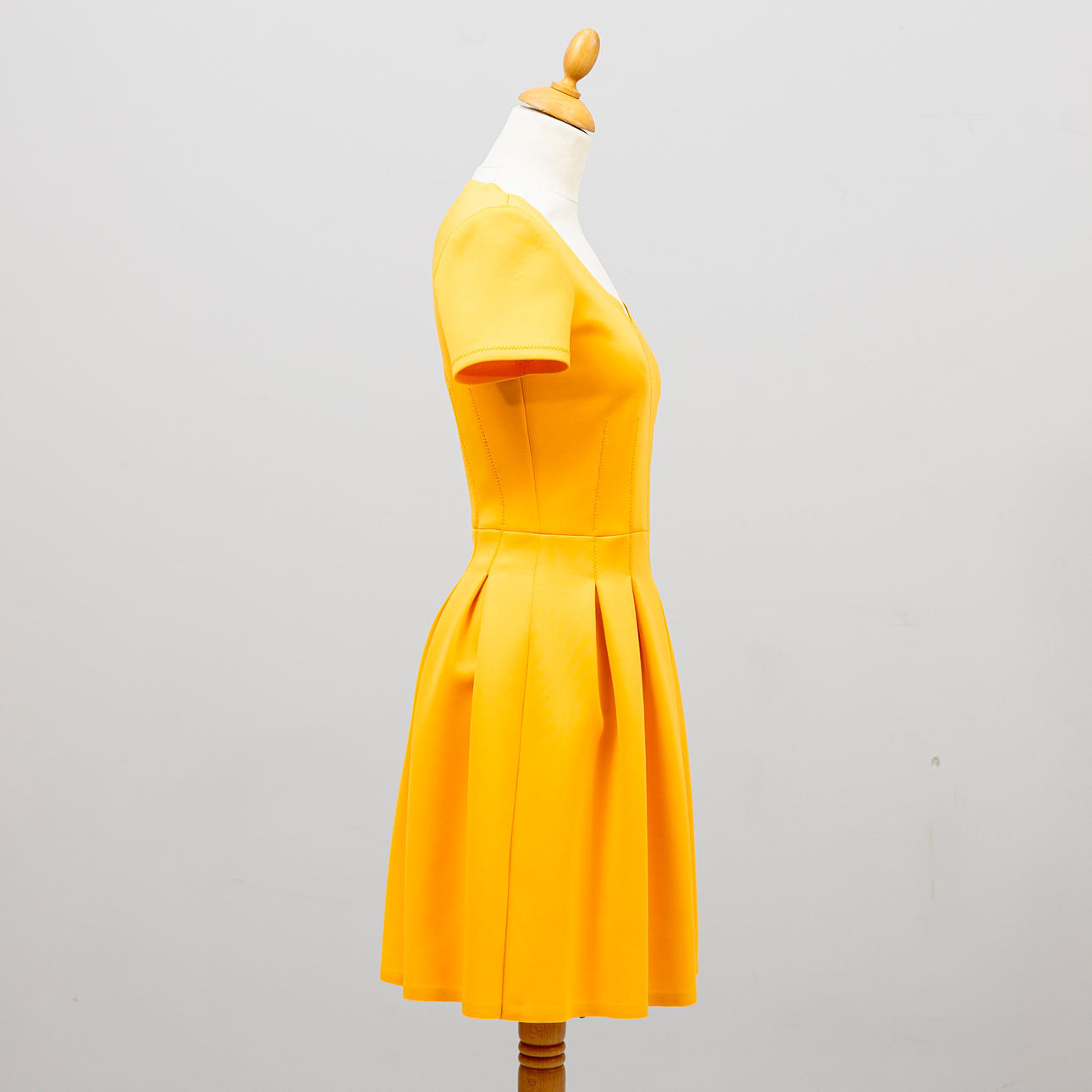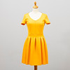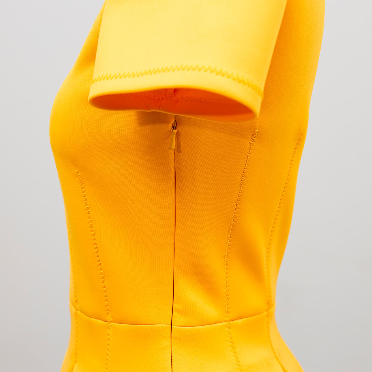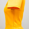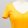 Kanariegul polyester med scubakänsla, kortärmad, V-ringad med insvängd midja, dold dragkedja i sidan.