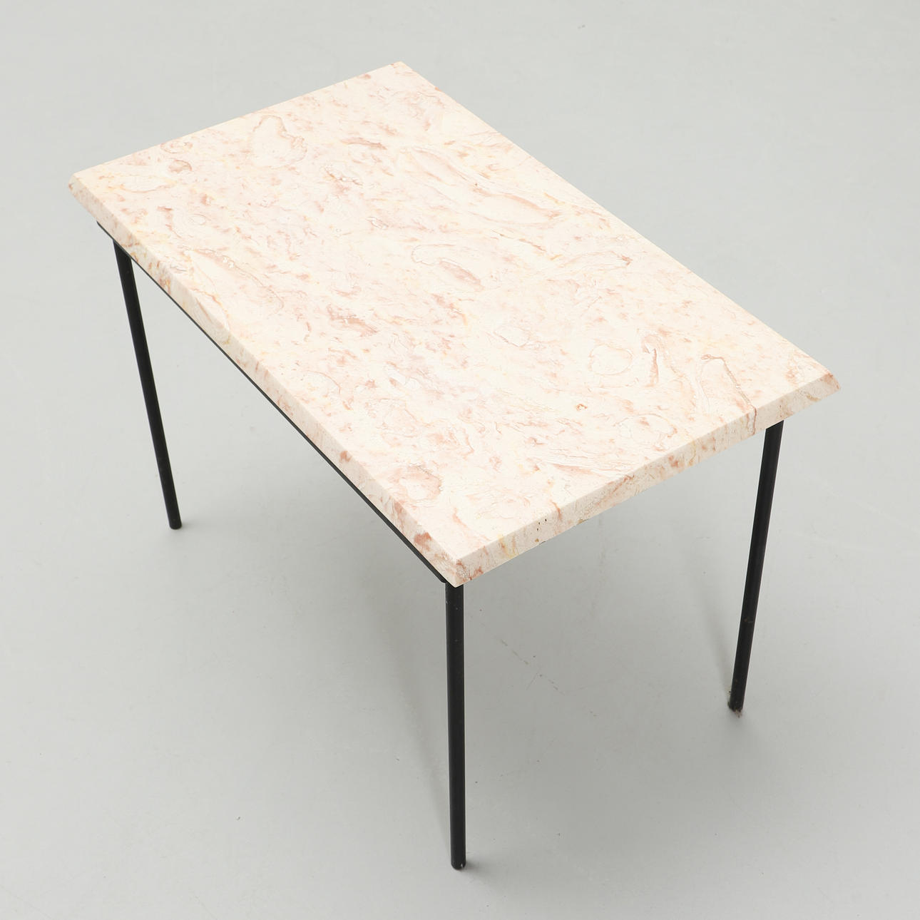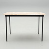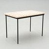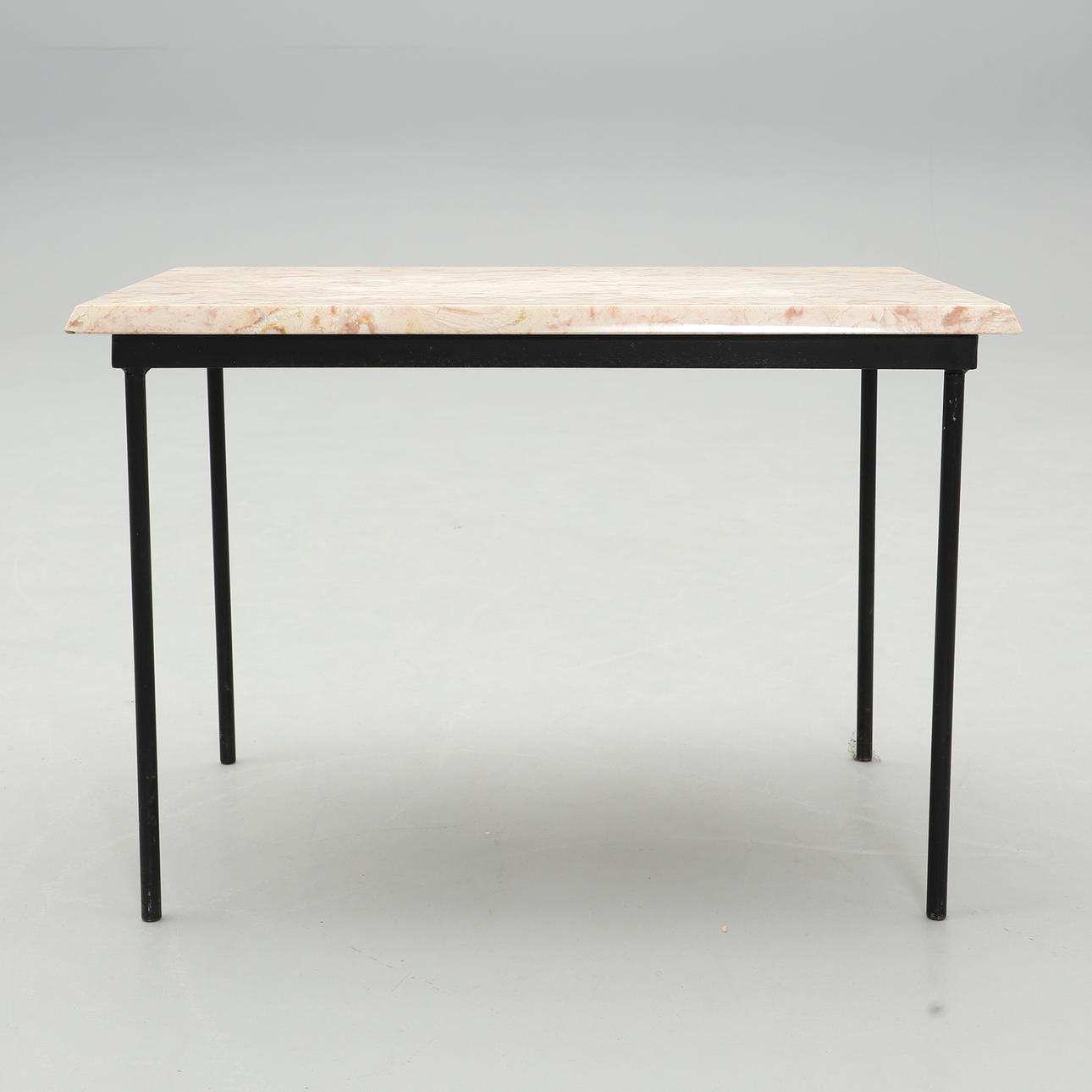 Underrede i svartlackerad metall. Bordsskiva i sten.
