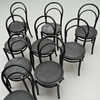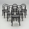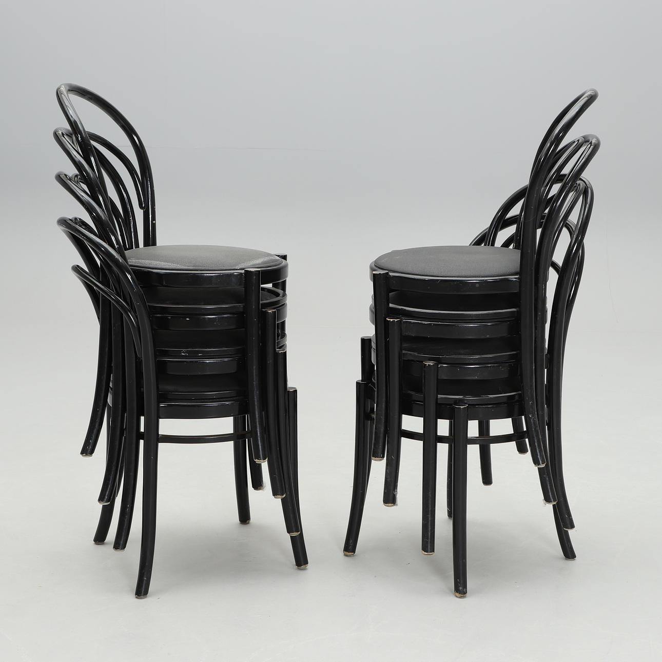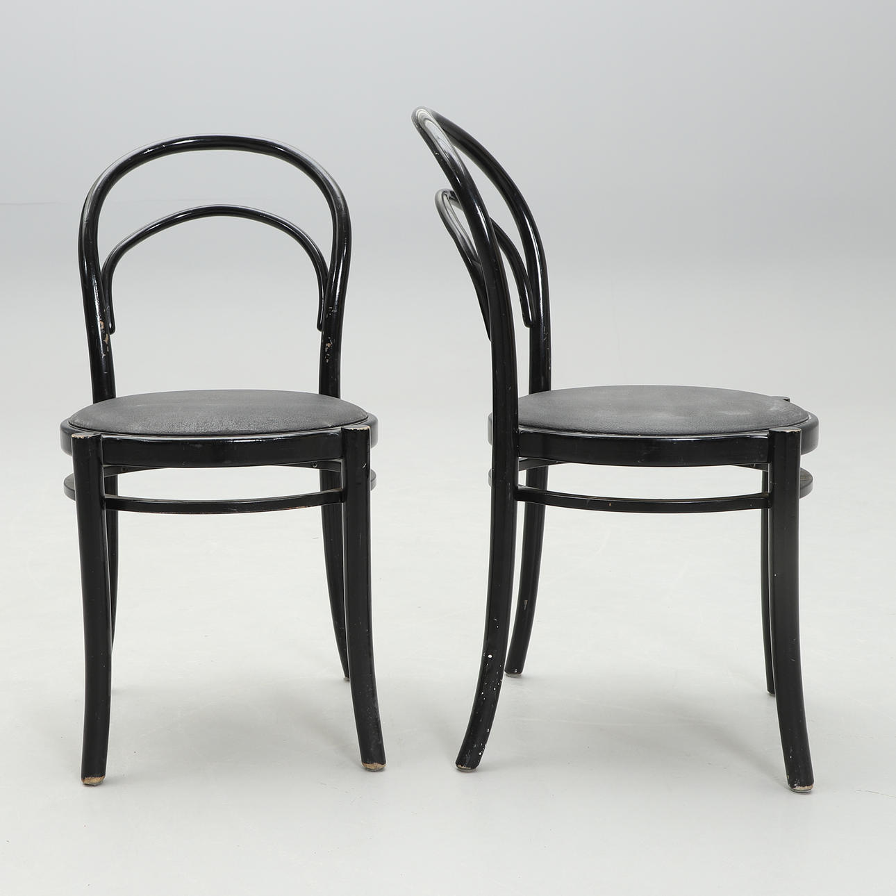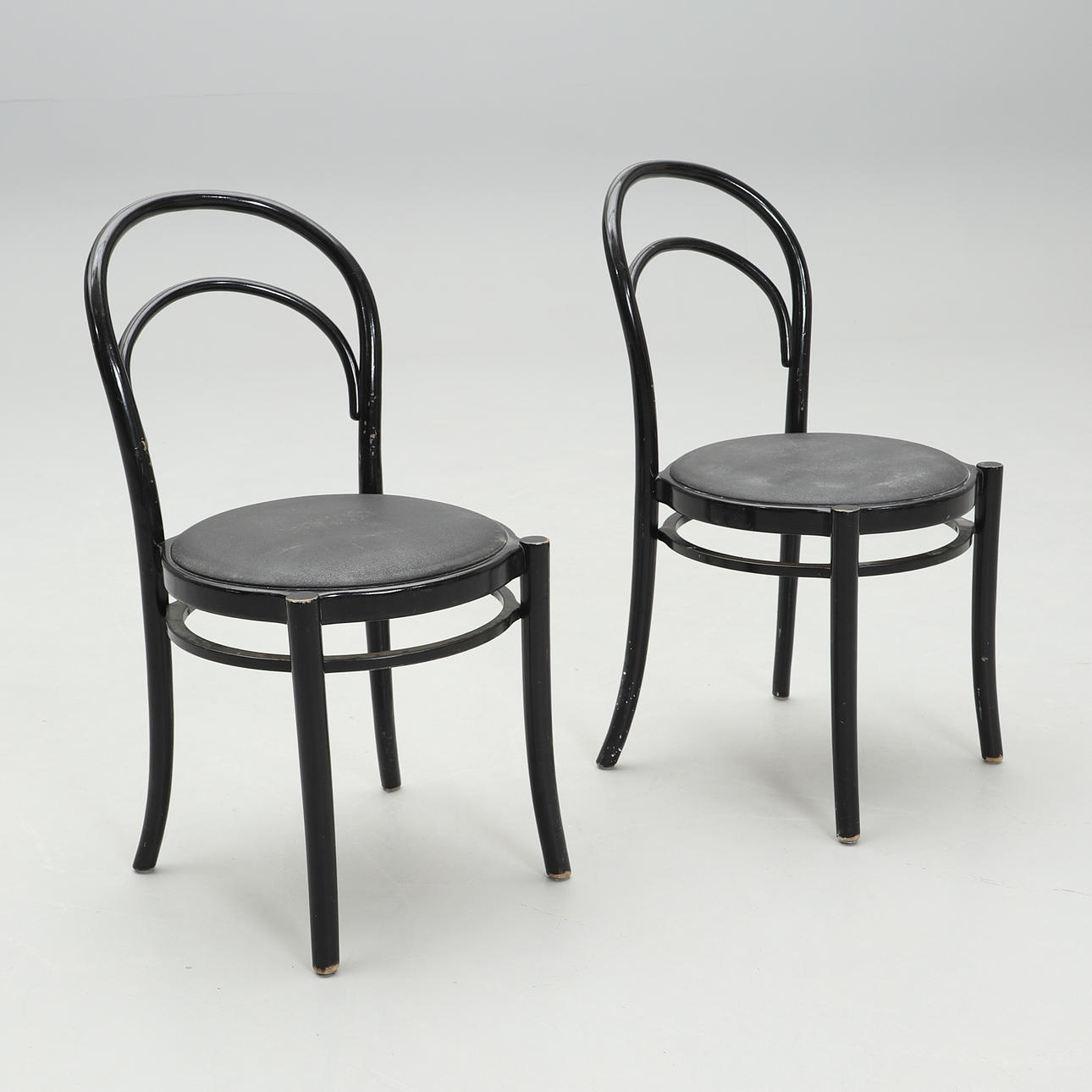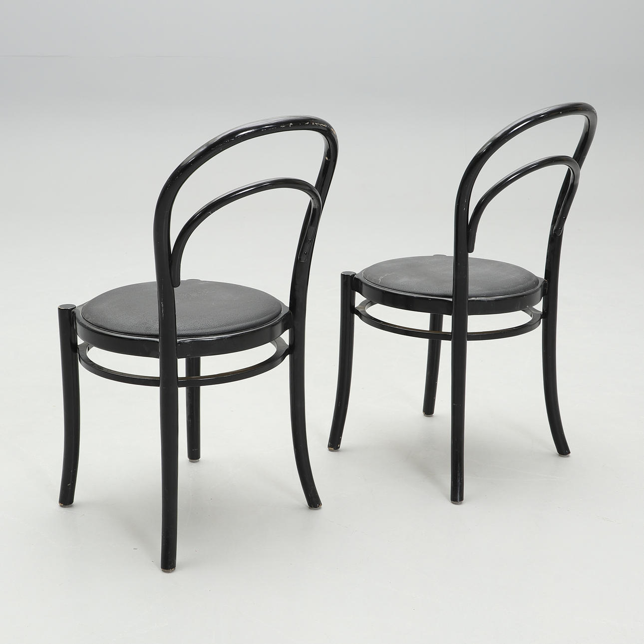 Svartlackerade. Rund stoppad sits klädd i konstläder. Bredd 43, höjd 93 cm. Stapelbara.