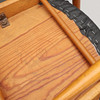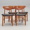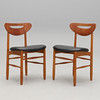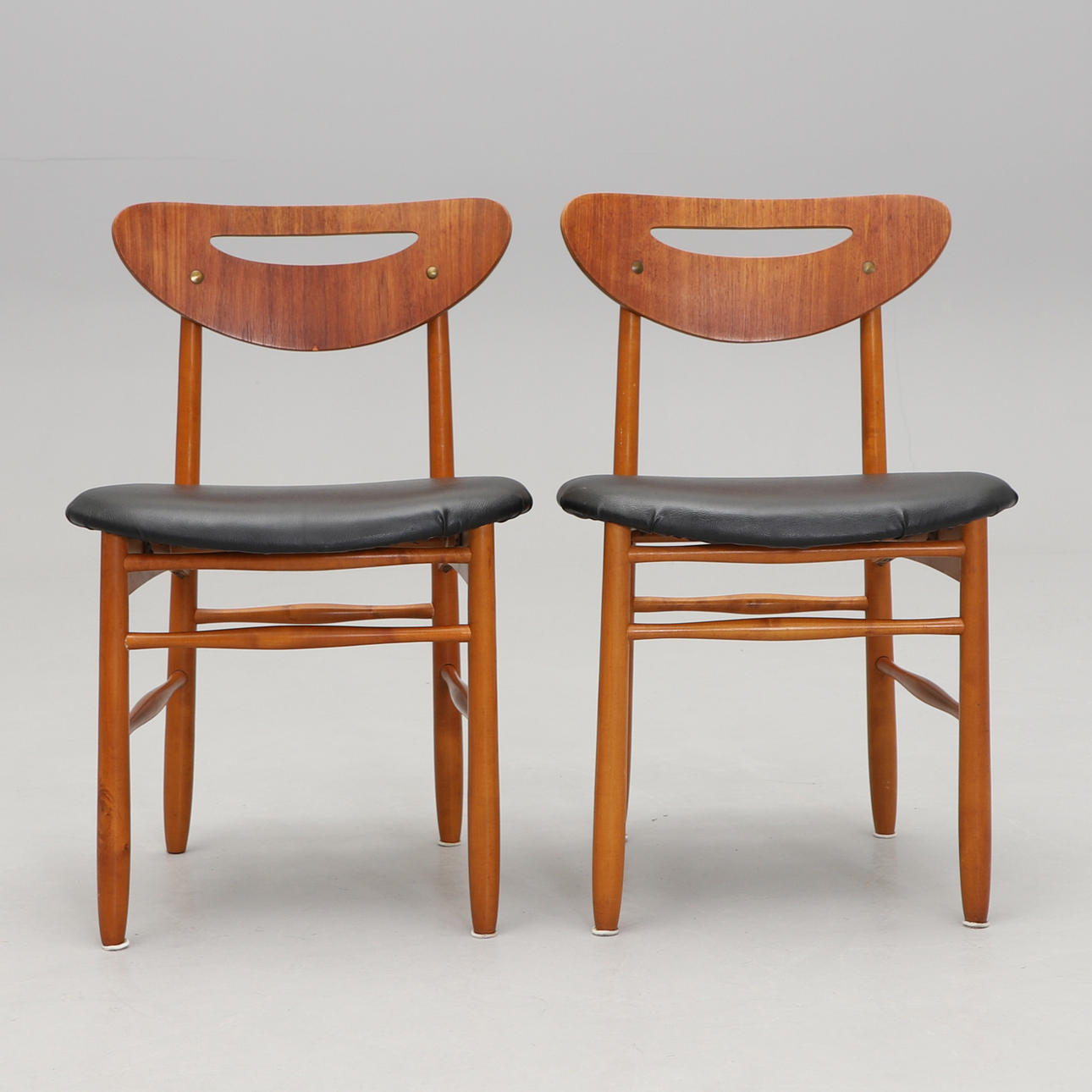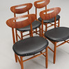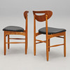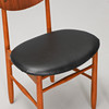 Ryggbricka i teakplywood, stoppad sits klädd med svart galon, somme i betsad björk. Bredd 49, djup 46, höjd 76 cm. Sitthöjd 46 cm.