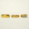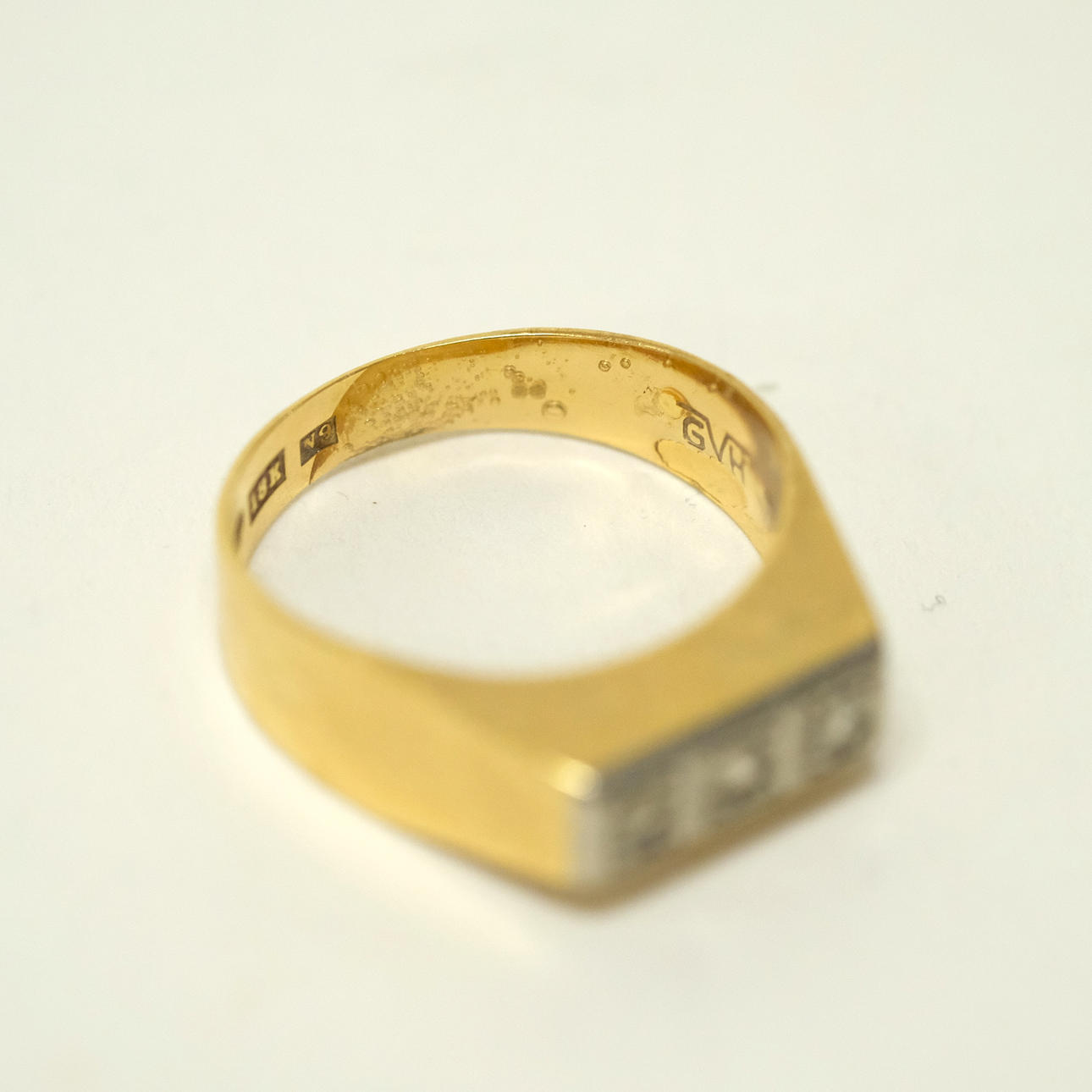 Bruks- och åldersrelaterat slitage. Gravyr. Ringar med stenar med limrester på insidan. Slät ring med spricka.