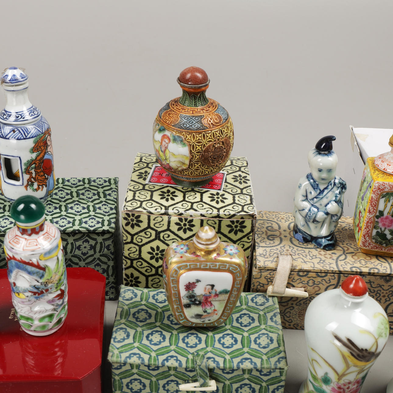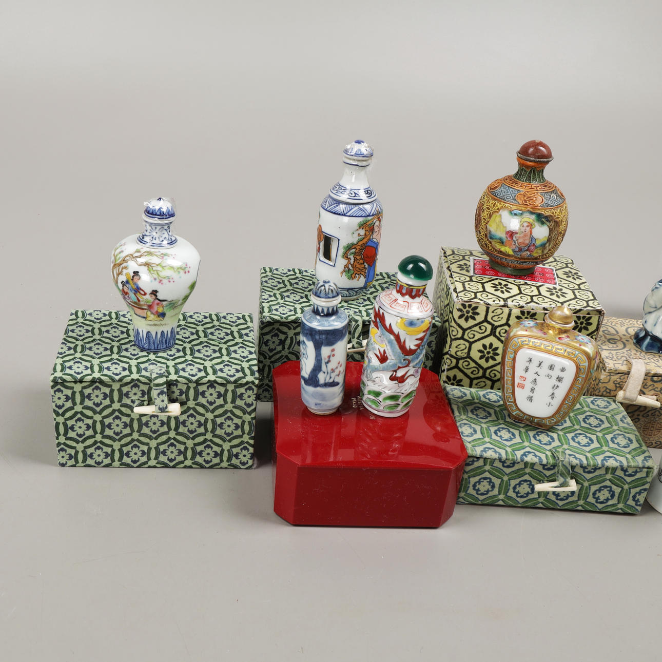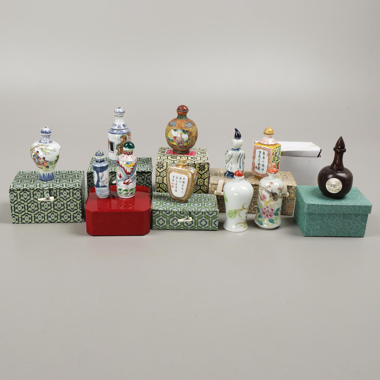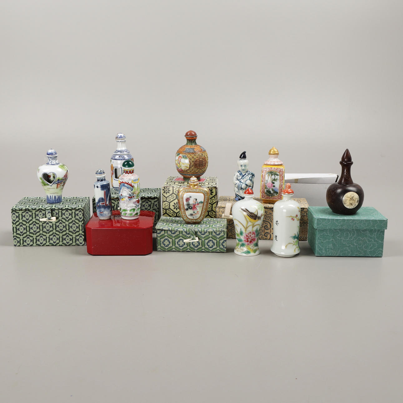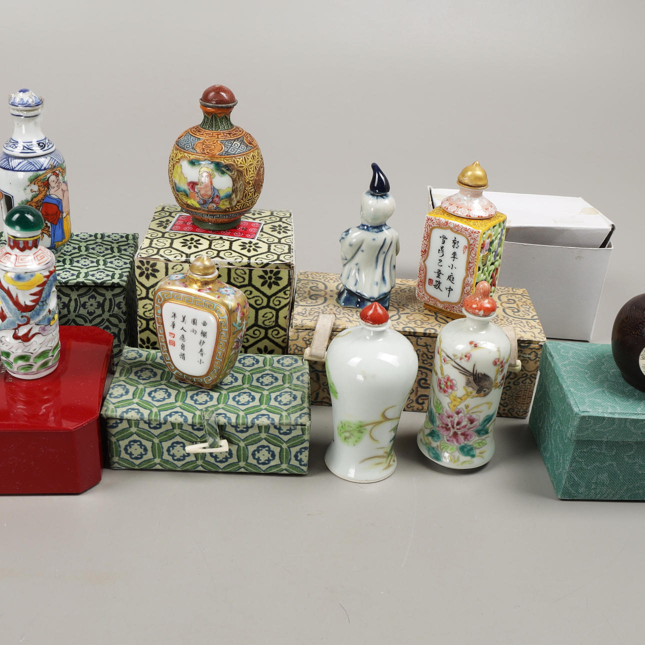 5009591. SNUSFLASKOR, 11 st, porslin/trä, Kina, 1900-tal.