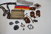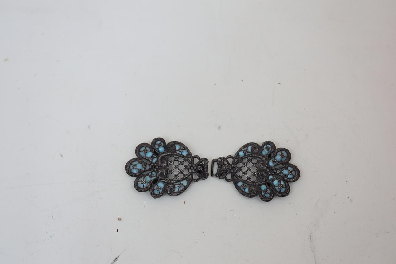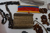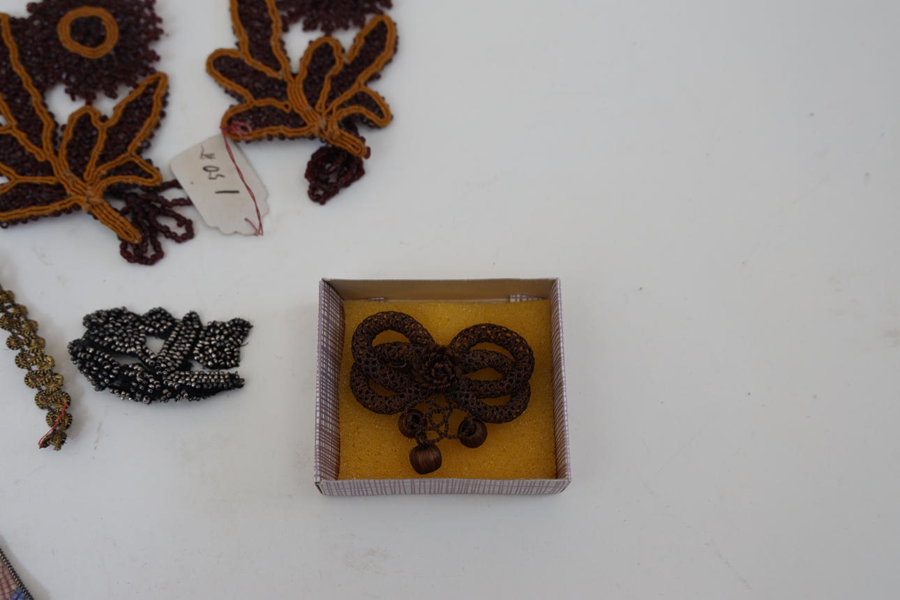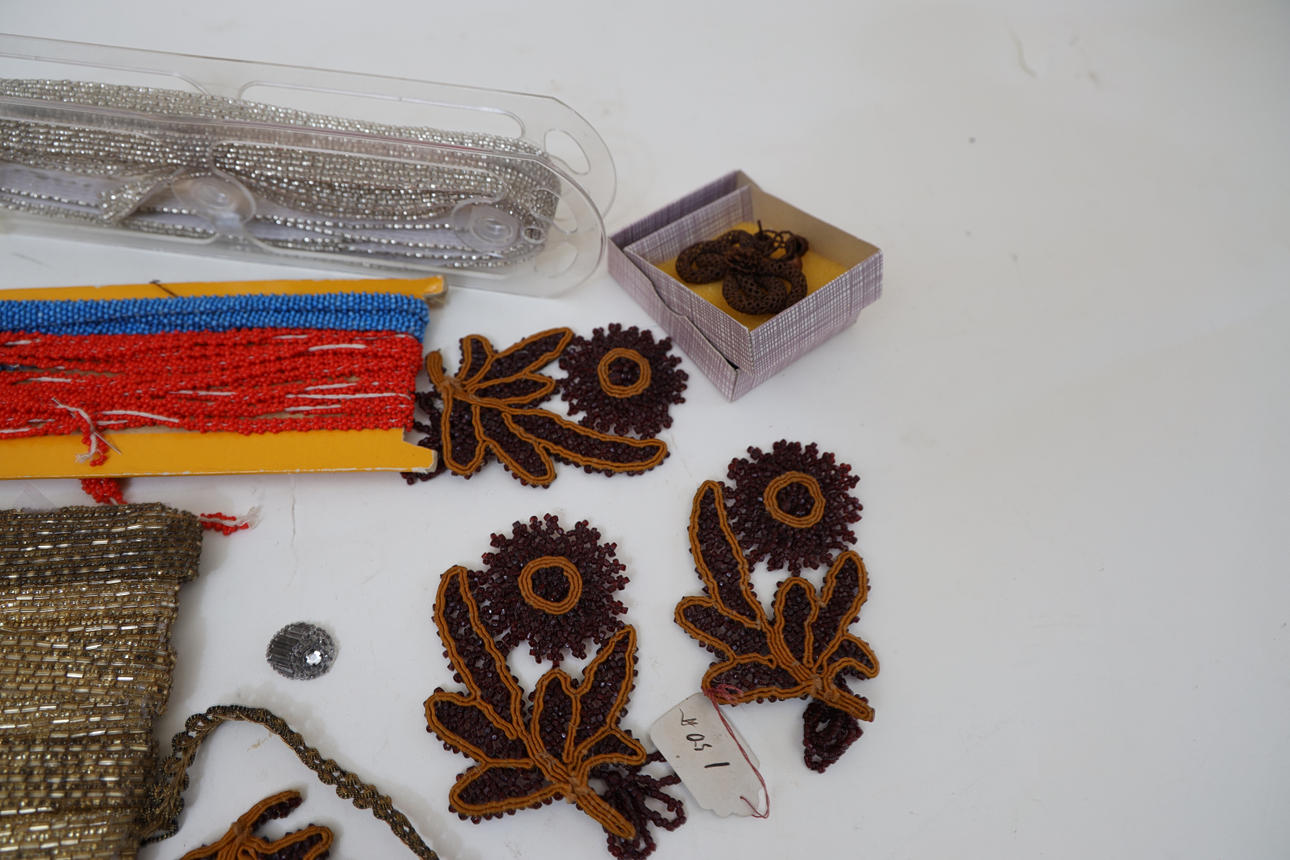 Mestadels med pärlor. Spänne, dekorer, band med mera.