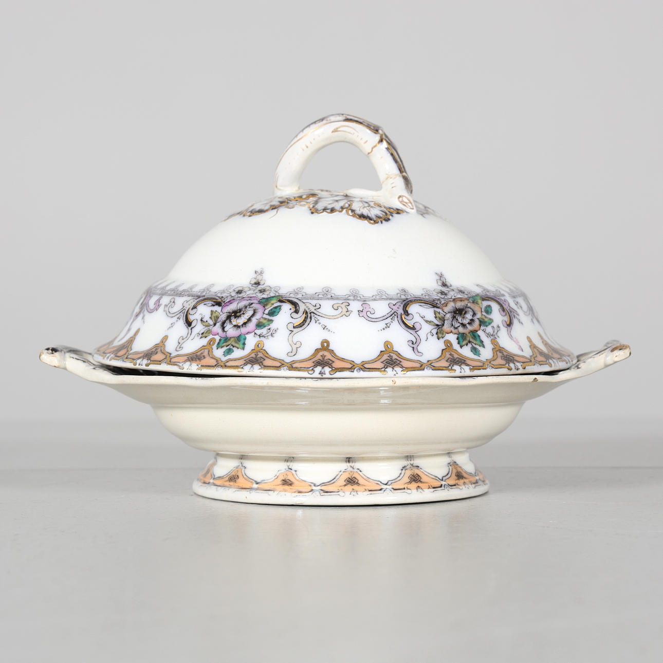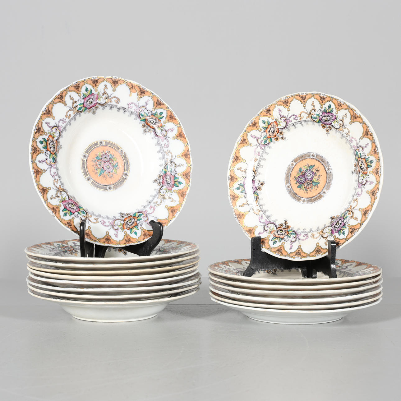 Bruks- och åldersrelaterat slitage. Krackeleringar och missfärgningar. Spricka/nagg upptäckt på 2 delar.