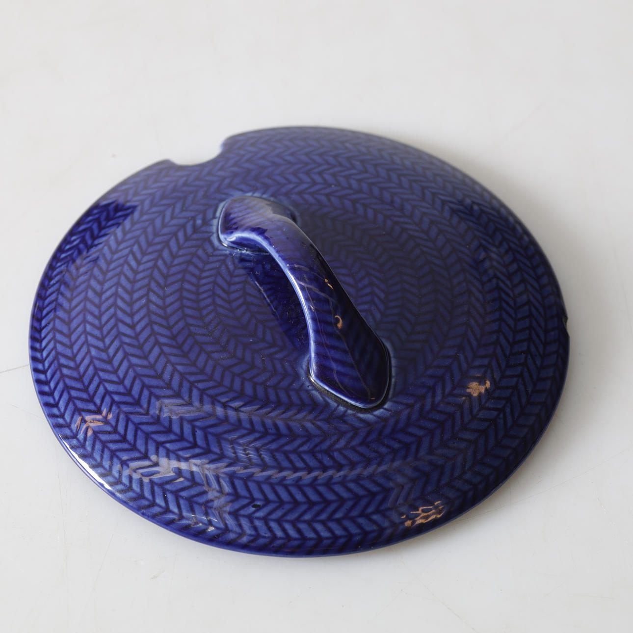 Ett avslag på locket, repor förekommer.