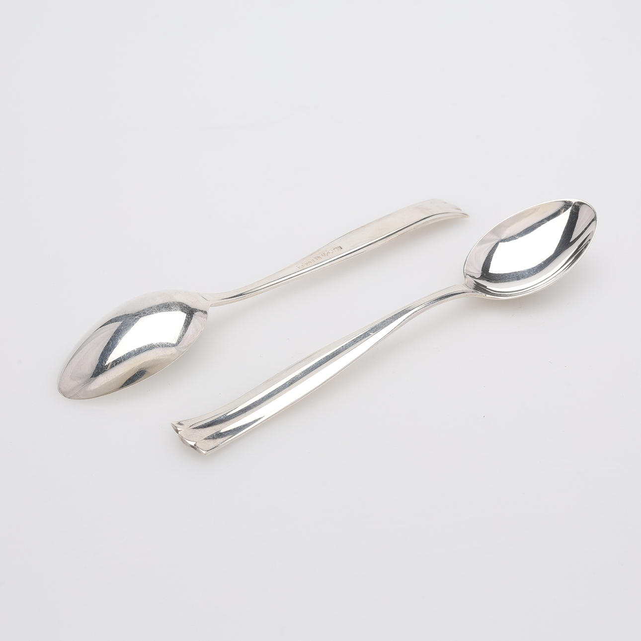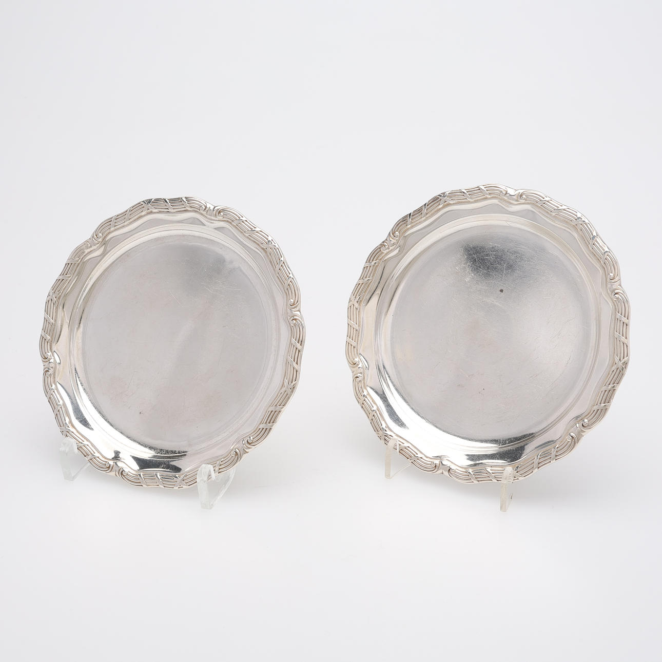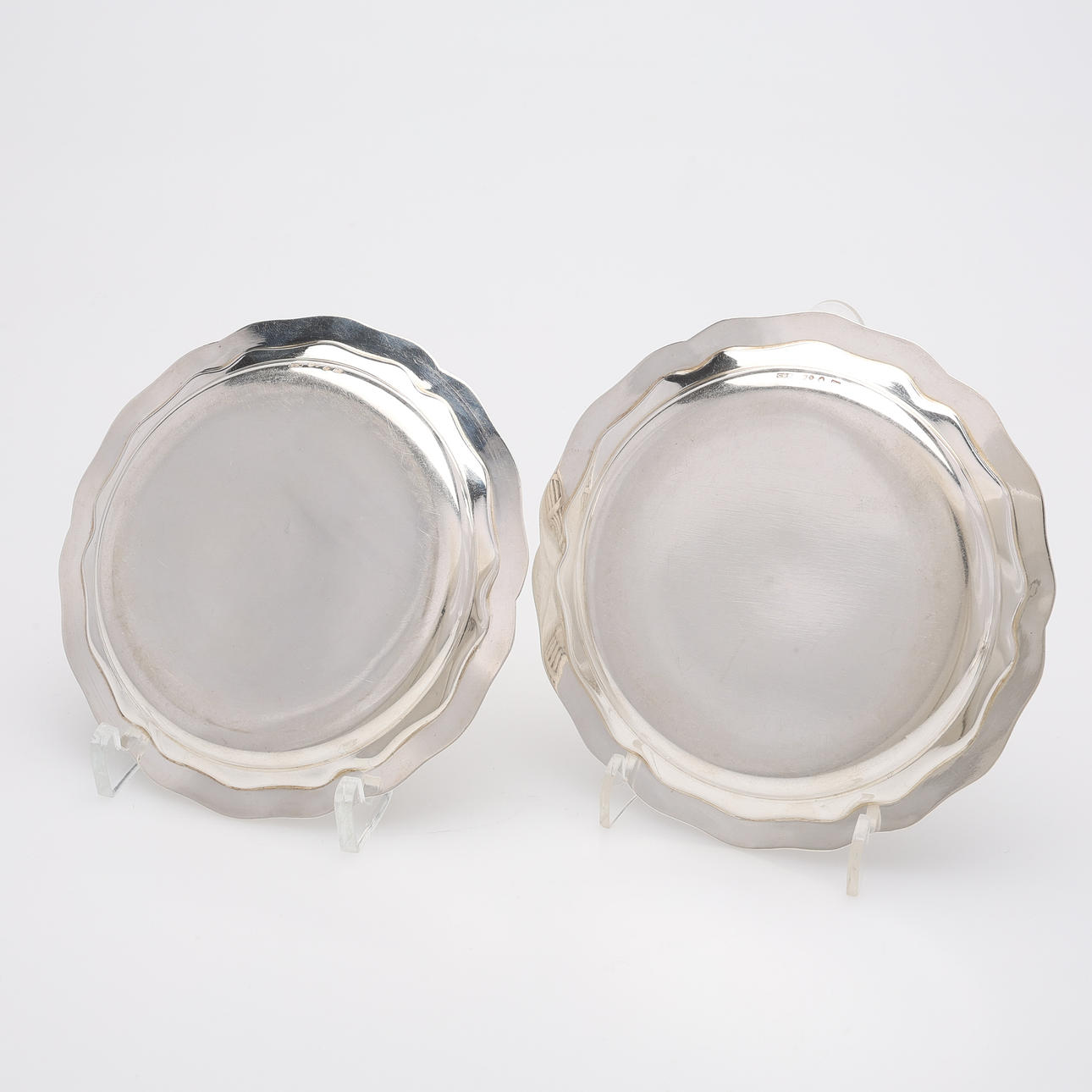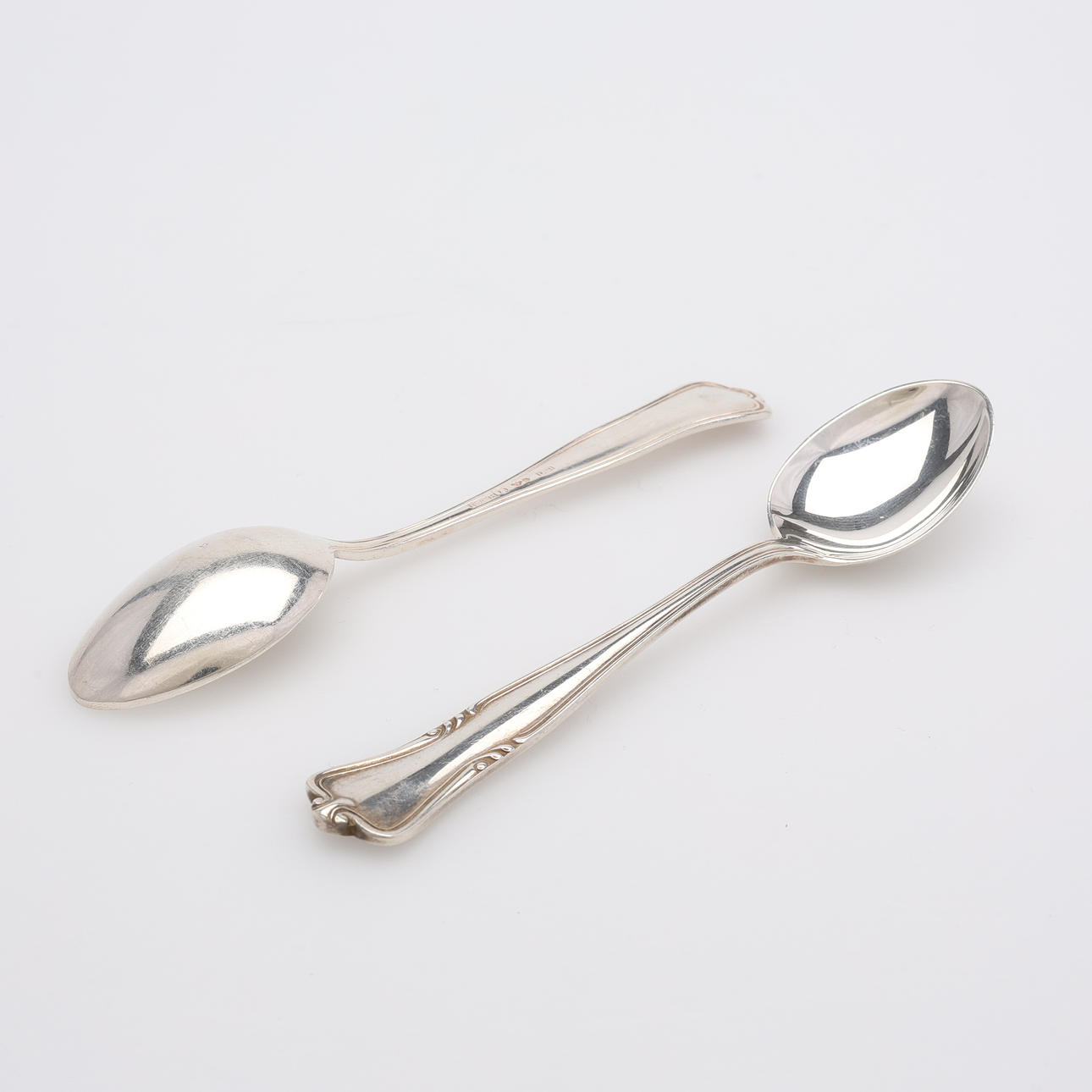 Fat, två stycken, diameter ca 13,5 cm. Kaffeskedar, 12 stycken, längd ca 11 cm. Kaffeskedar, 12 stycken, längd ca 11,5 cm.