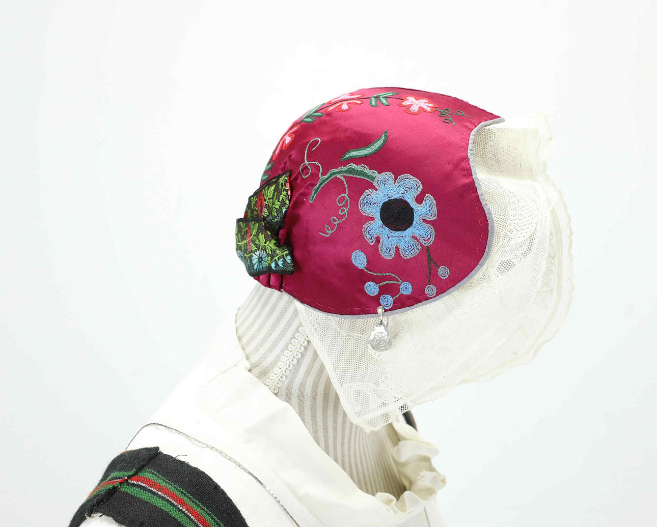 Lomma, applikationer och tenntrådsbroderier på svart kläde, skinn, mässingsbygel.