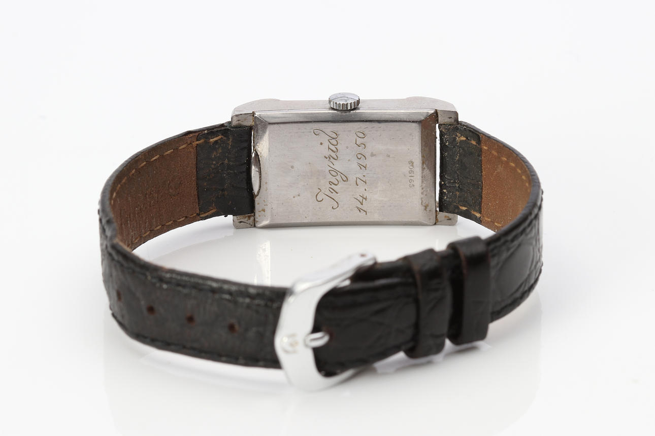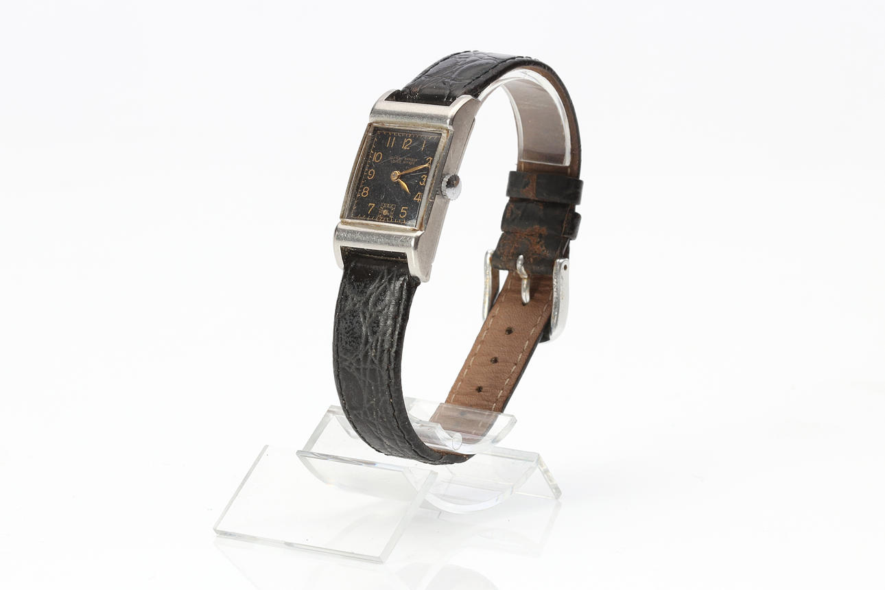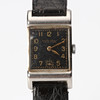 Svart urtavla med guldfärgad numerärer, subdial för sekunder, manuellt verk. Senare rem. Ca 36x20 mm.
