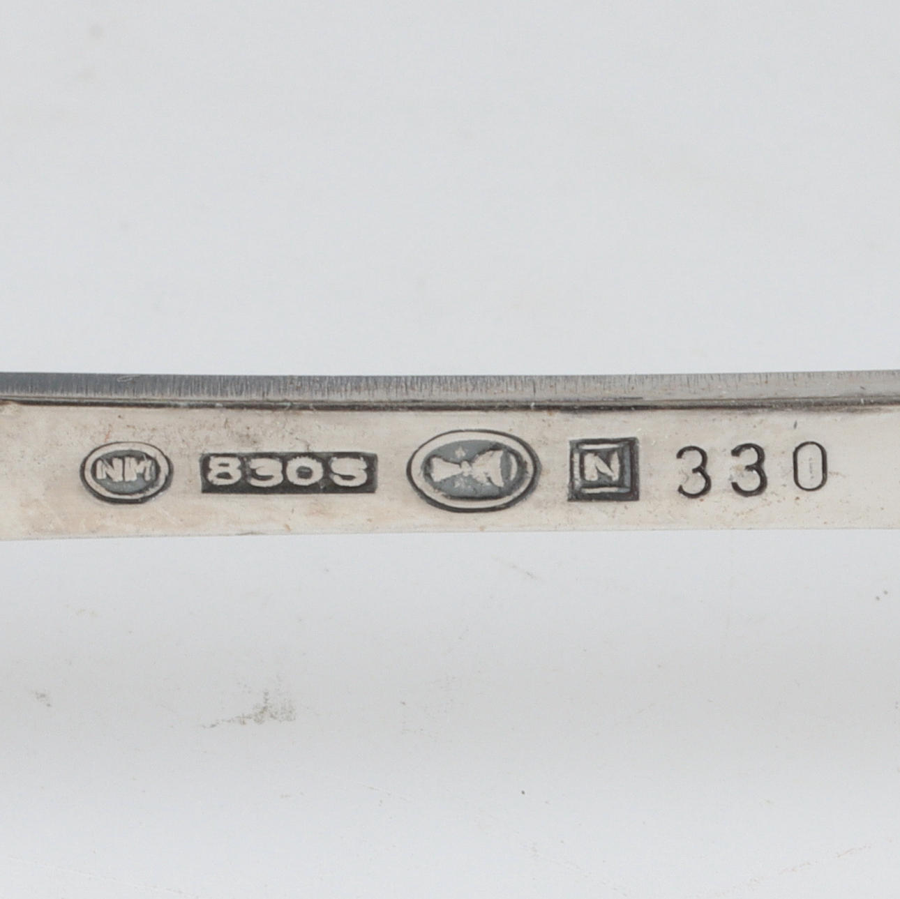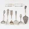 Bla. sockertänger, kakspade, skedar, längd ca 8 - 21 cm, vikt ca 220g.