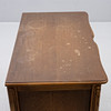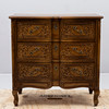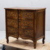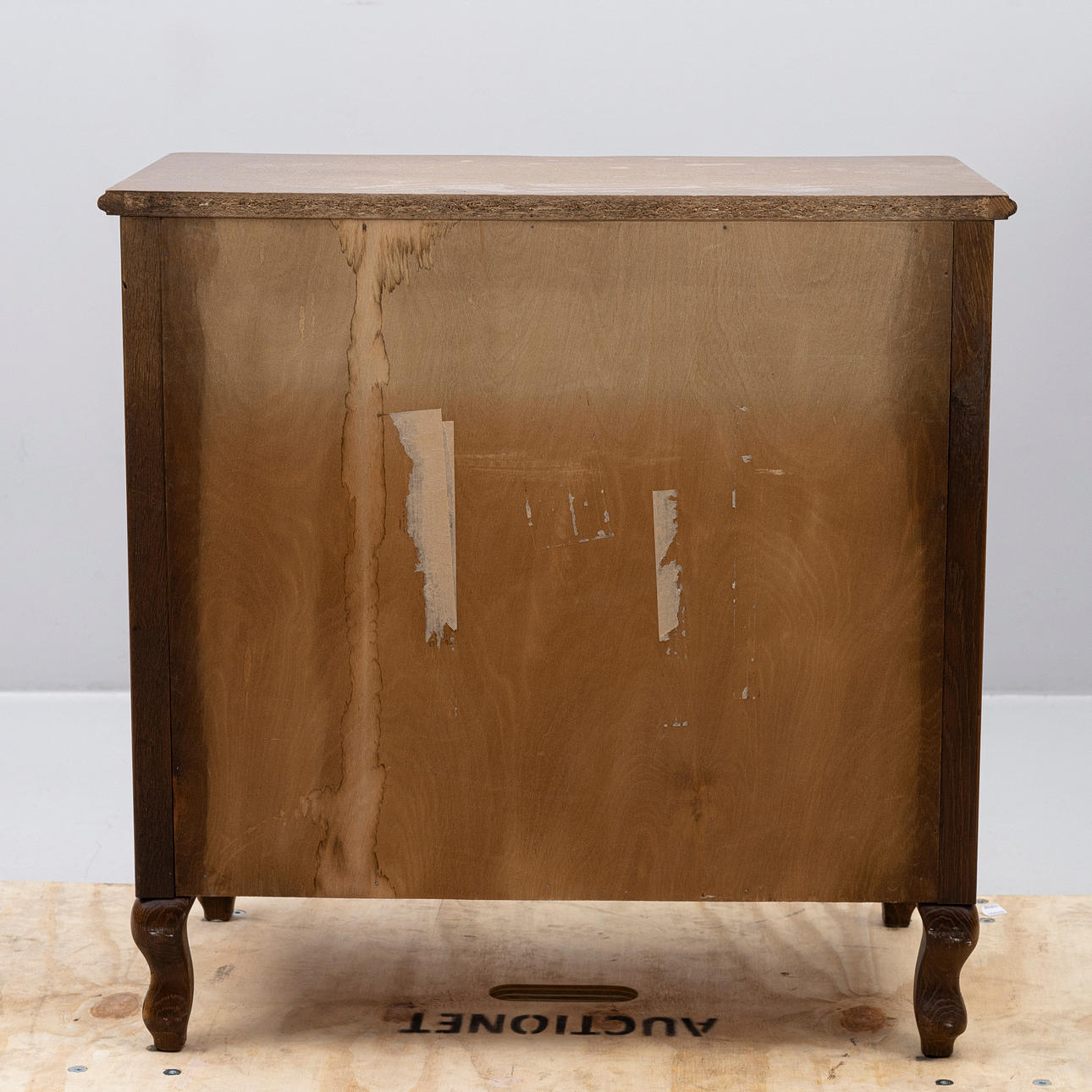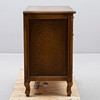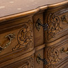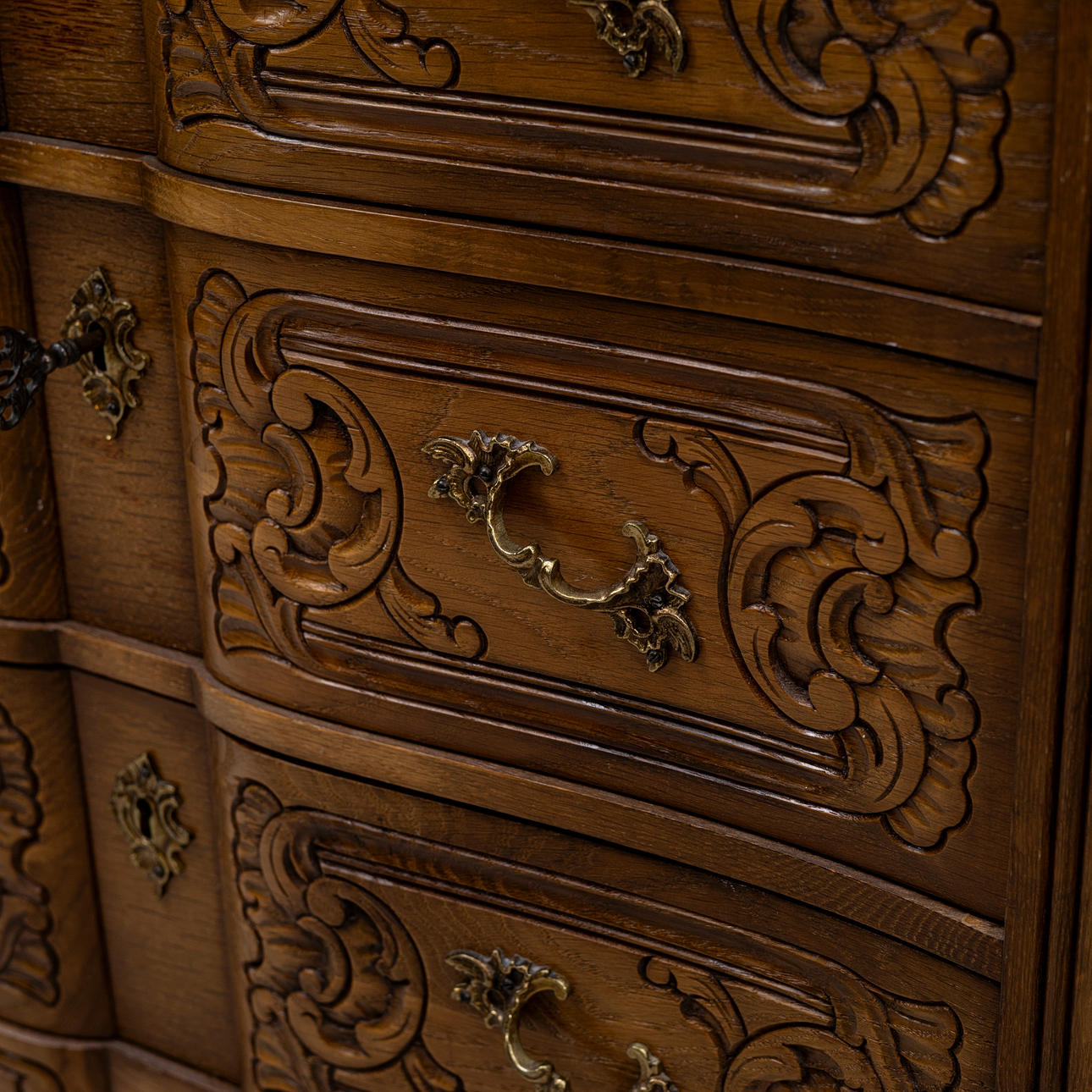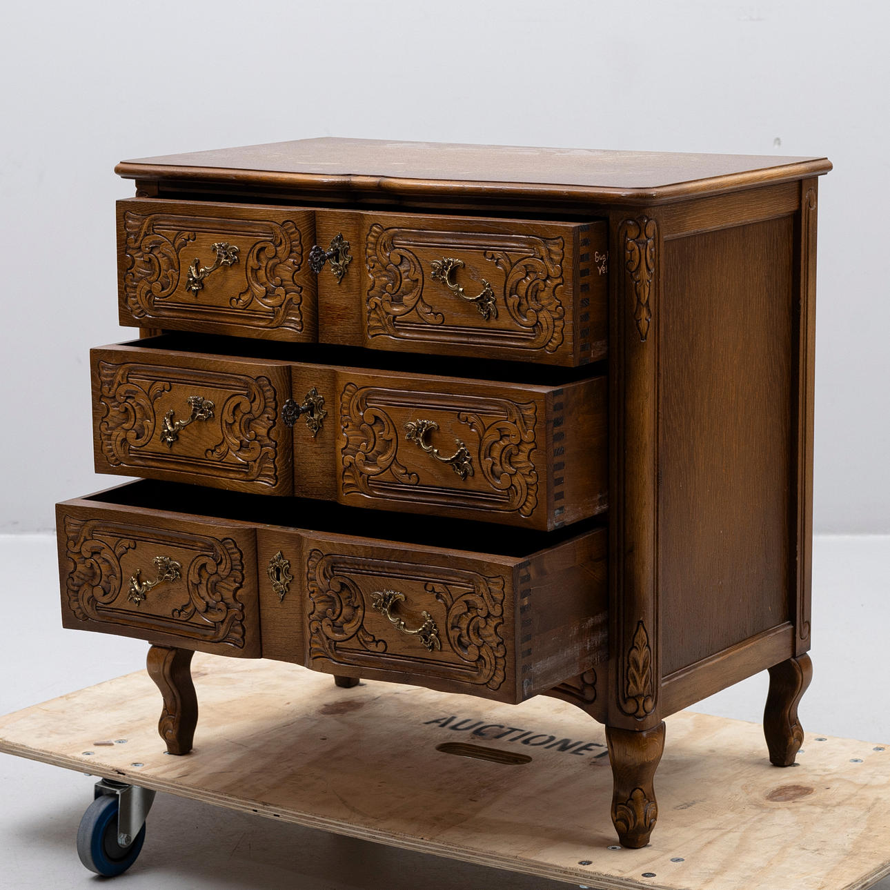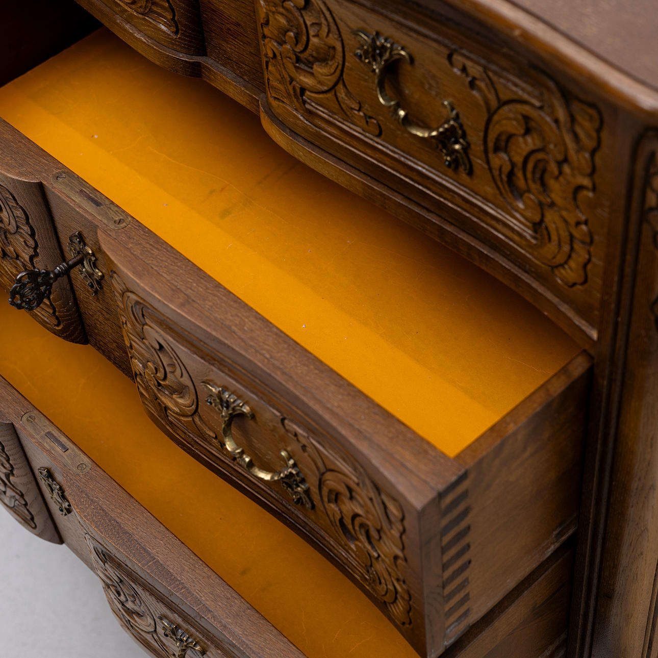 Skuren roccaillesliknande dekor, metallbeslag, 3 låsbara lådor, längd ca 74,5, djup 43,5 och höjd 74 cm.