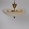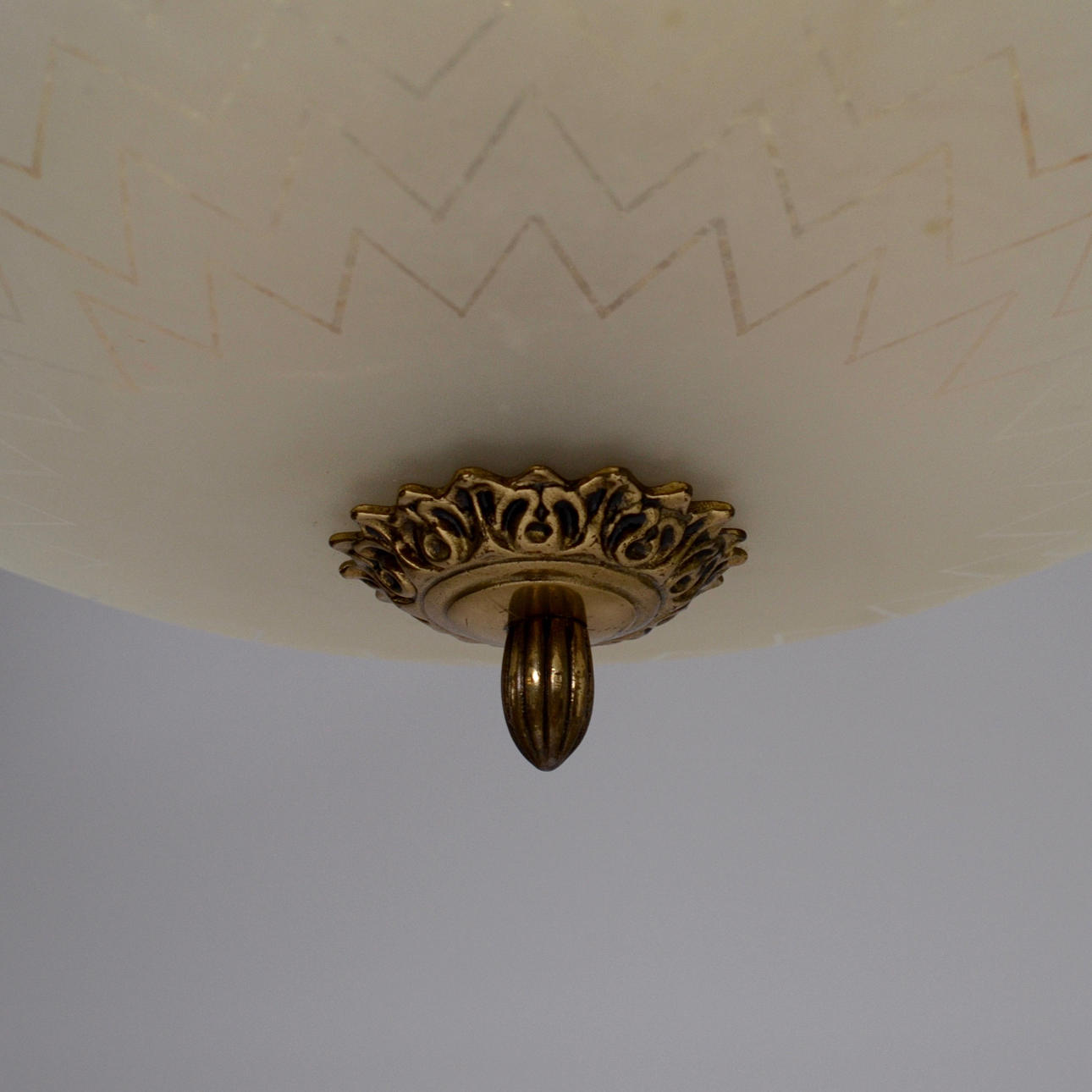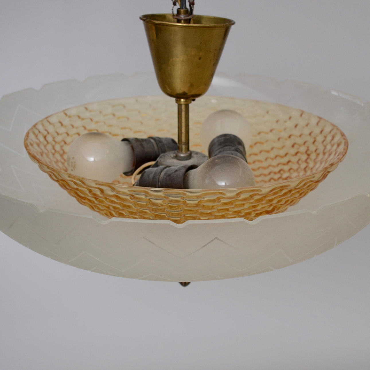 Ytterkupa i frostat glas med etsad dekor, innerkupa i gjutet glas samt stomme i mässing. Ø ca 49 cm.