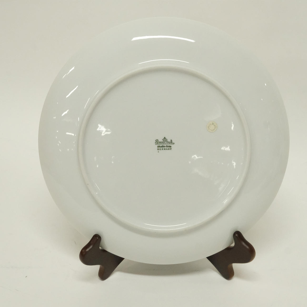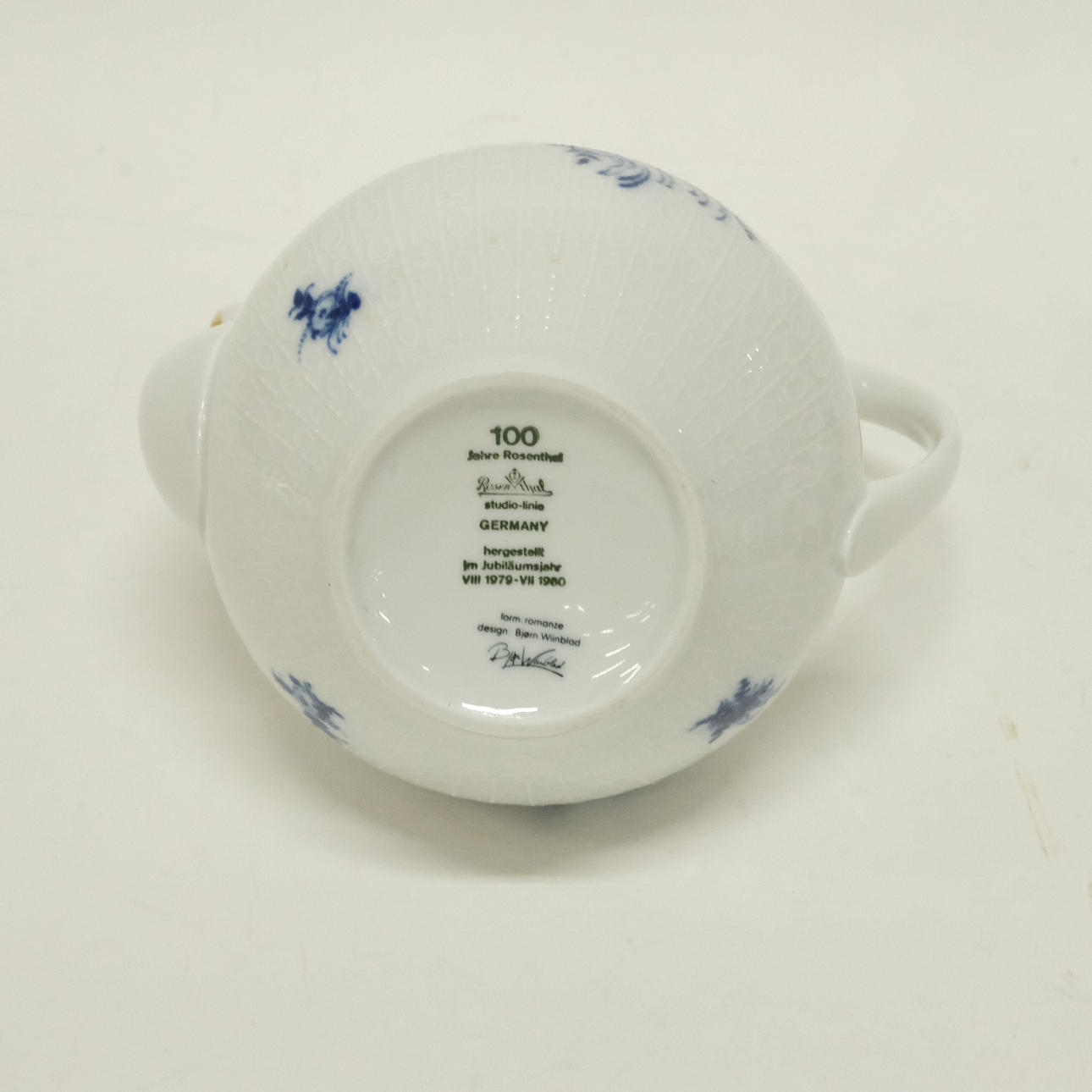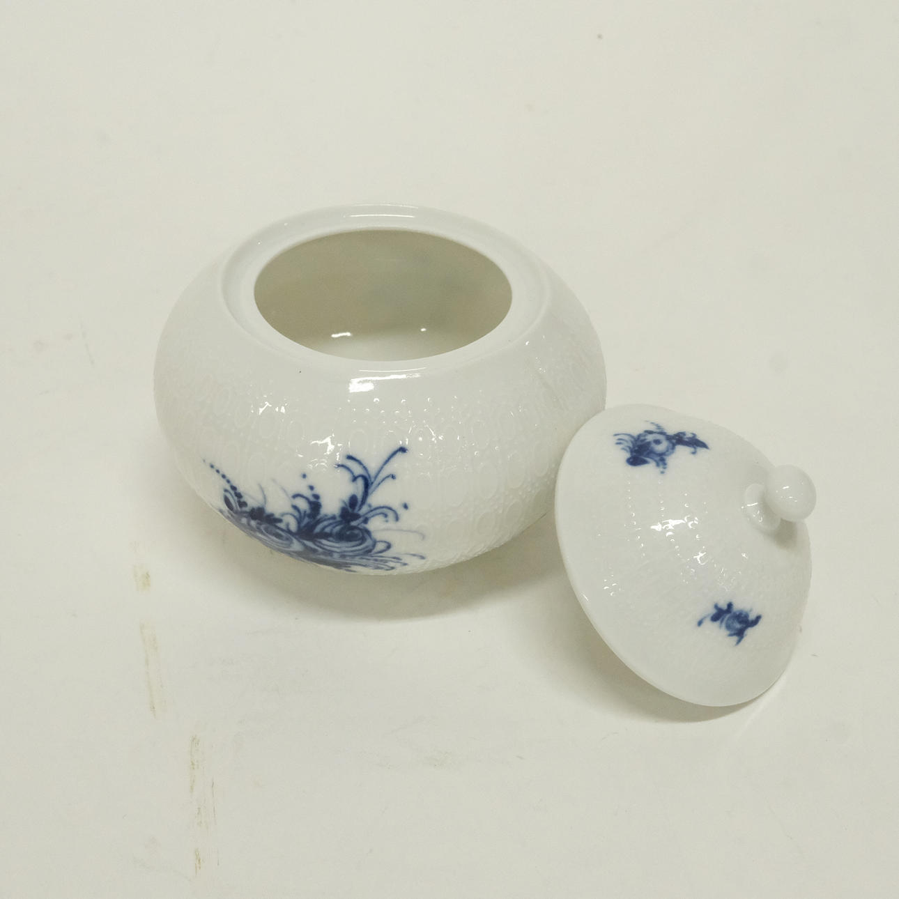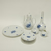 Kaffekanna, höjd 24 cm, sockerskål, höjd 9 cm, gräddkanna, höjd 9 cm, fat, diameter, 27,5 cm, 6 assietter, diameter 17 cm samt vas, höjd 25 cm.