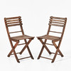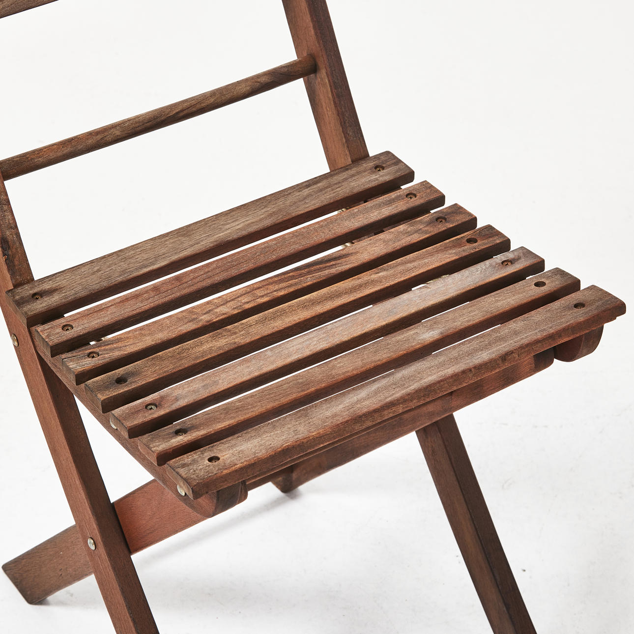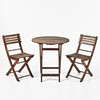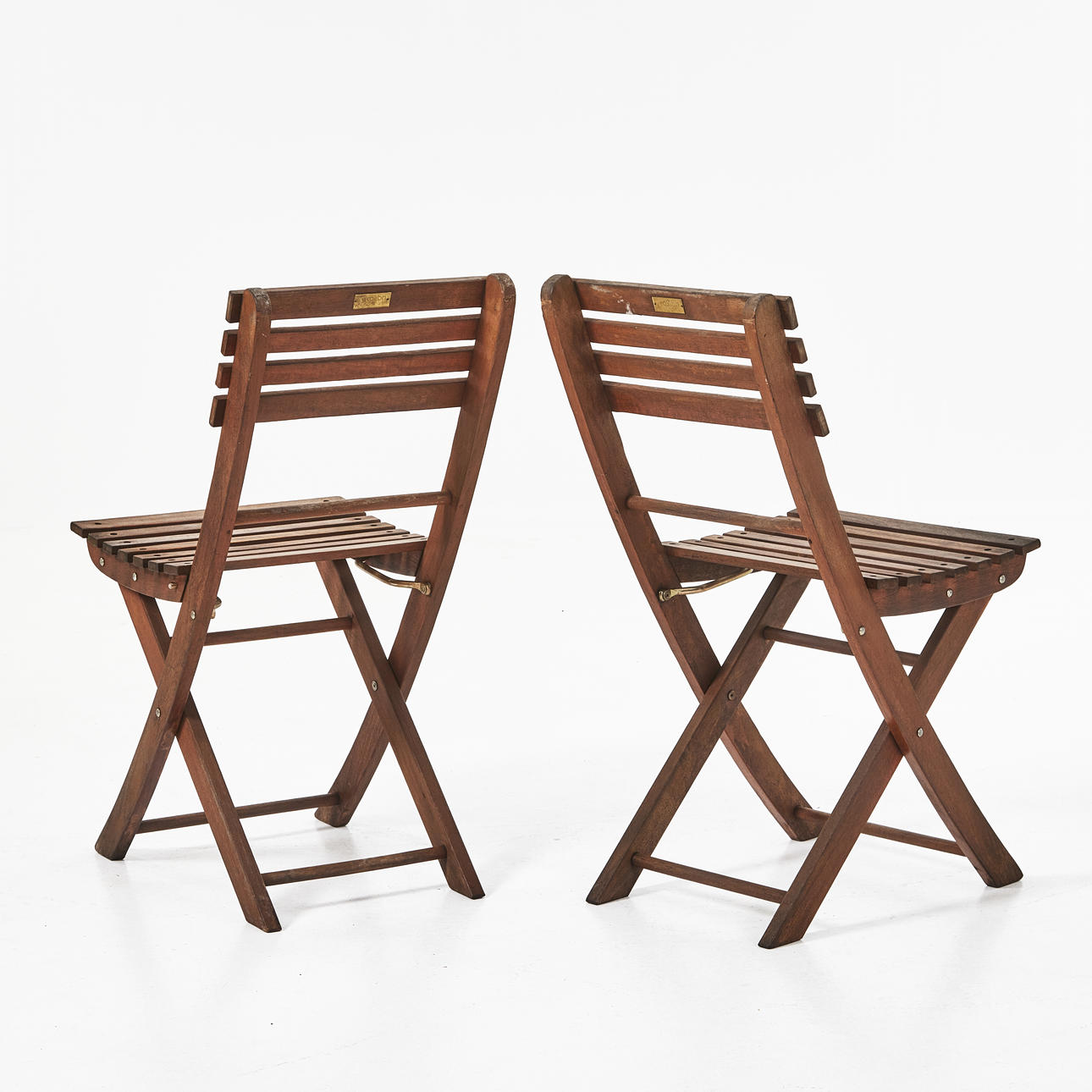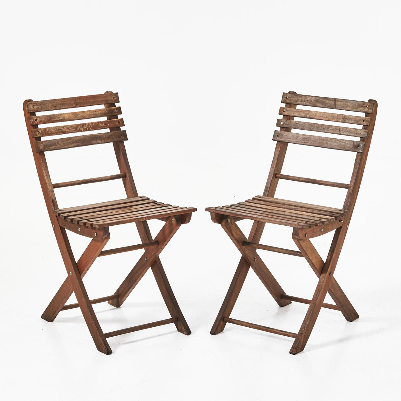 Bestående av bord och två stolar, samtliga delar fällbara, bordets höjd ca 74, diameter 70, sitthöjd 45, rygghöjd 78 cm.