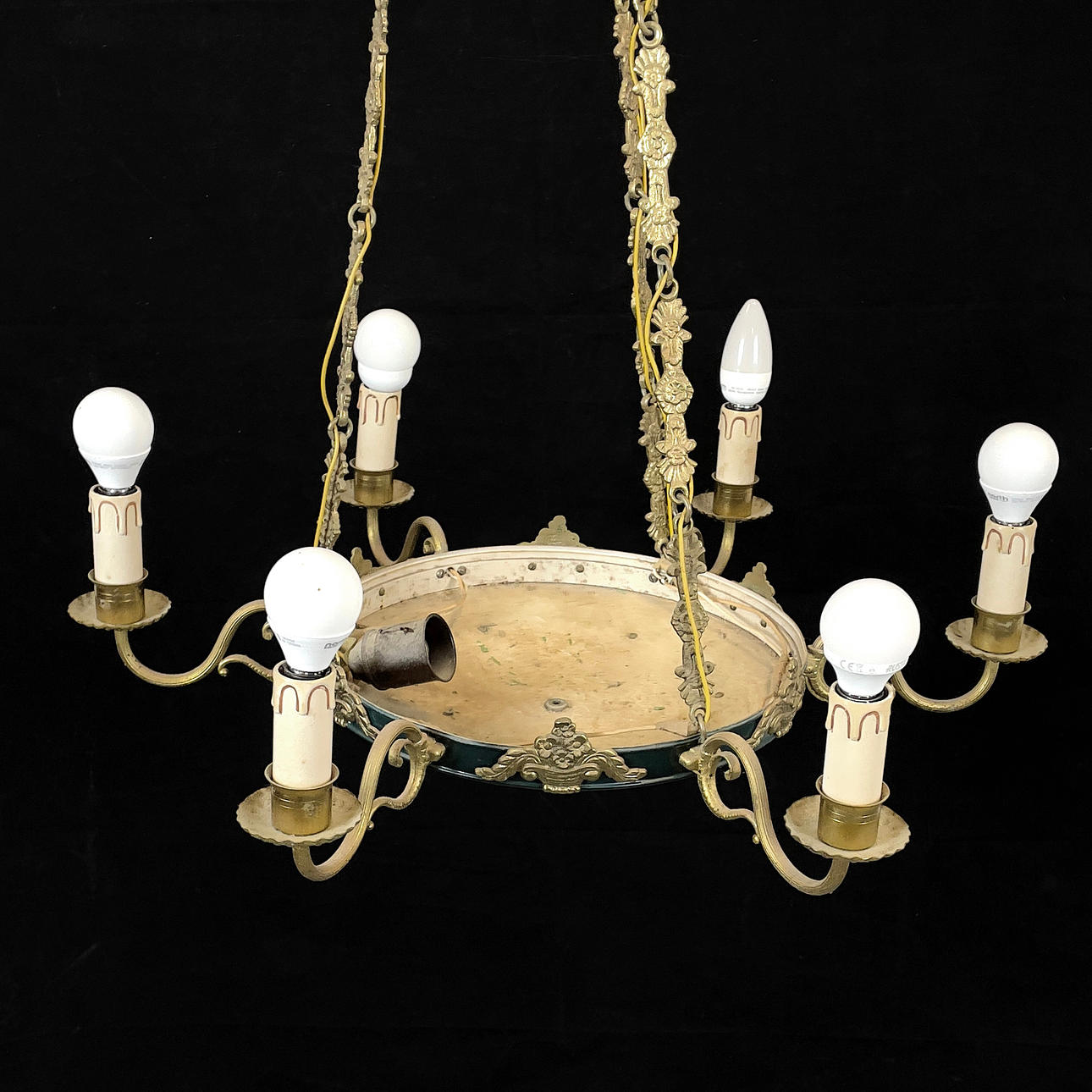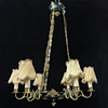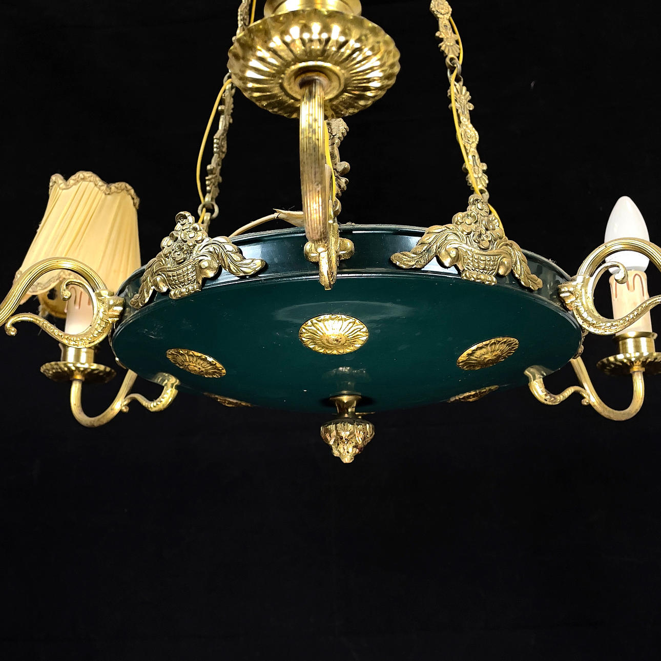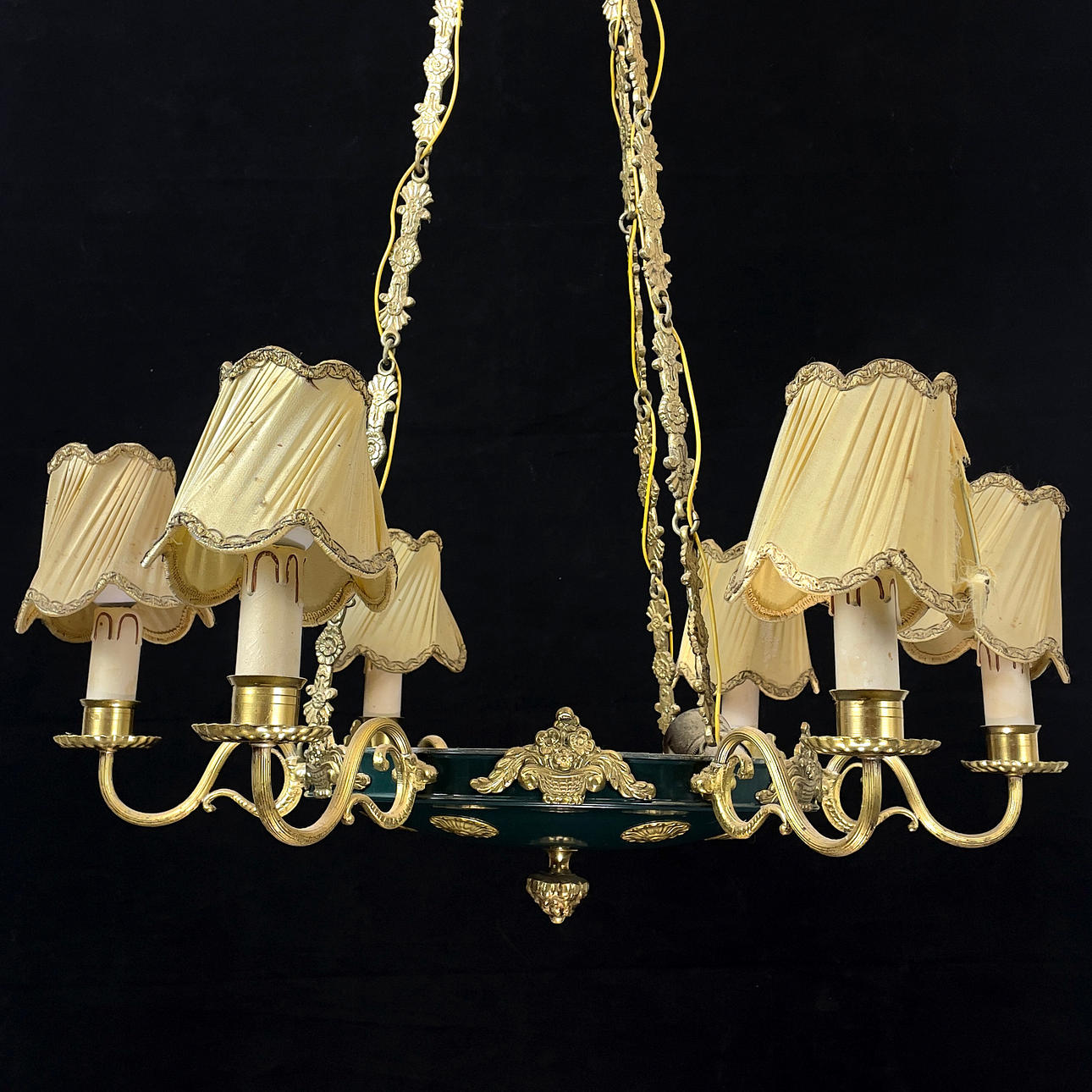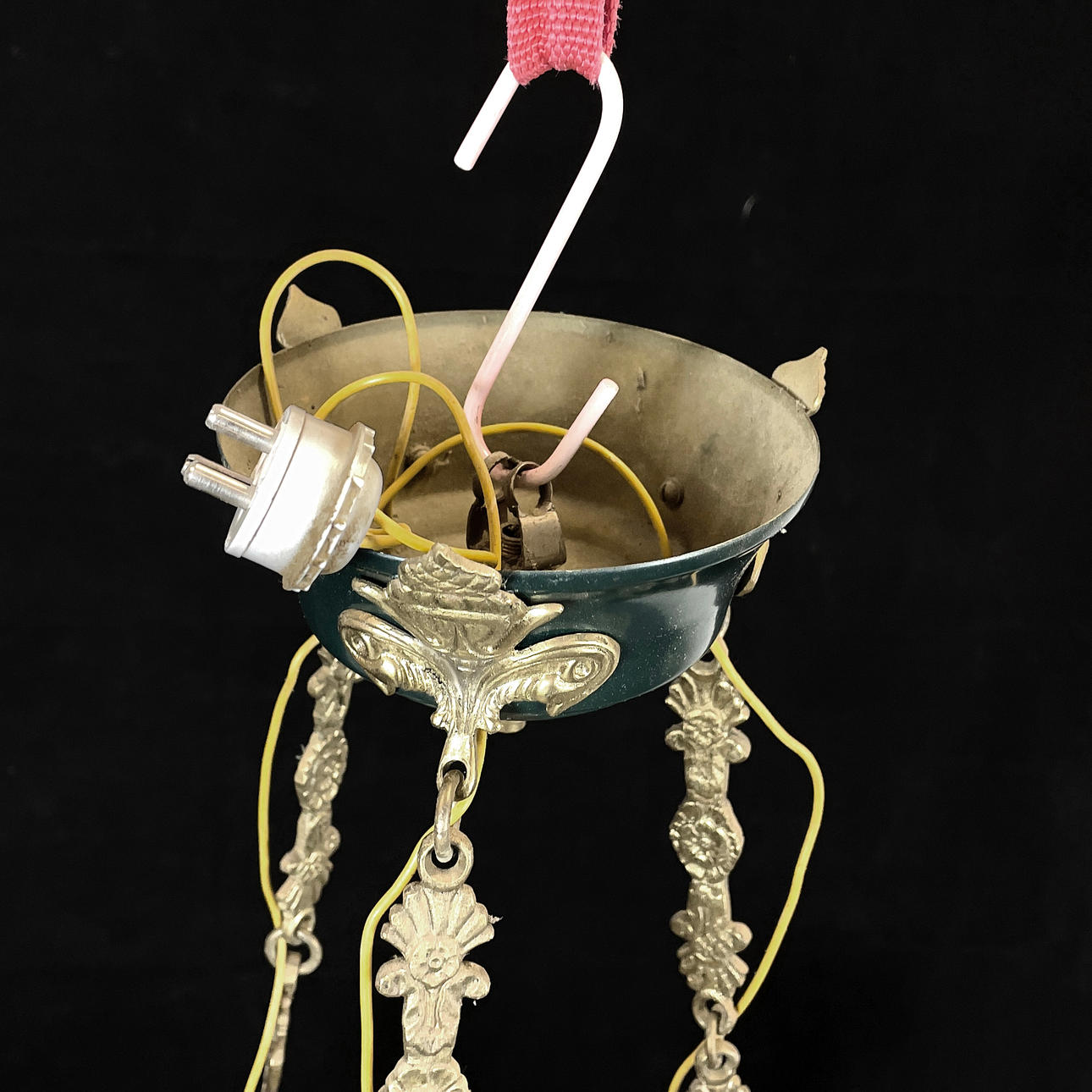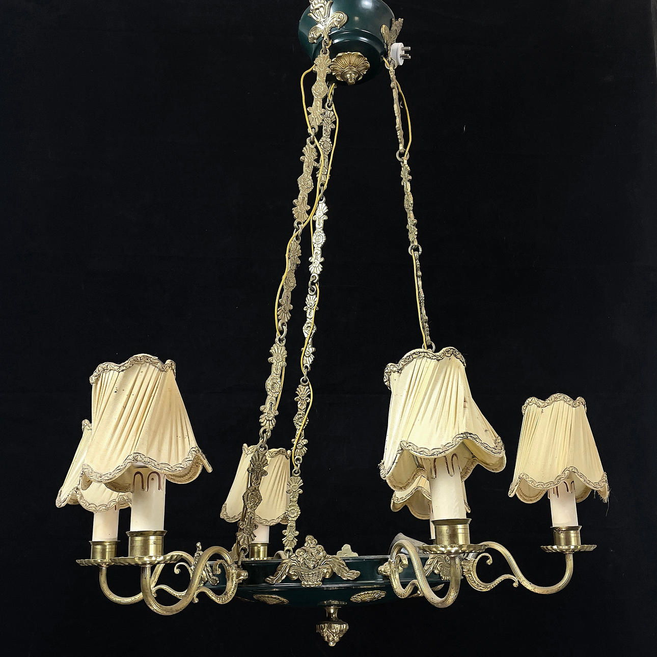 Stomme i mässing och grönlackerad plåt. Sju elektriska ljuspunkter. Skärmar i textil.