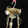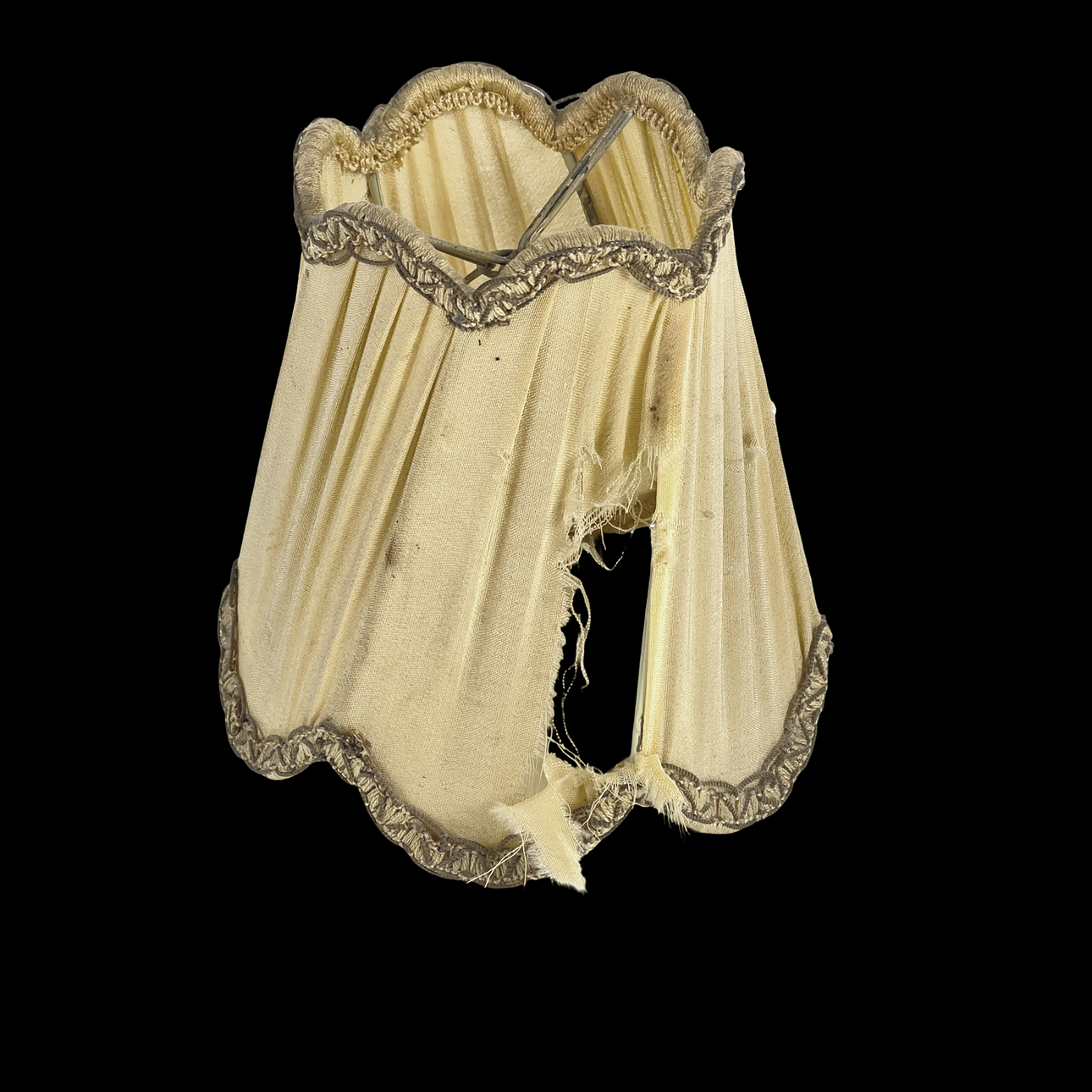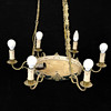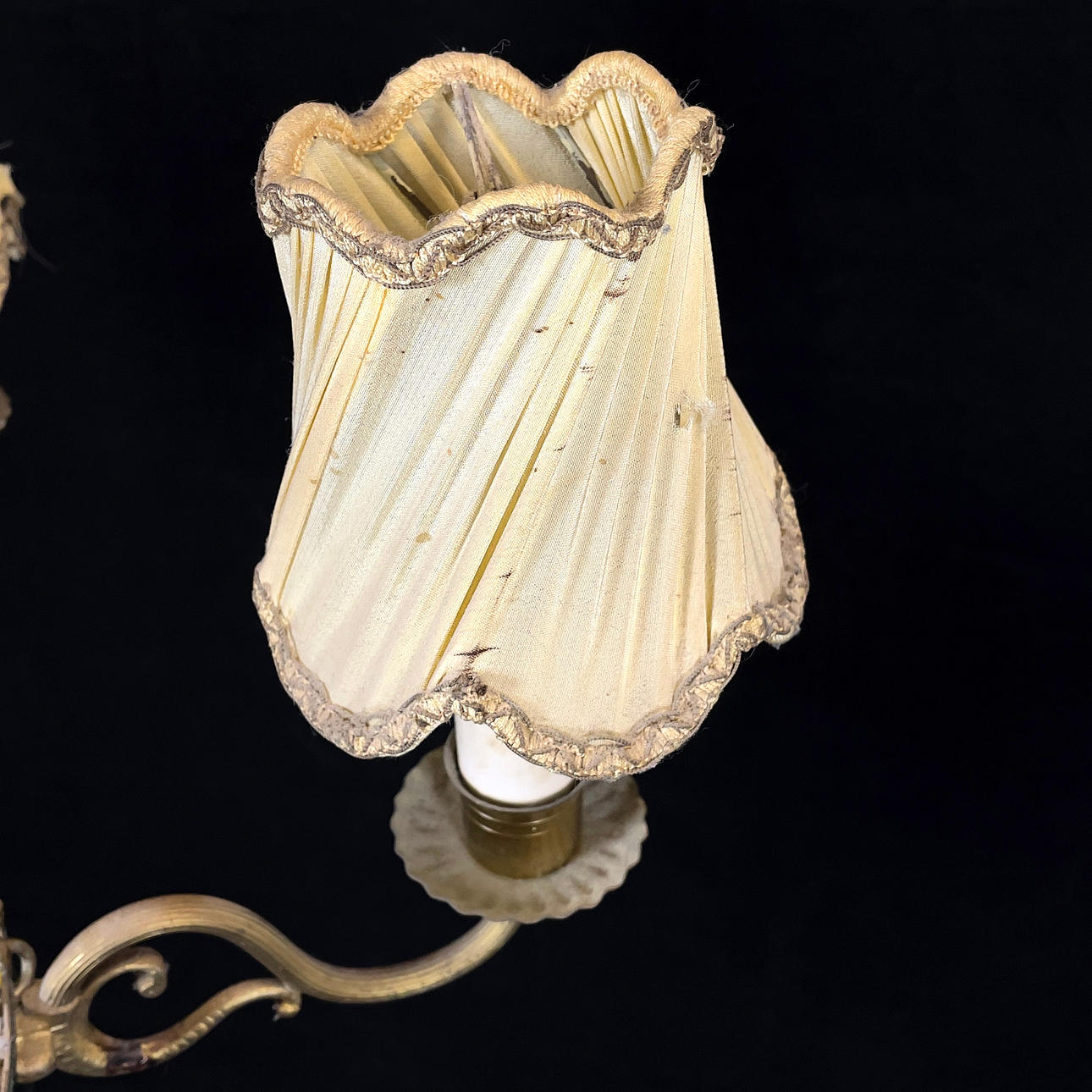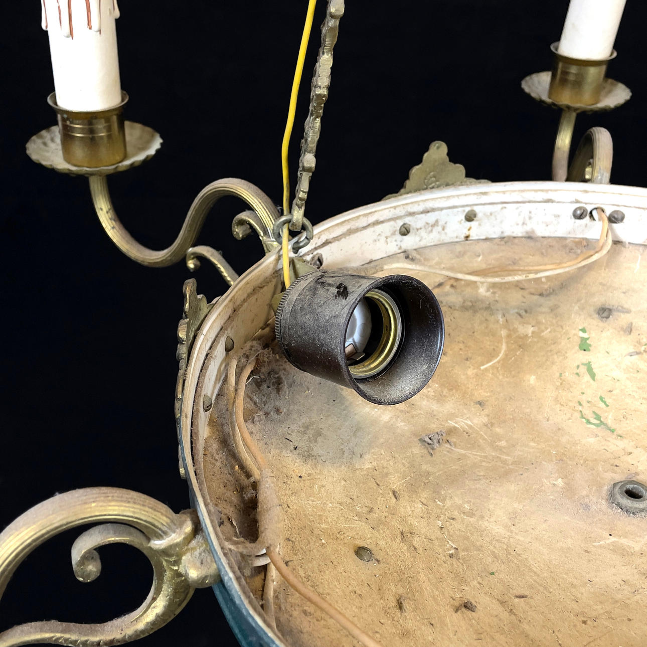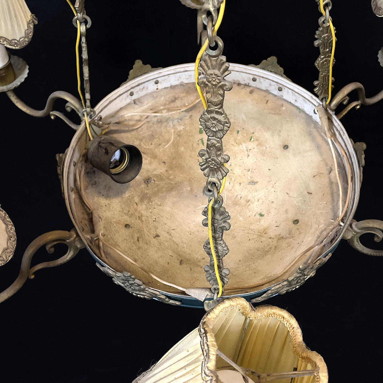 Stomme i mässing och grönlackerad plåt. Sju elektriska ljuspunkter. Skärmar i textil.