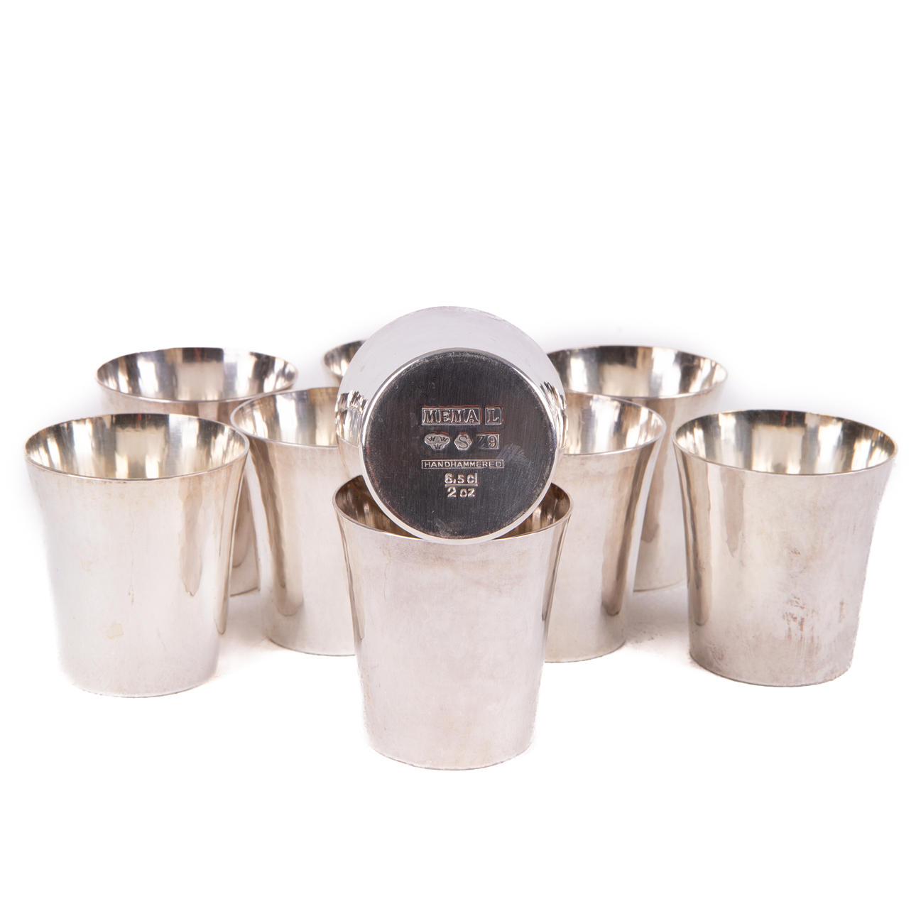 Supkoppar, 9 st, stämplade MEMA (Mema Guld & Silver Ab, Lidköping)årtalsmärkta Z9 (1979). Vikt 363 gram 925 silver.
