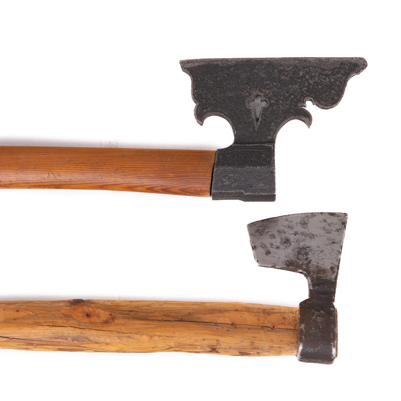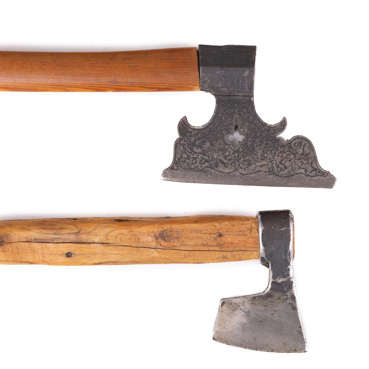 Yxor, 2 st. En med yxhuvud i gjutjärn, möjligen sent 1800-tal/tidigt 1900-tal med senare skaft.
