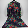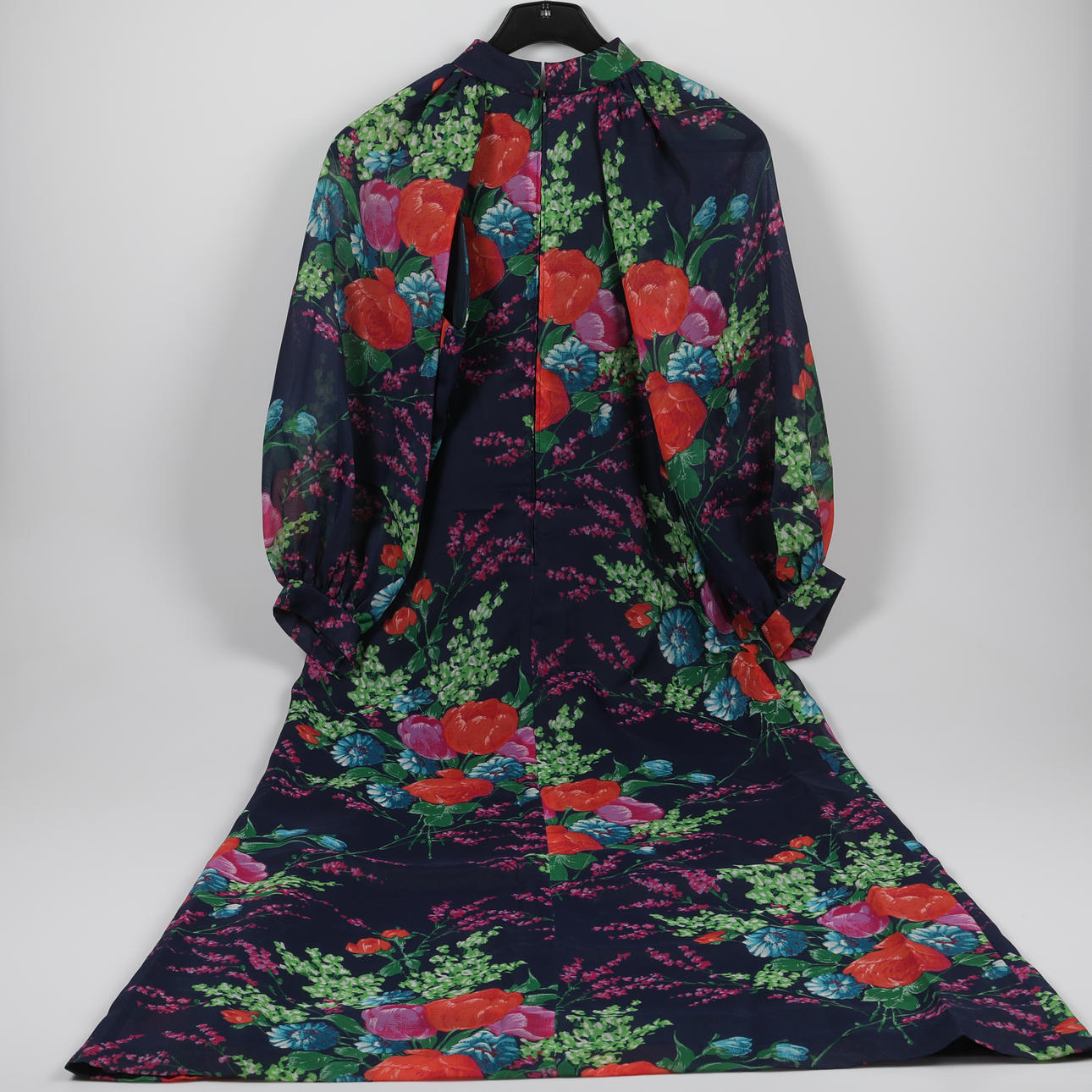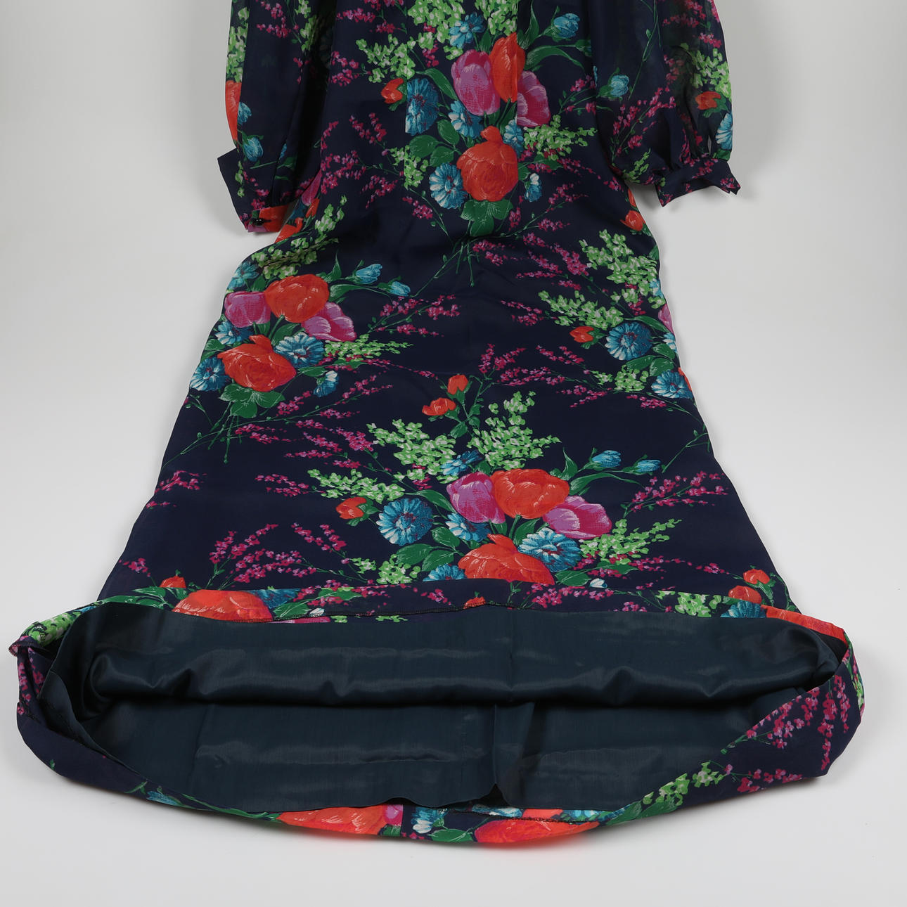 Långklänning, marinblå med blommotiv, med ärmar i chiffong, påsydda i överkant på axeln, veckad halslinning med liten rullkrage, fodrad kjoldel