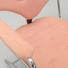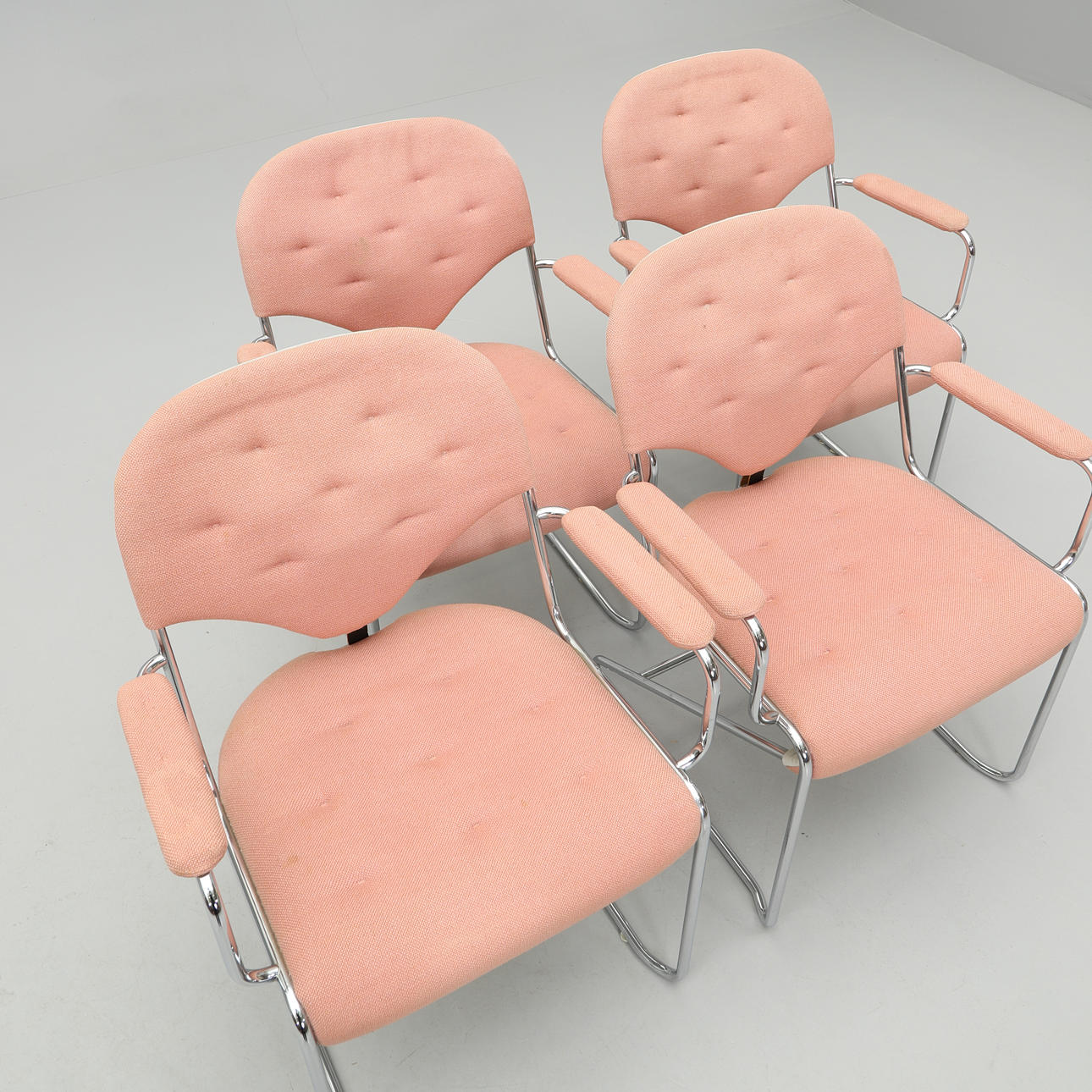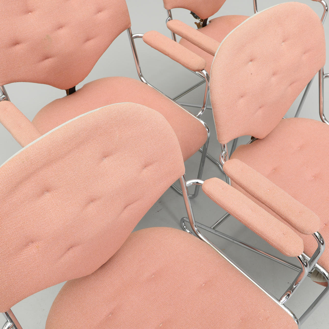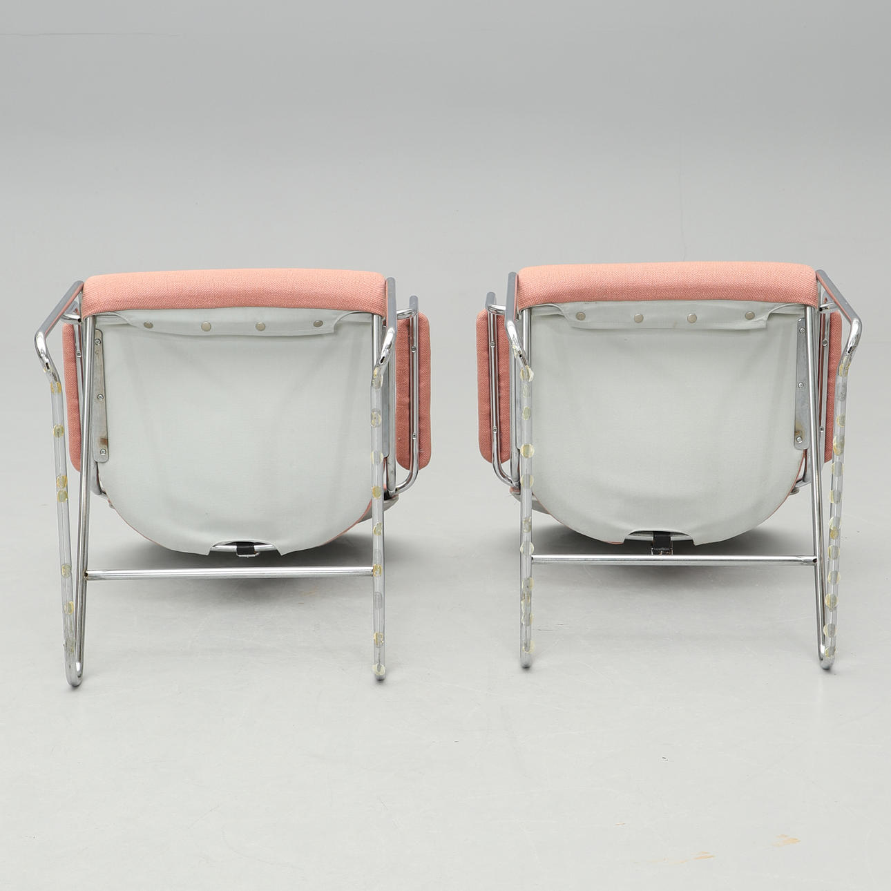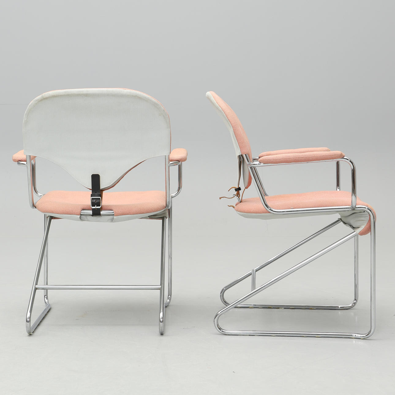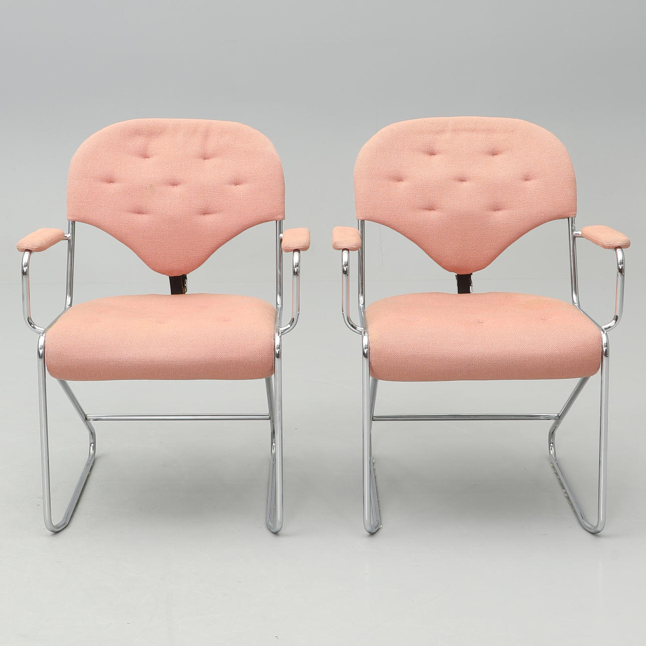 Underrede i kromat stål. Stoppad och textilklädd sits och rygg. Bredd 63, djup ca 55, rygghöjd 83, sitthöjd ca 45 cm.
