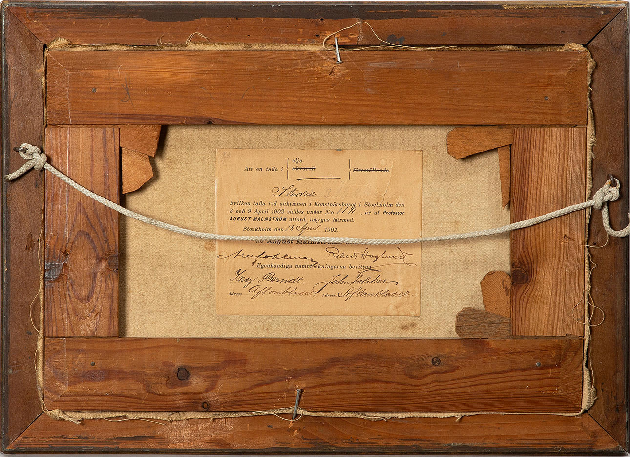 Med etikett a tergo från August Malmströms sterbhus där målningen intygas den 18 april 1902 vara såld vid auktionen i Konstnärshuset i Stockholm den 8 och 9 april 1902 under no. 112.