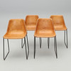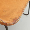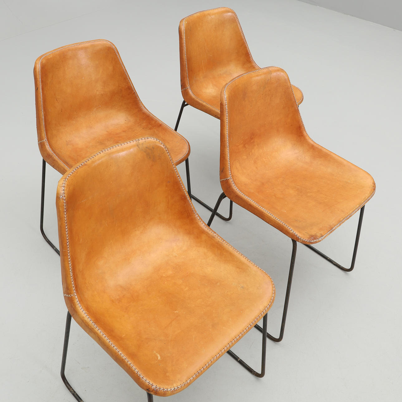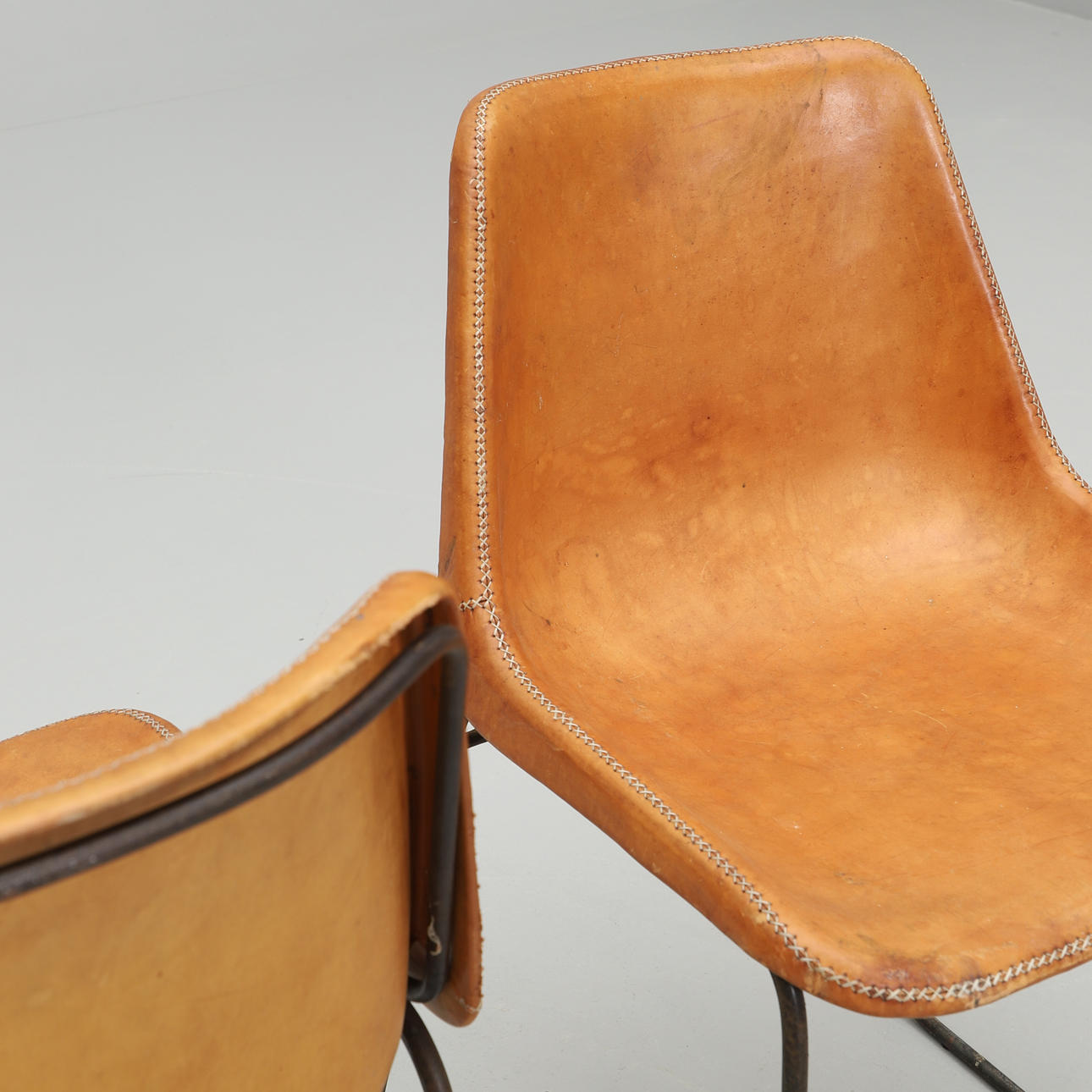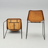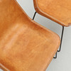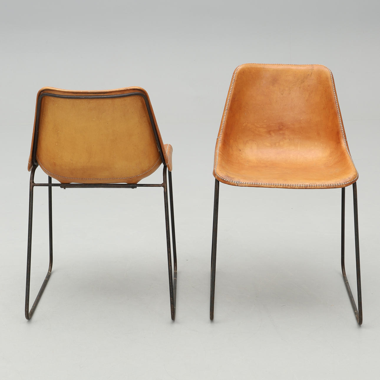 Stapelbara. Benställning i svartlackerad metall, sittskål i cognacsfärgat läder. Märkta under sits.