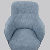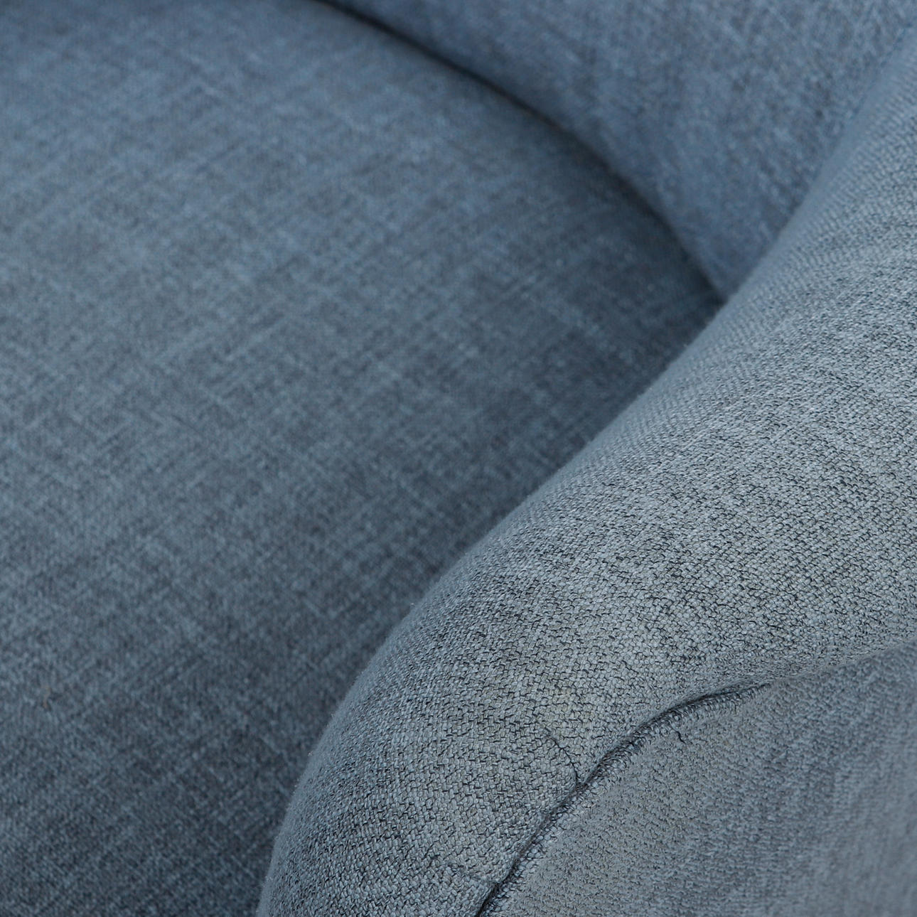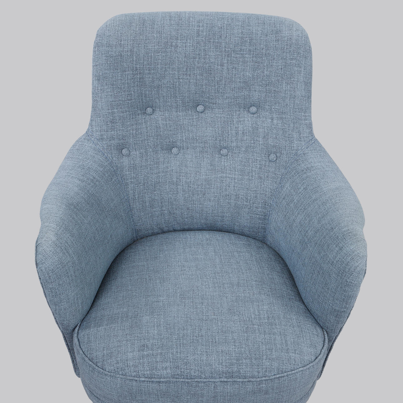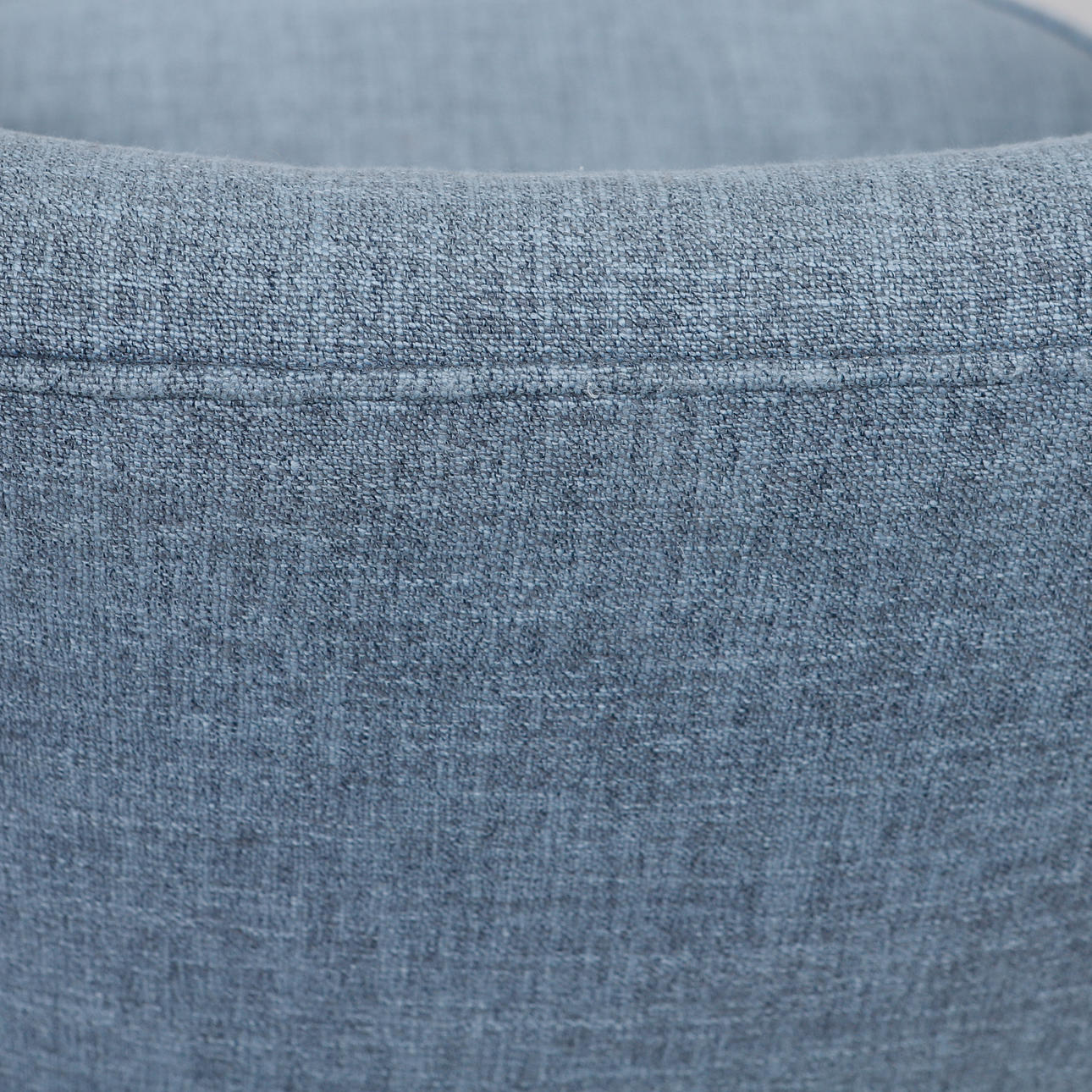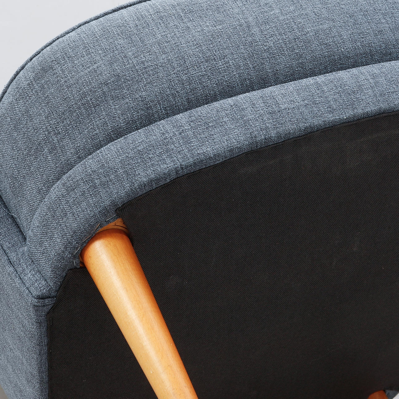 Blå textilklädsel på ben av bok. Brickmärkt. Bredd ca 72 cm, sitthöjd ca 40 cm, rygghöjd ca 84 cm.