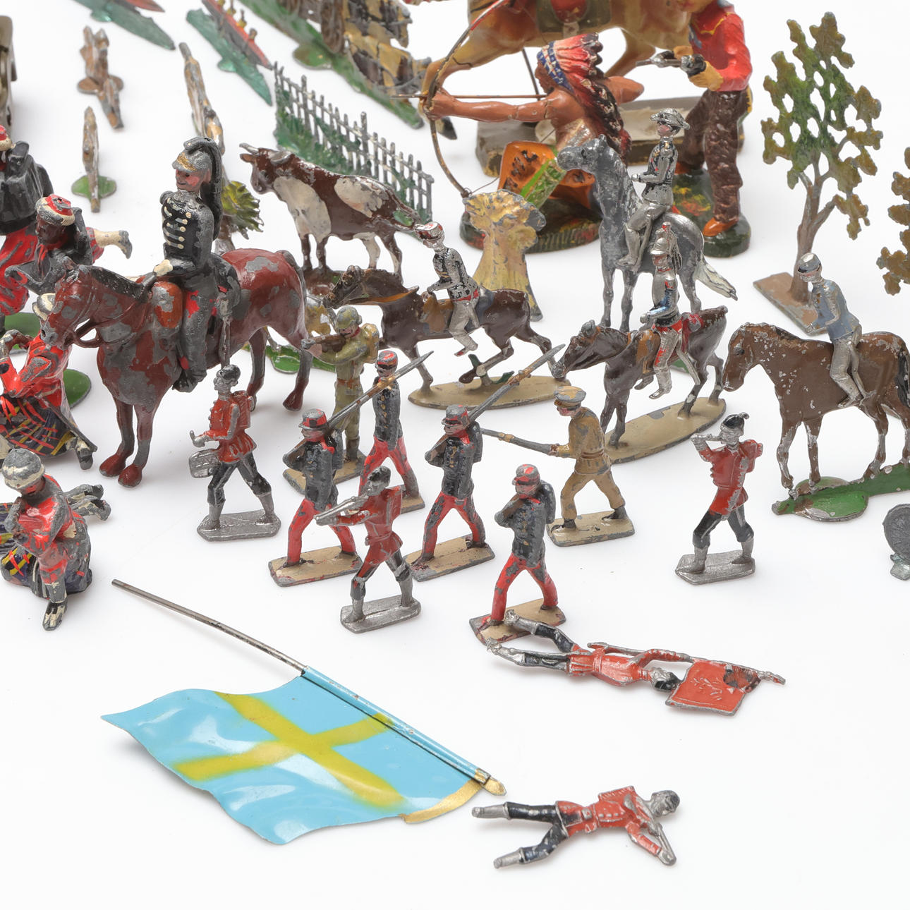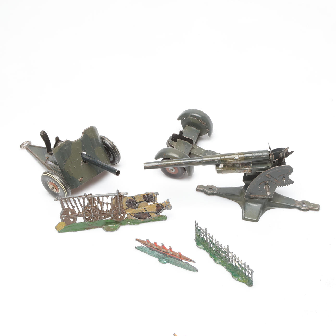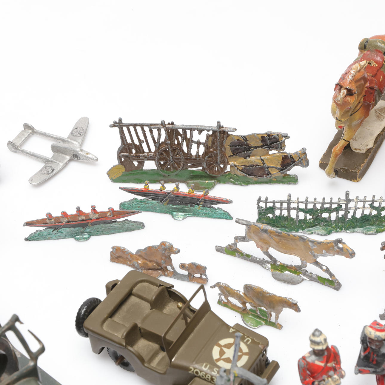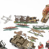 Bl.a. jeep/bil, kanoner, hästar, soldater m.m. Största bilens mått ca 17x9x5 cm.