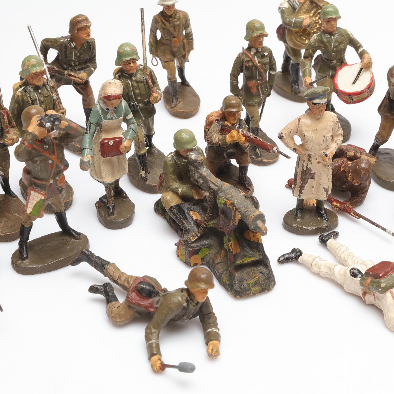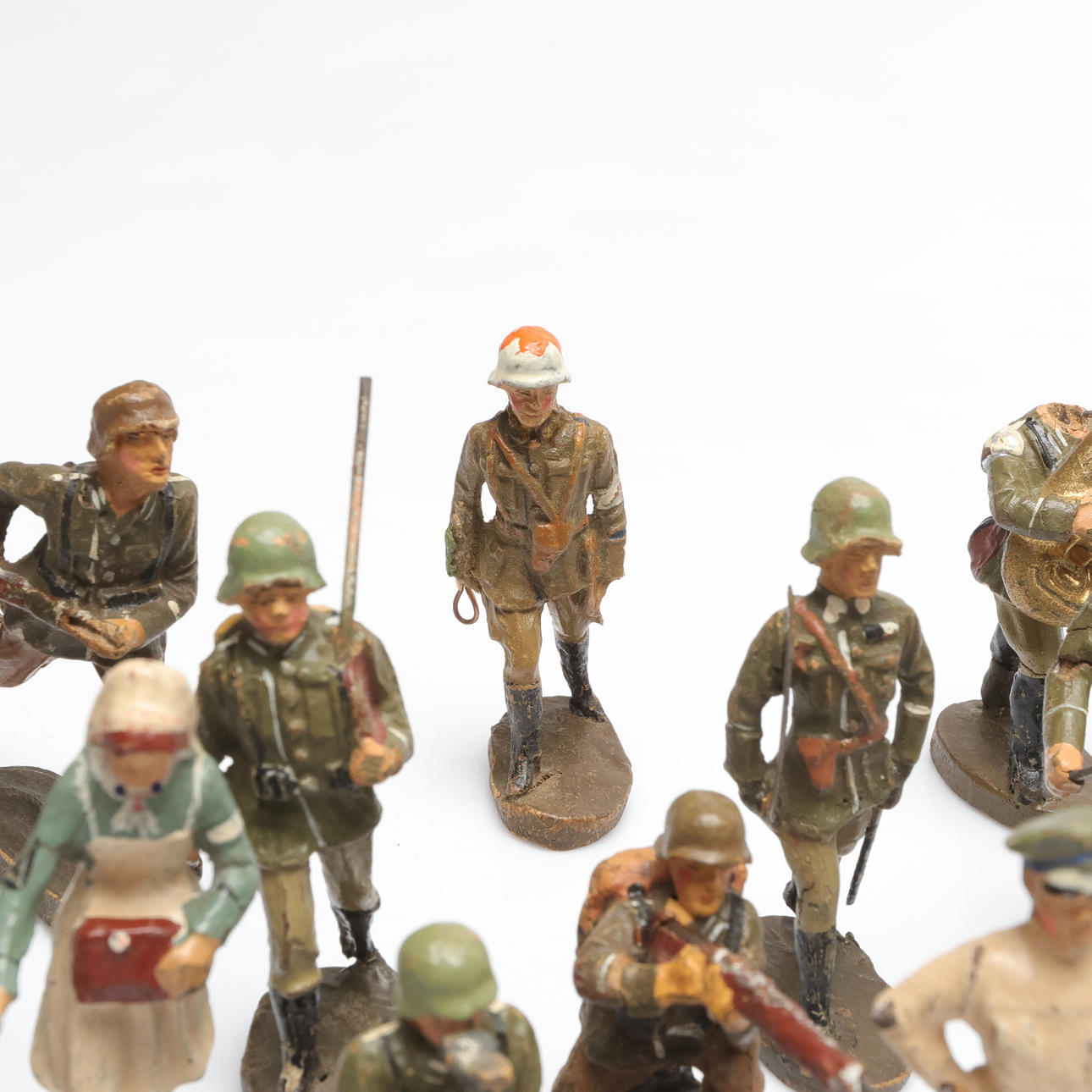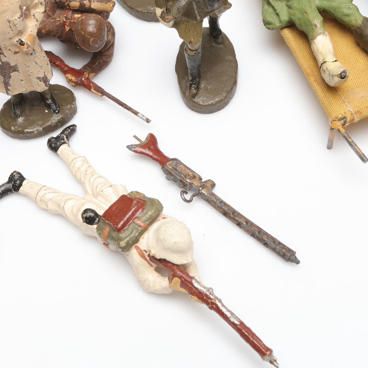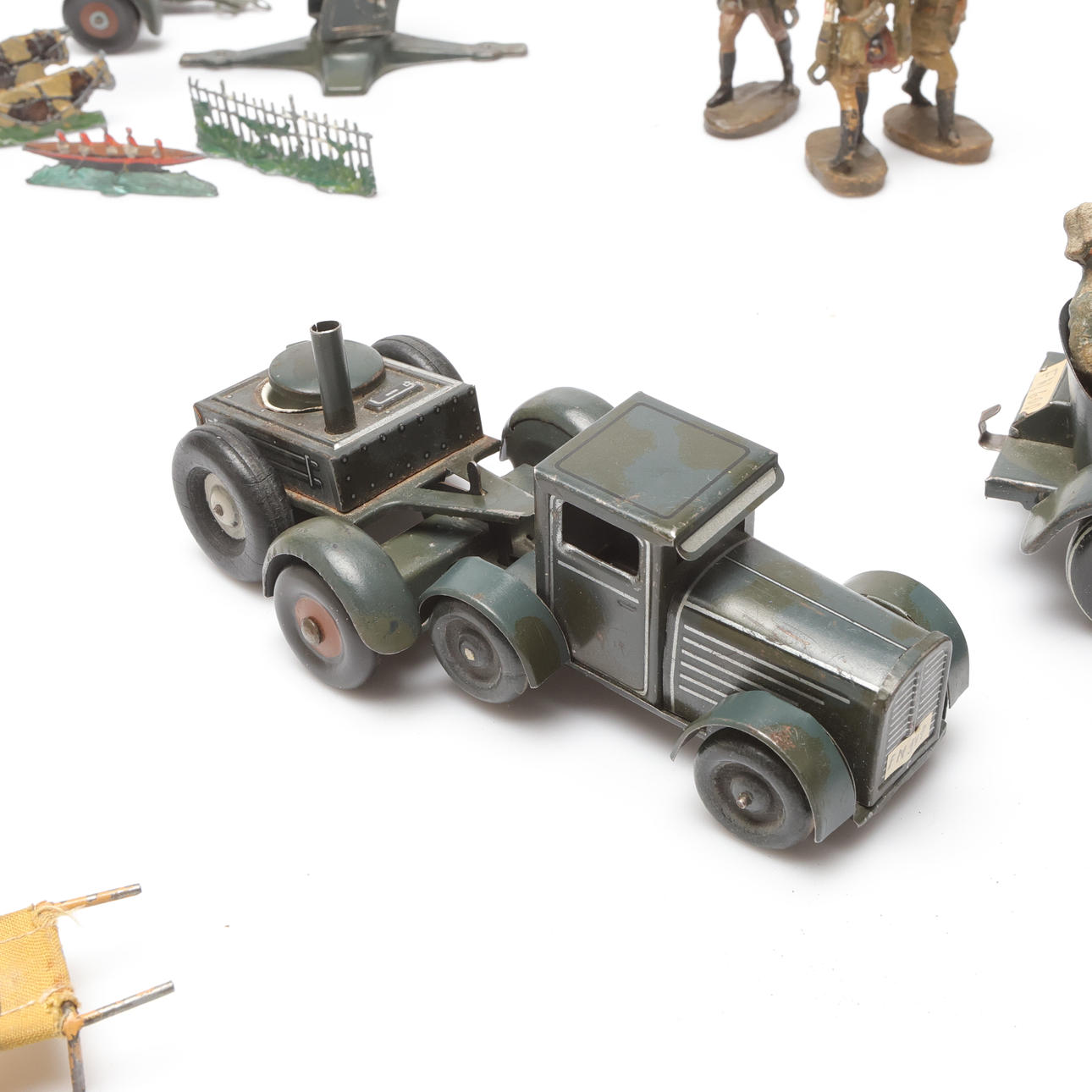 Bl.a. jeep/bil, kanoner, hästar, soldater m.m. Största bilens mått ca 17x9x5 cm.