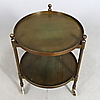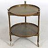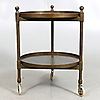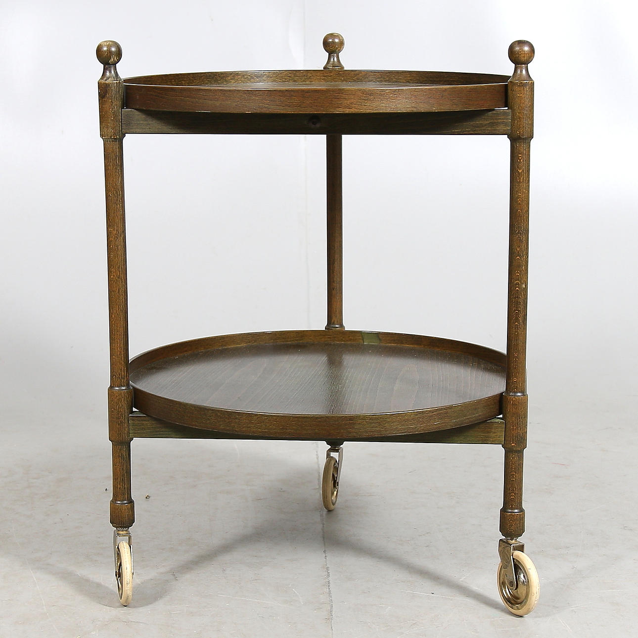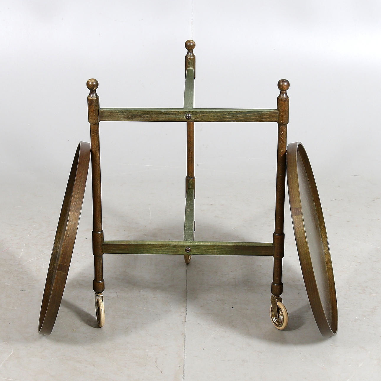 Grön betsad trä, 2 st. lösa brickor, står på tre hjul, diameter 52, höjd 69 cm.