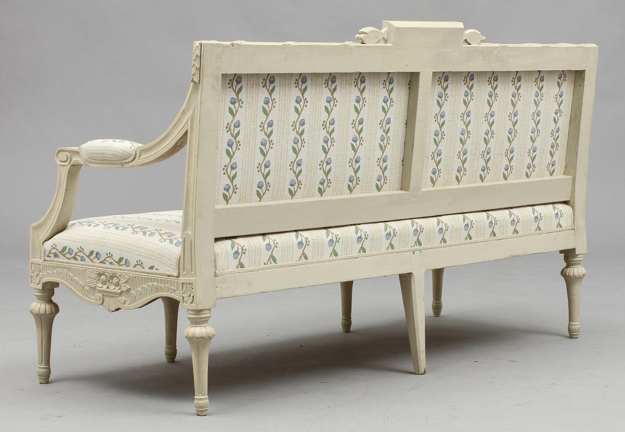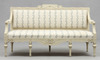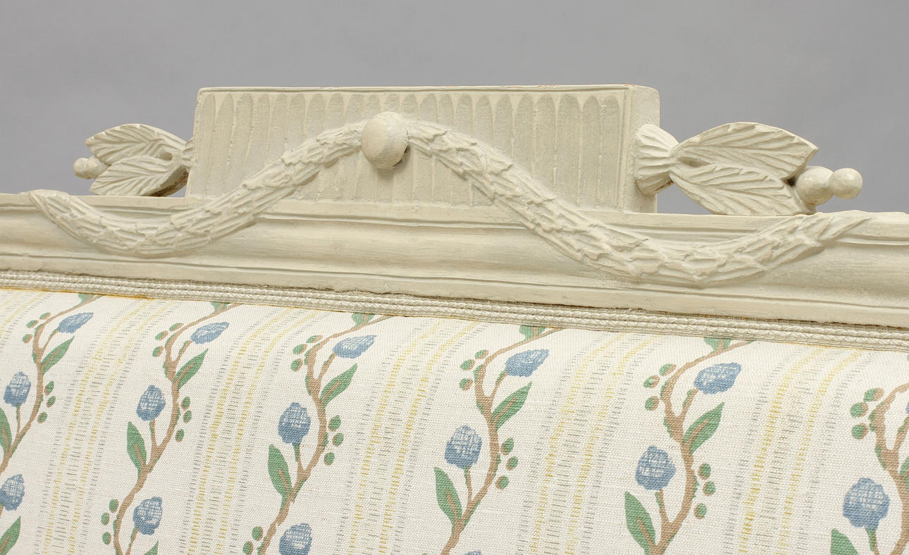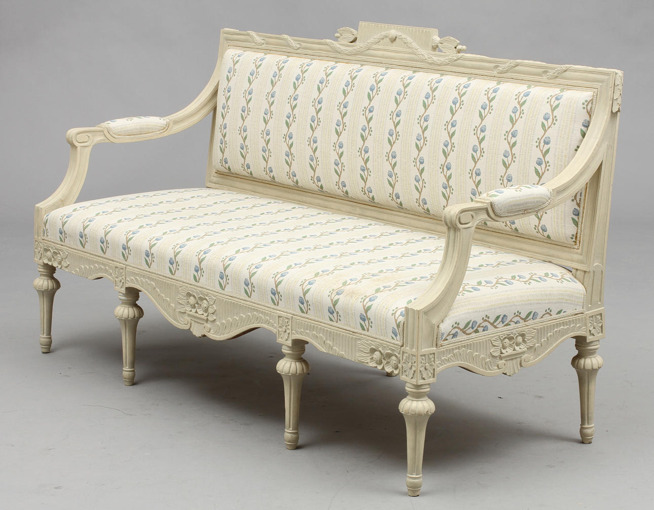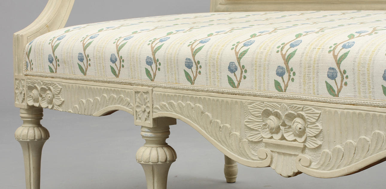 Vitlackerad. Utskuren dekor av bl a blommor. Stoppad sits med dekor av blommor. Längd 160 cm.