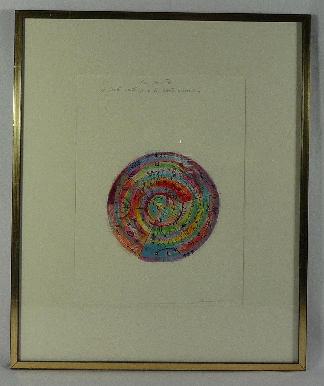 Krita och bläckpenna på handgjort papper. Med titeln ovan ”La sorte/... sorte, sorte! e la Sorte Vienne ”. Signerad nedre högra ”Cursarov”, (möjligen Enzo Cursaro?). 37 x 27 cm; monterad och inramad under glas.