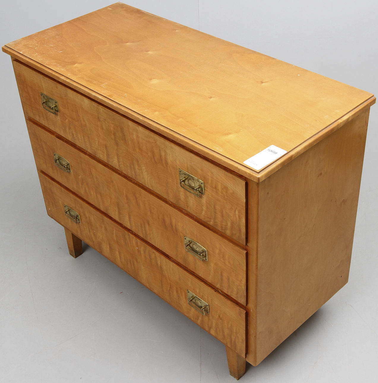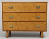 Björk, rak form med tre lådor, beslag av mässing. Längd 94, bredd 42, höjd 75 cm.