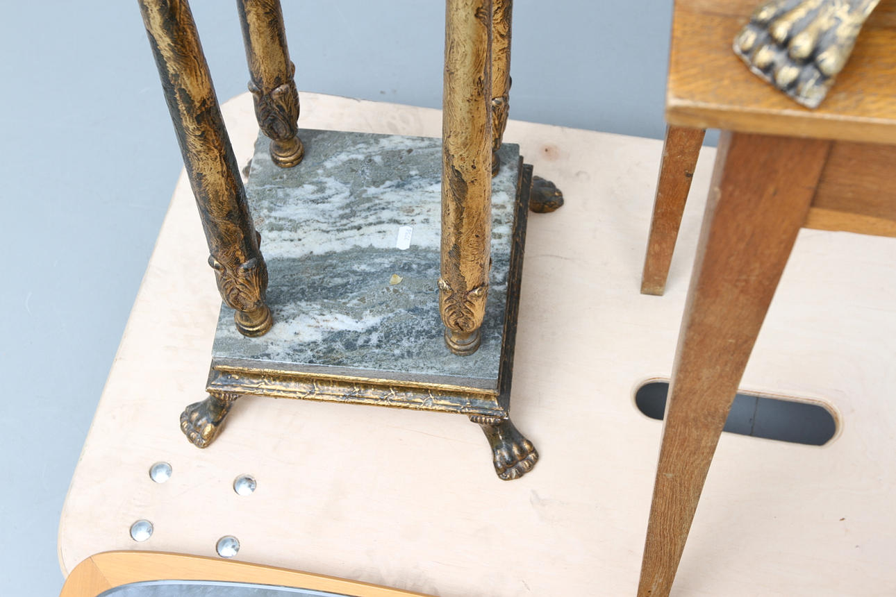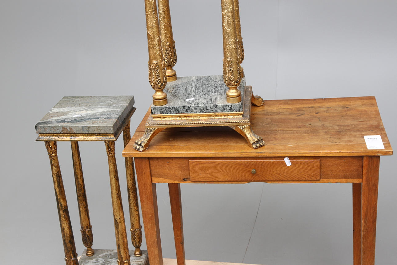 Förgylld piedestal med marmorskiva. Höjd 70 cm.