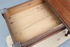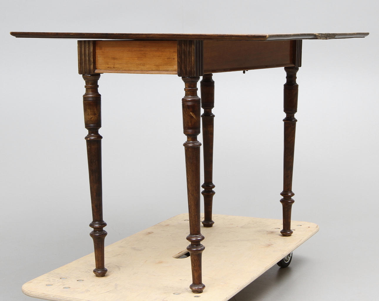 Valnöt/björk, uppfällbar och vridbar skiva. Längd 87, bredd (uppfälld) 80, höjd 75 cm.