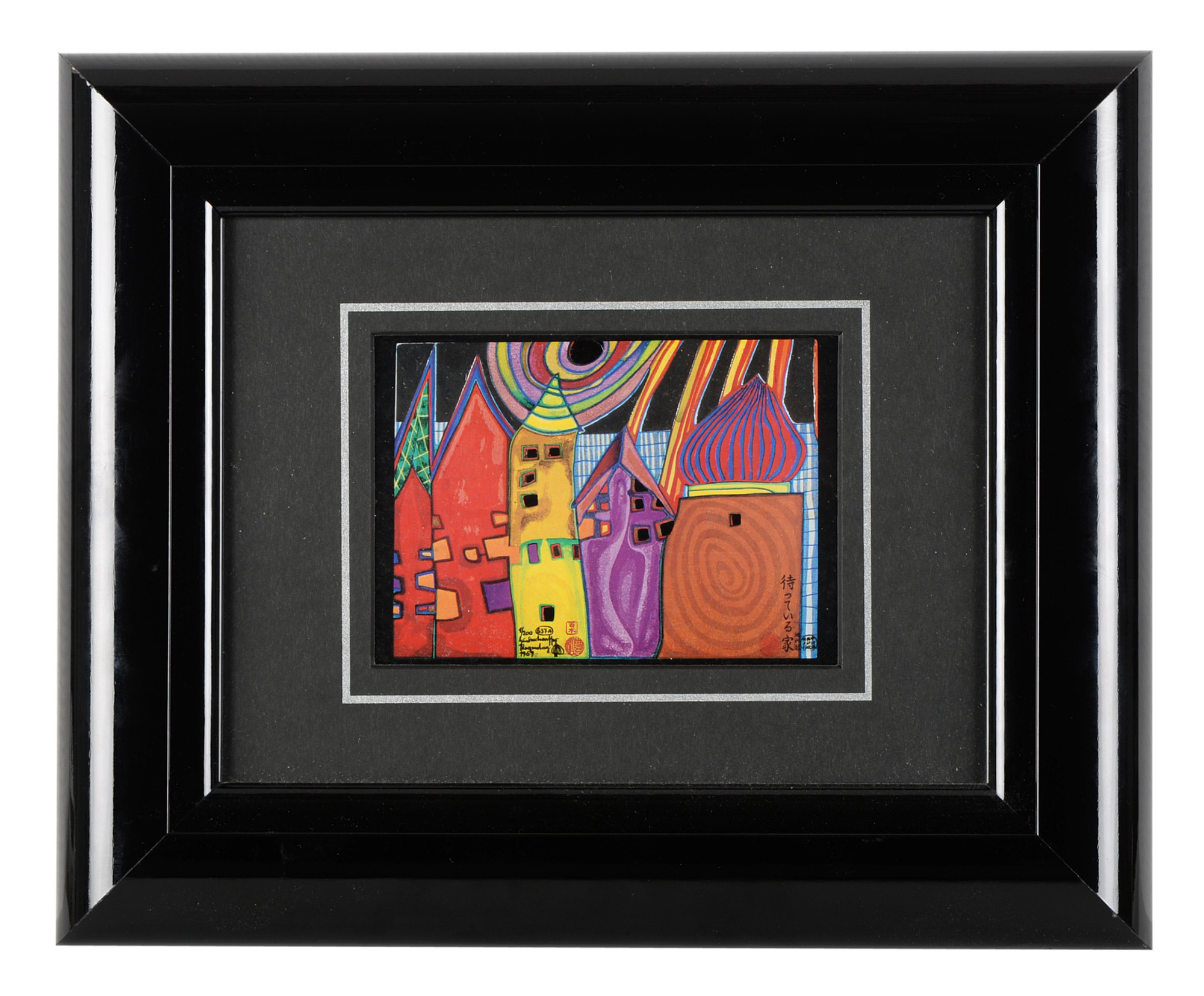 510216. FRIEDENSREICH HUNDERTWASSER. ” Solen ovanför raden av hus.”.