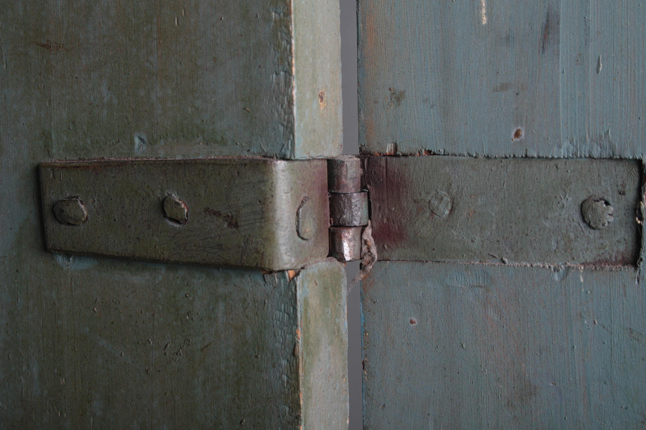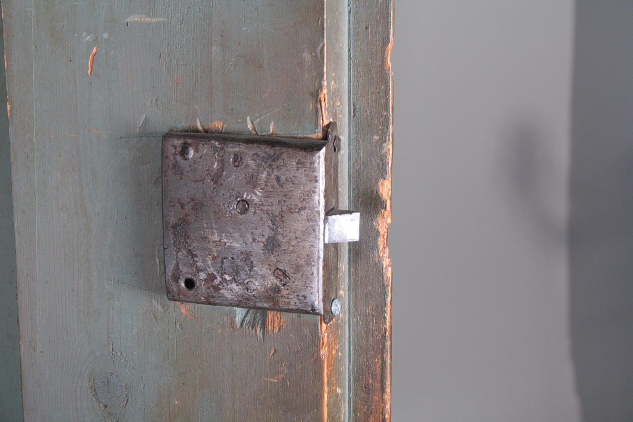 Åldersrelaterat slitage. sprickor, nötningskada från nyckel på dörr.