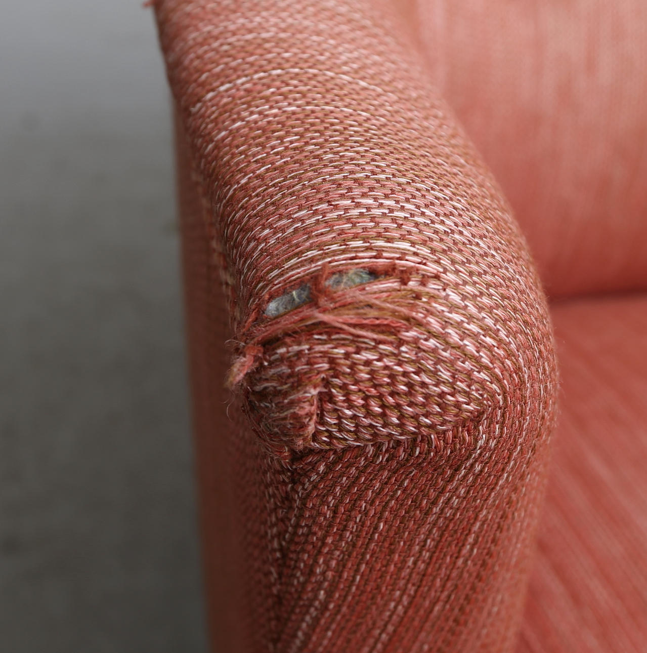 Skada på klädsel i hörn. Bruiksslitage.