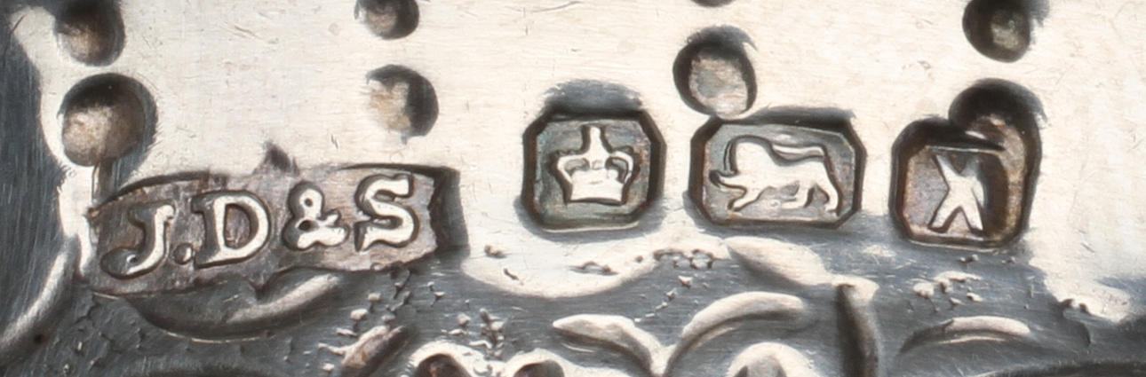 2 st pokaler, Chester England, 1900-tal, höjd 12,5 cm. Kanna, stmpl JD&S Sheffild, tot höjd ca 6 cm. Sked, stmpl London, längd 18 cm.