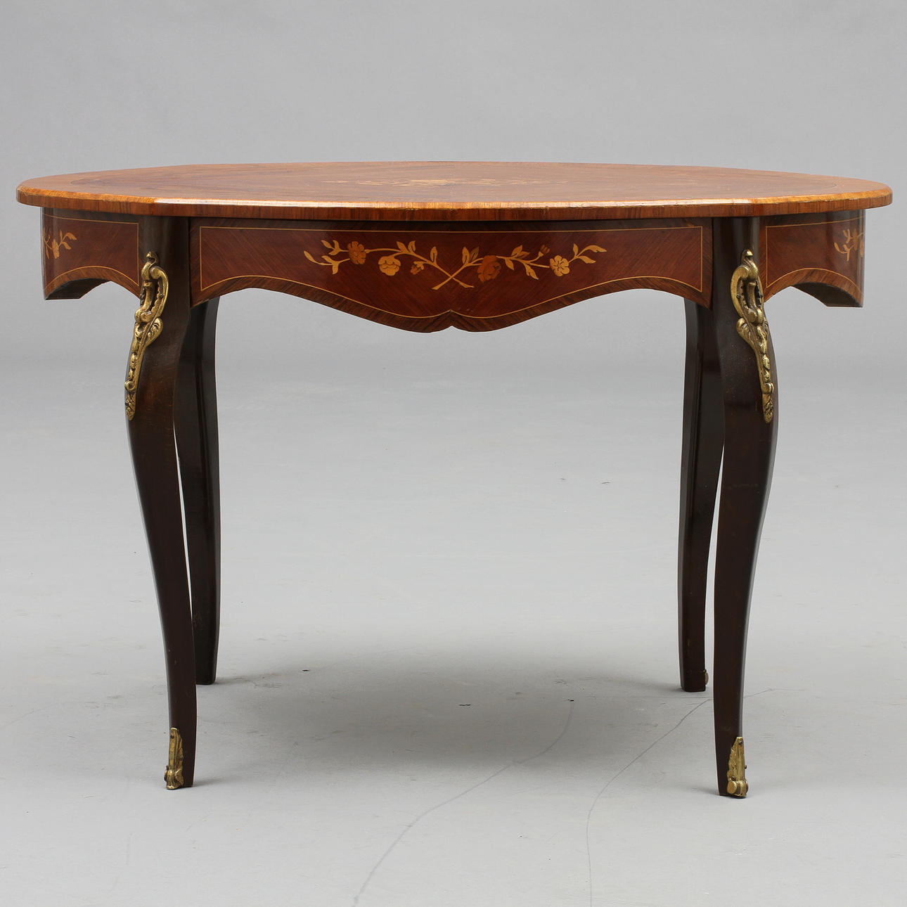 Med intarsia. Beslag i gulmetall. Längd 89 cm, bredd 60 cm, höjd 58 cm.