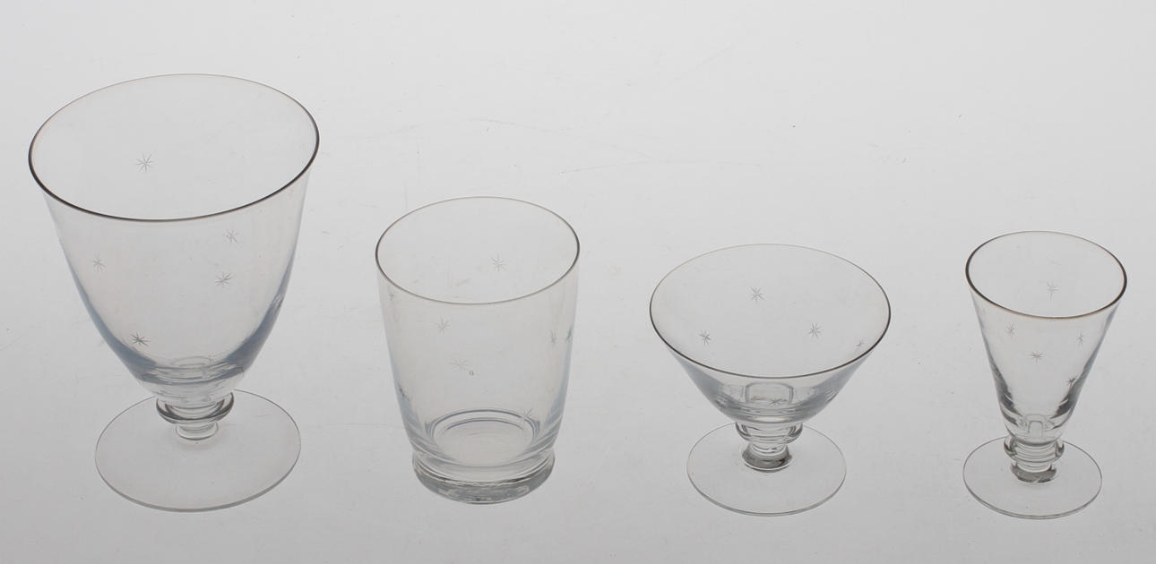 Etsad stjärndekor. 12 vinglas, 11 sherryglas, 11 likörglas, 10 selterglas.
